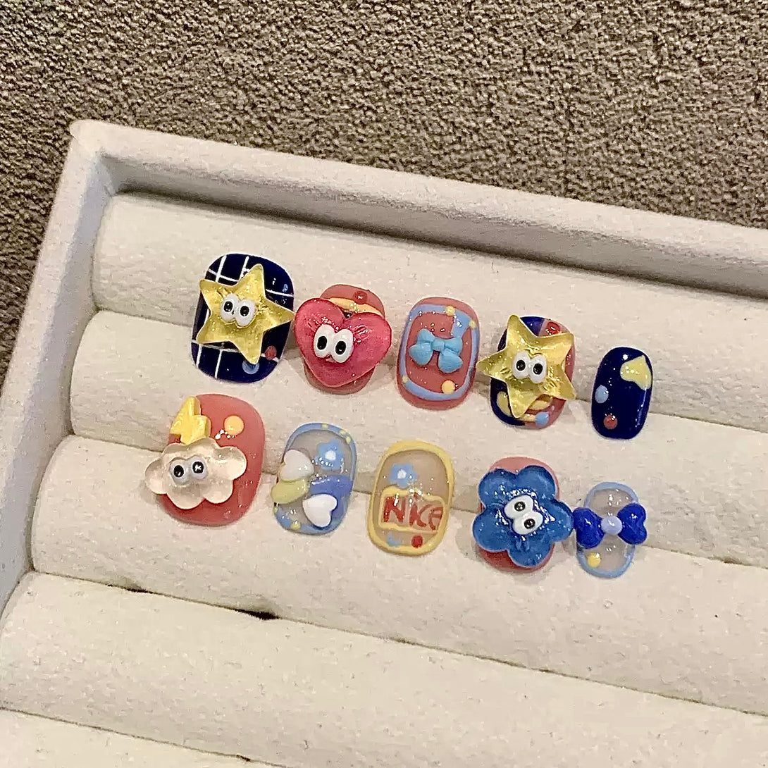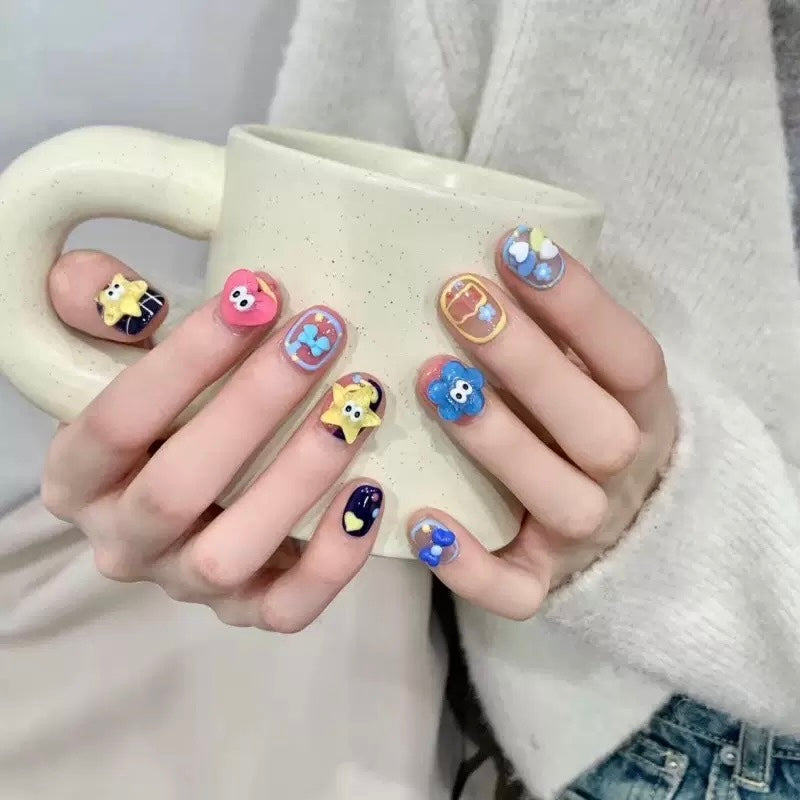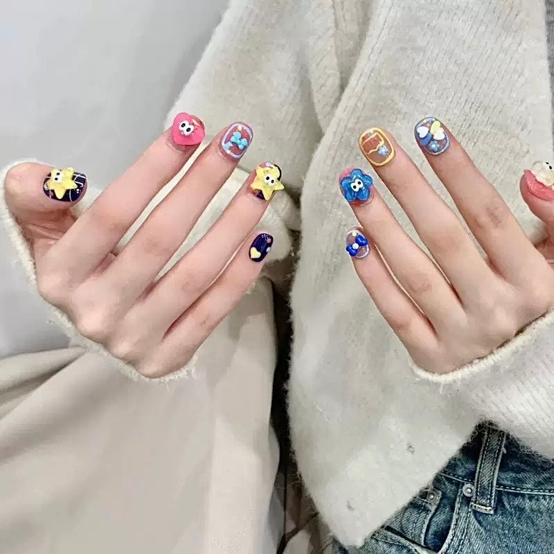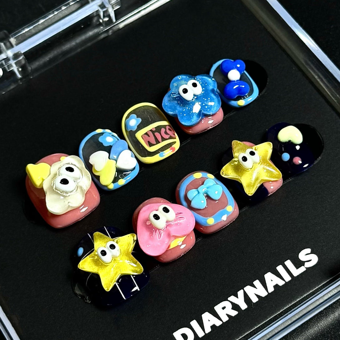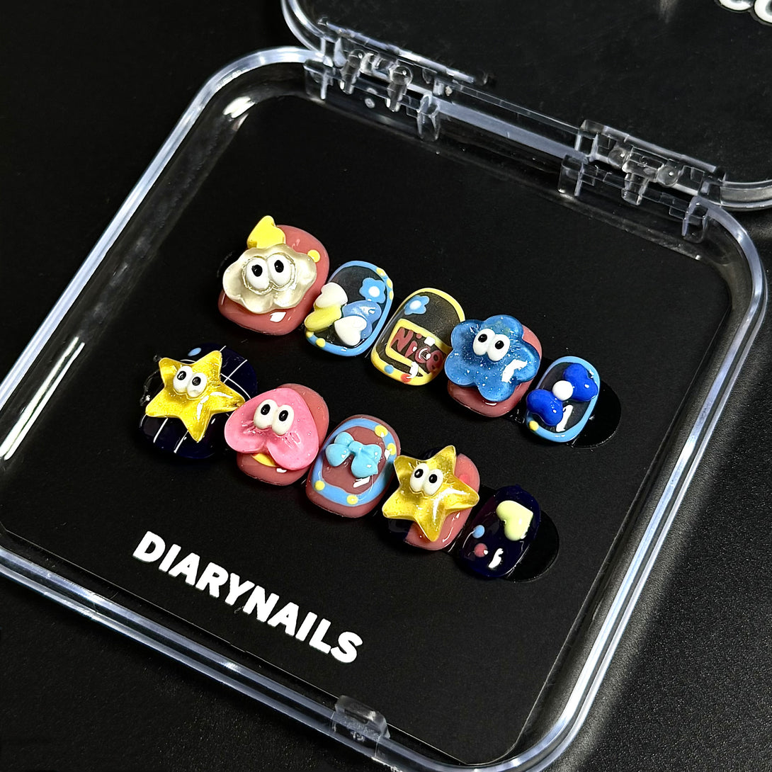 Starfish Fairy by Diary Nails is a set of press-on nails featuring adorable hand-sculpted stars, clouds, and bows, each nail is a miniature work of art. Hand-painted with colorful polka dots, wavy lines, and whimsical characters, this design bursts with cheerful charm and childlike wonder. Perfect for anyone who loves cute, cartoon-inspired aesthetics with a creative twist!