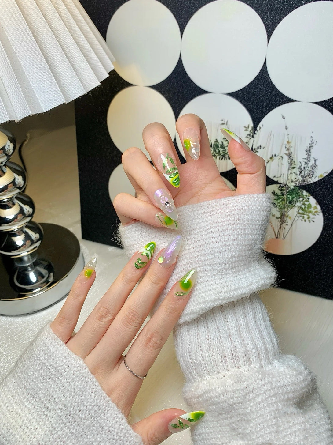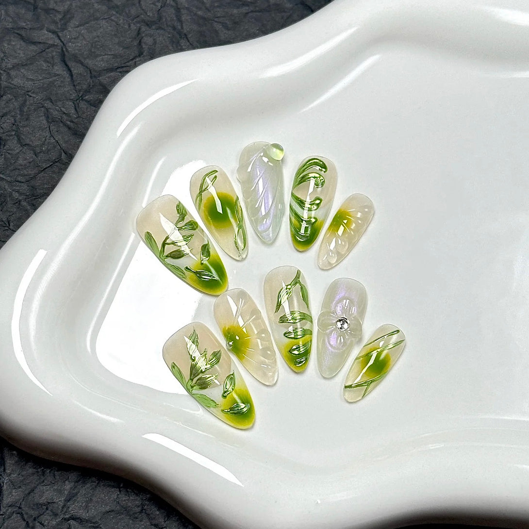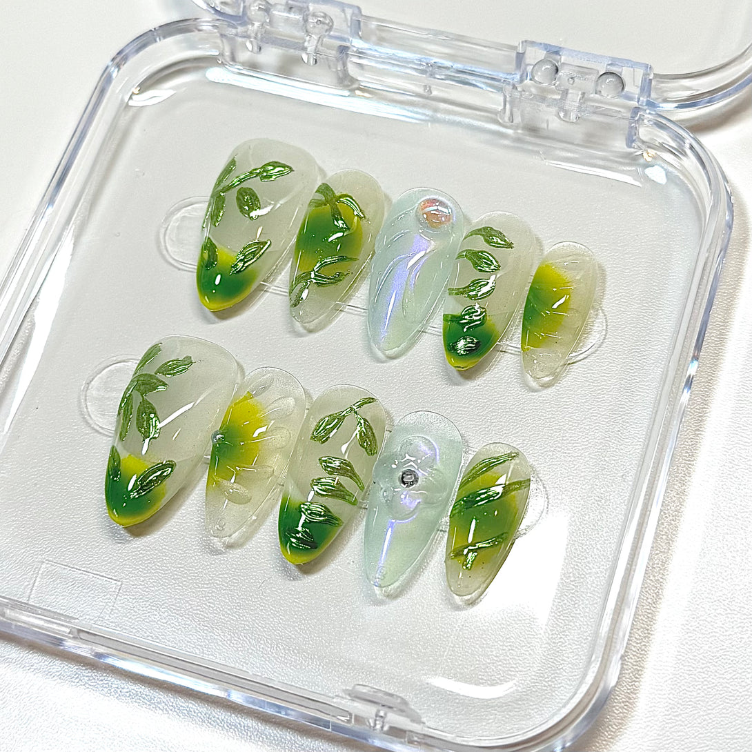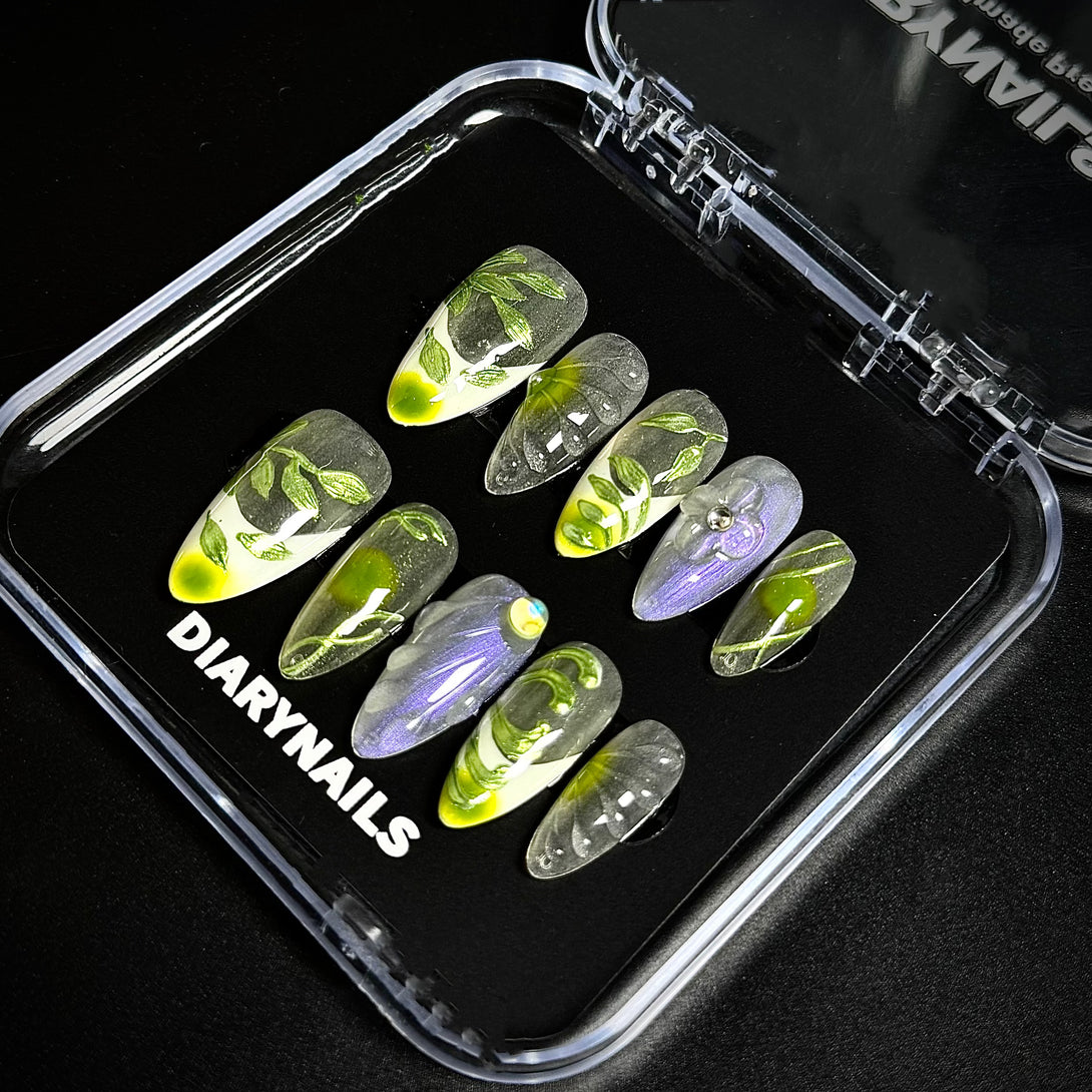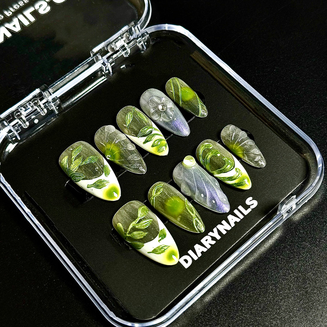 Sylvia by Diary Nails is a set of press-on nails featuring exquisite 3D water droplet textures, delicate floral accents, and hand-painted green leaf motifs. The fresh green tones blend seamlessly with soft gradients, creating a serene and sophisticated look that’s perfect for adding a touch of natural elegance to any outfit.