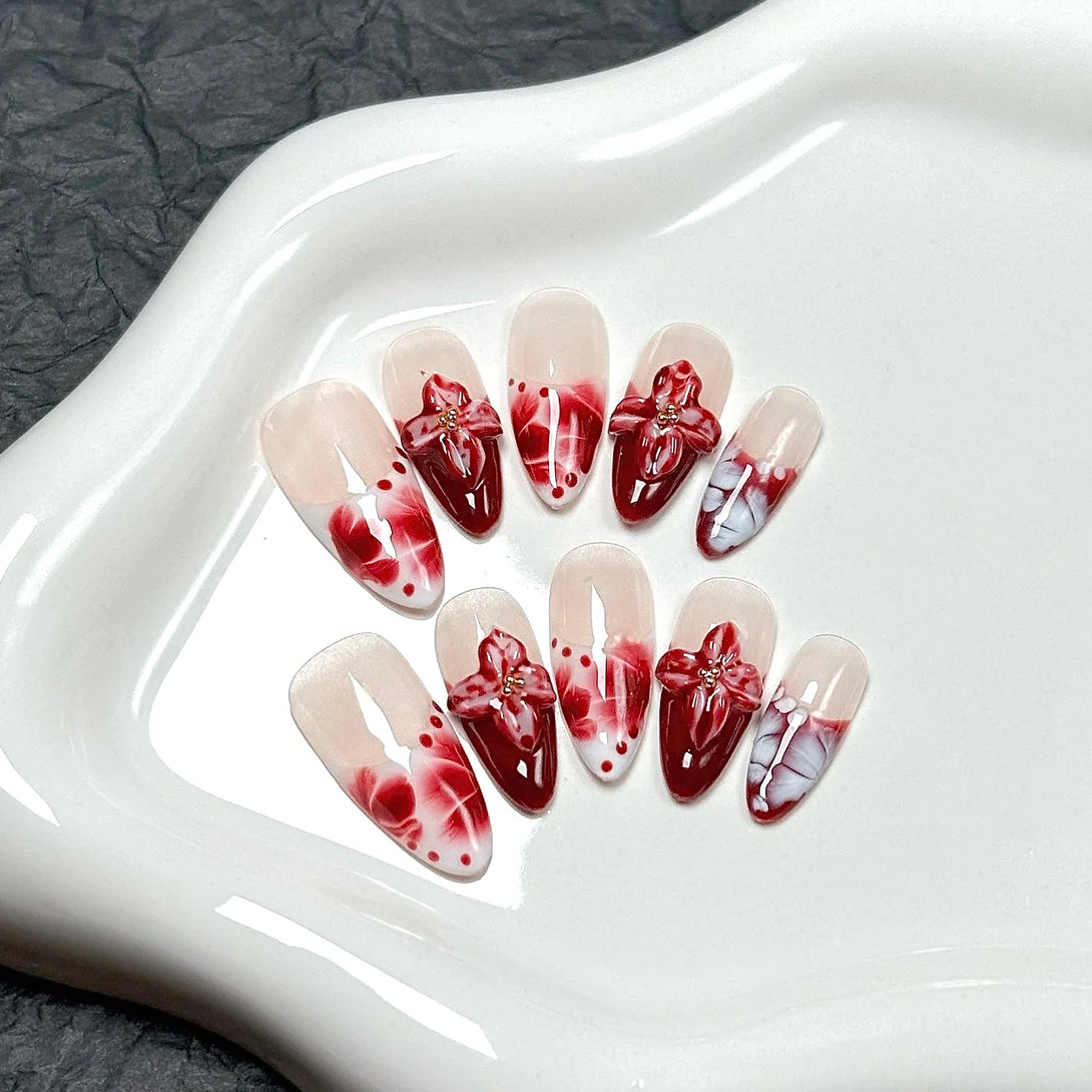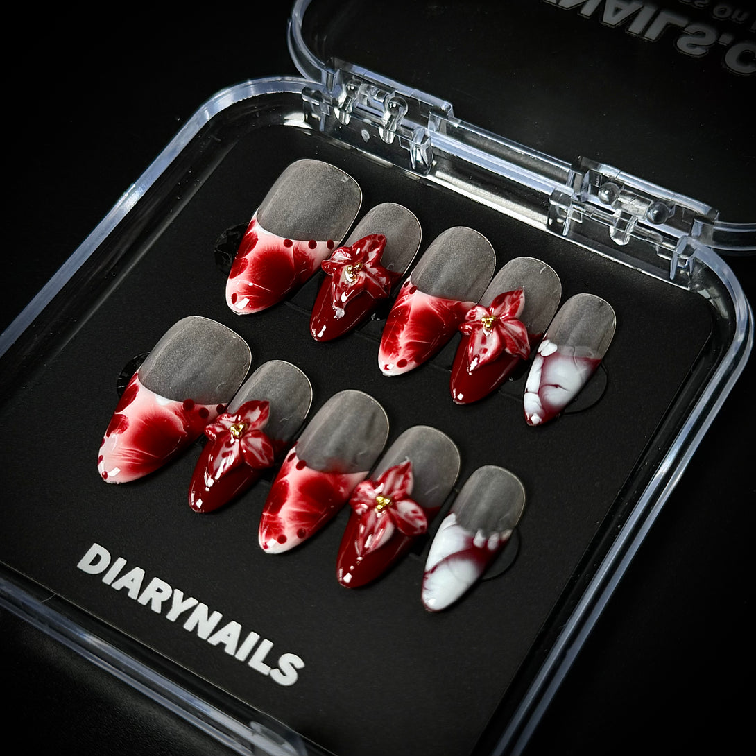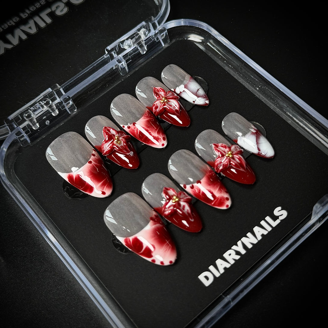 Rossa by Diary Nails is a set of press-on nails featuring 3D red floral embellishments and a captivating red-and-white ombré design. The petal-like patterns gracefully bloom over a translucent nude base, blending passion and elegance. Finished with glossy shine and intricate gradient detailing, these nails are perfect for adding a touch of drama and charm to any outfit. Ideal for date nights, special events, or anyone who loves floral glamour with an edge.