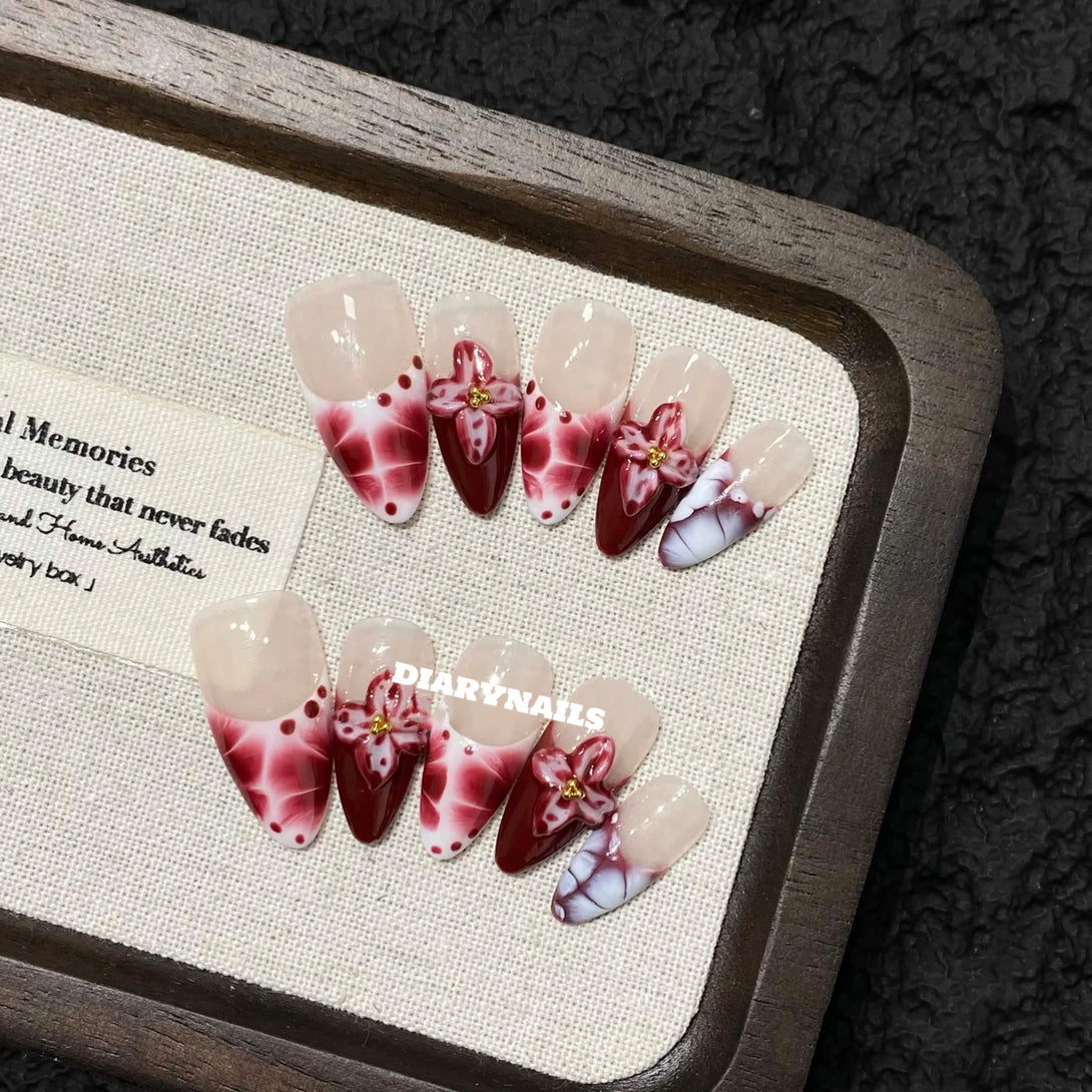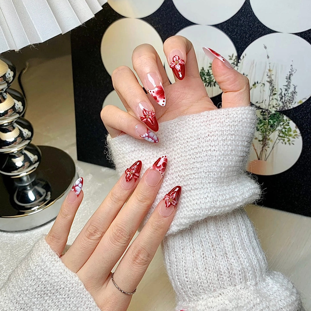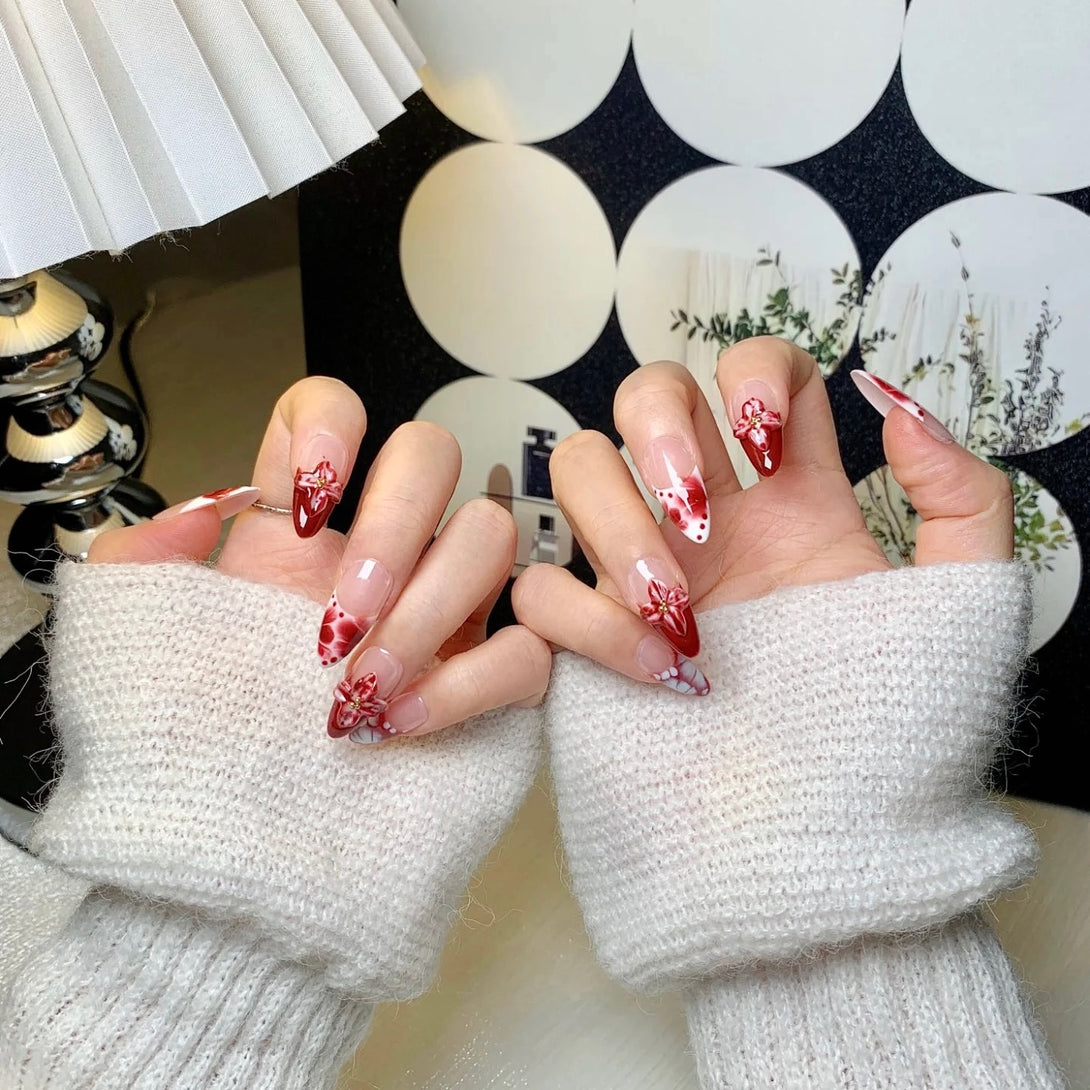 Rossa by Diary Nails is a set of press-on nails featuring 3D red floral embellishments and a captivating red-and-white ombré design. The petal-like patterns gracefully bloom over a translucent nude base, blending passion and elegance. Finished with glossy shine and intricate gradient detailing, these nails are perfect for adding a touch of drama and charm to any outfit. Ideal for date nights, special events, or anyone who loves floral glamour with an edge.