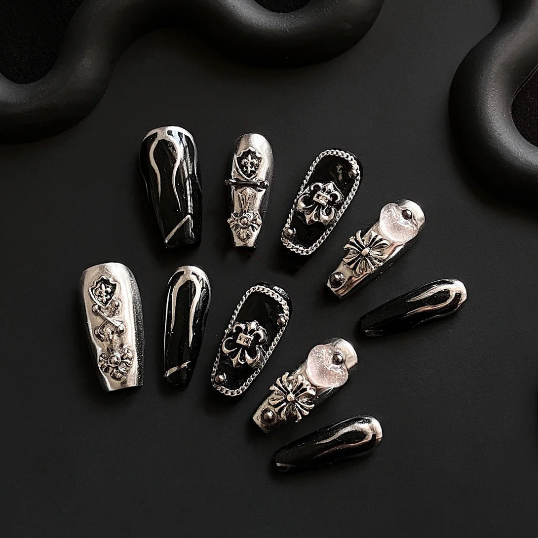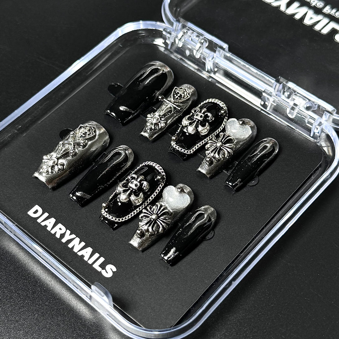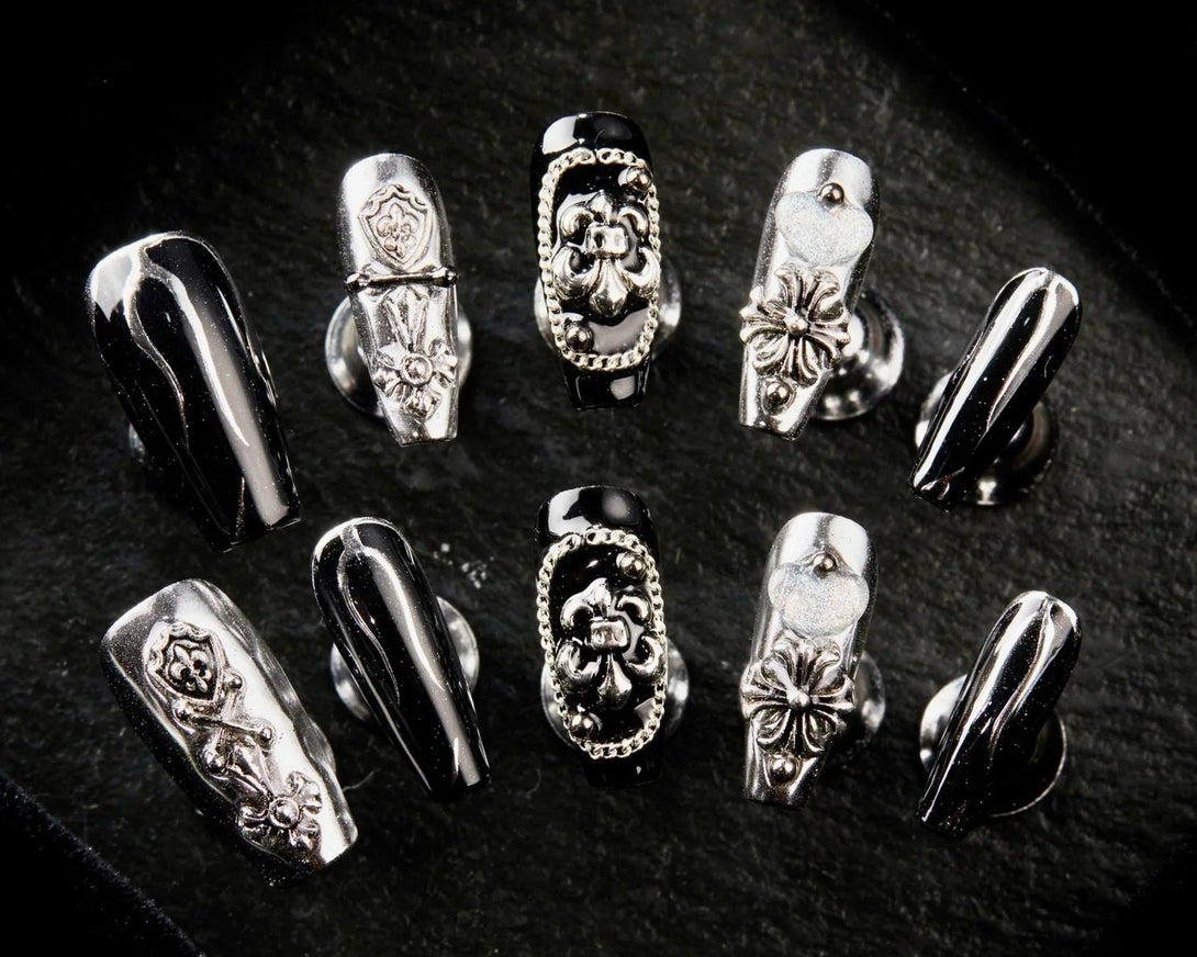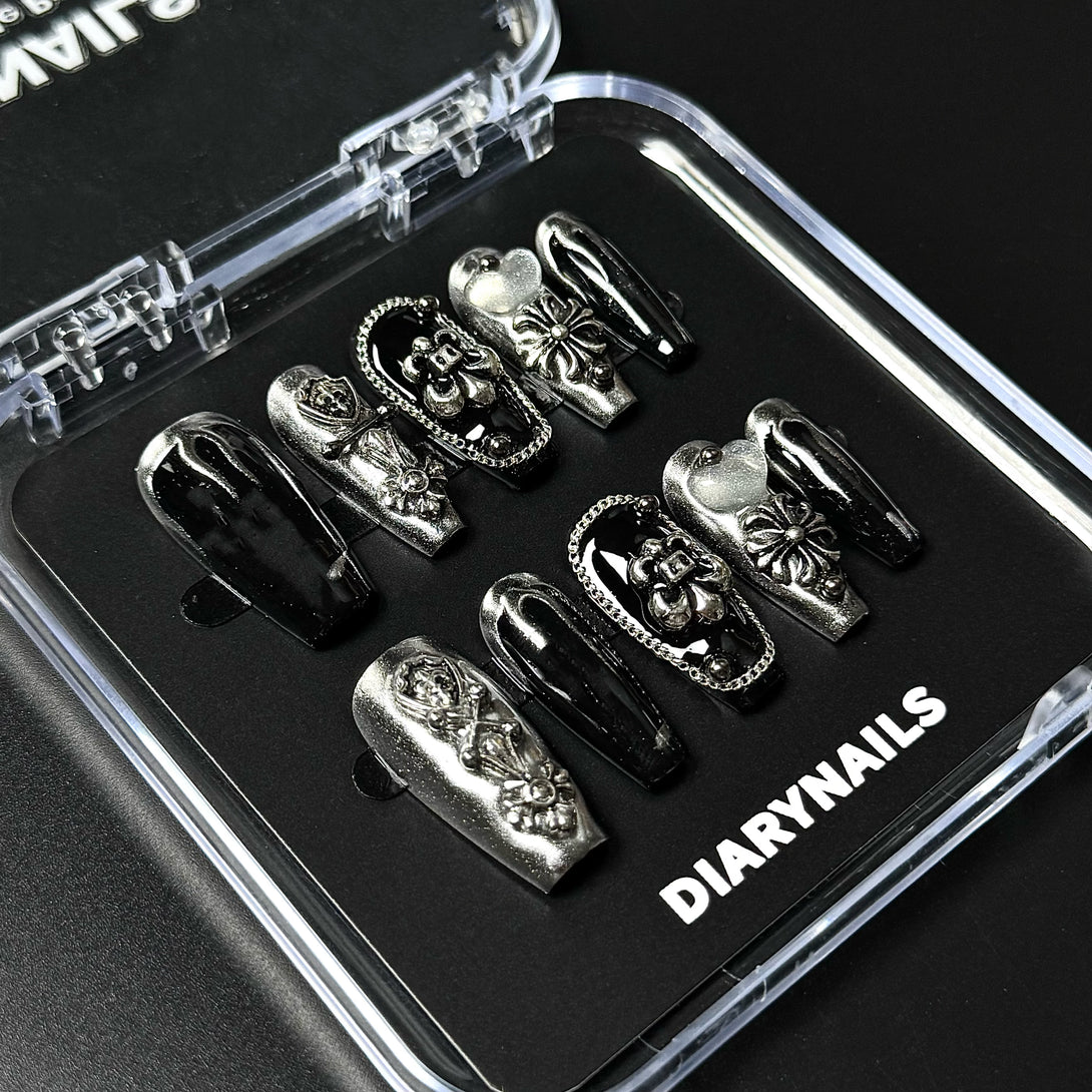CH Disciple by Diary Nails is a set of press-on nails featuring bold silver metallic embellishments and sleek flame patterns. The deep black base contrasts beautifully with the chrome details, chains, and gothic motifs, creating a daring rock-inspired look. Each nail is uniquely adorned with sculptural metal accents, giving your fingertips a statement-making, streetwear vibe. Perfect for concerts, nights out, or whenever you want your nails to radiate attitude and style.