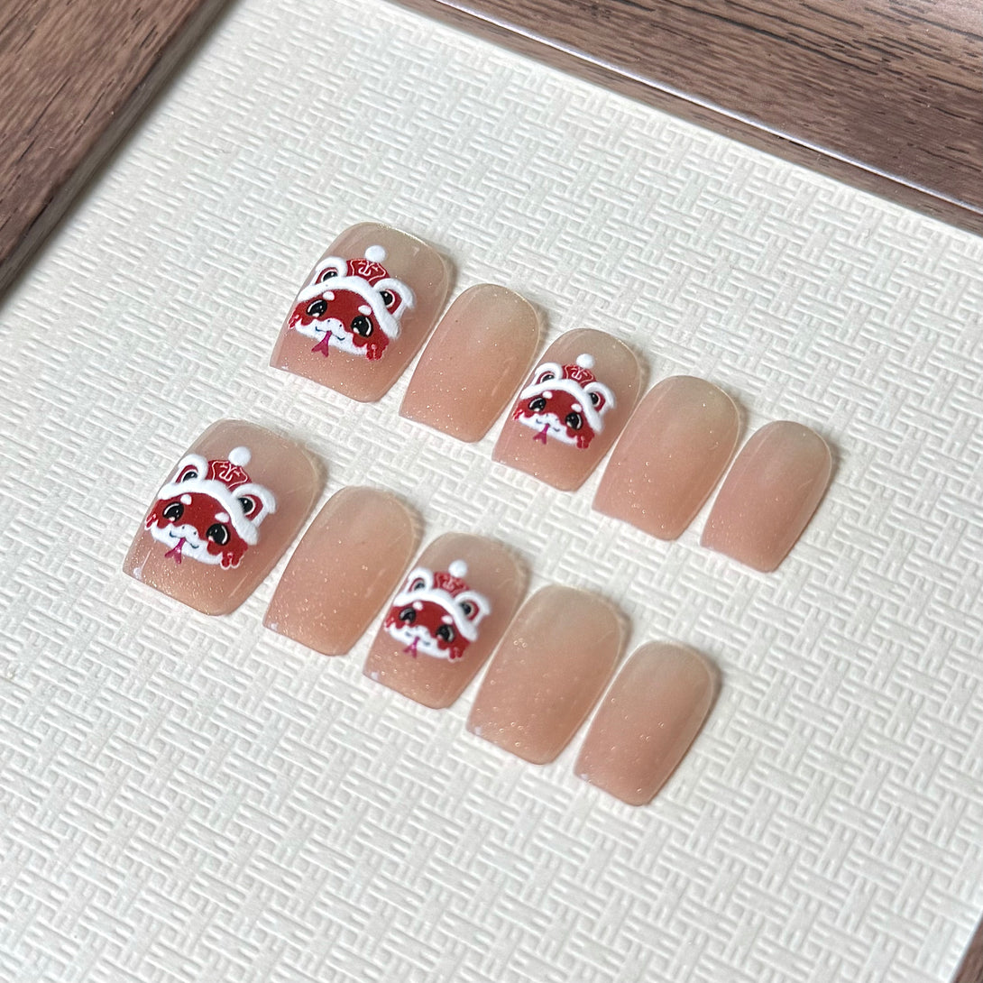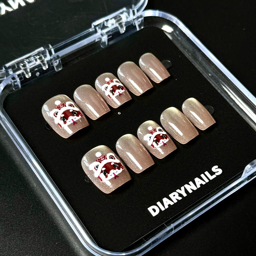 Dancing Lion by Diary Nails is a set of press-on nails features a smooth cat-eye gel base in a shimmering neutral shade, beautifully accented with adorable Chinese lion dance motifs. Inspired by the vibrant spirit of traditional festivals, these nails add a playful yet cultural charm to your manicure — perfect for making your look stand out with a touch of festive flair and cultural pride.