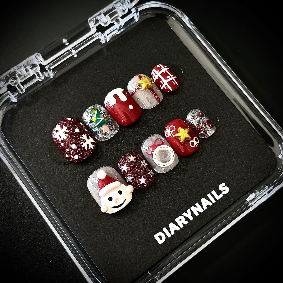Santa Claus by Diary Nails is a set of press-on nails featuring a 3D snowman, sparkling Christmas tree, golden stars, and hand-painted snowflakes, each nail is bursting with holiday cheer. The rich red, silver, and white tones bring warmth and sparkle — perfect for holiday parties or cozy winter days. A must-have design to make your nails part of the celebration!