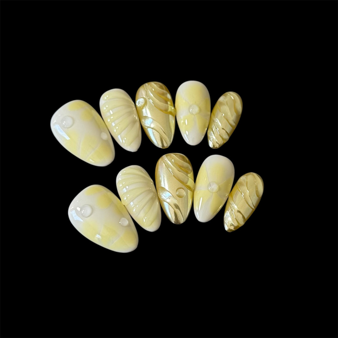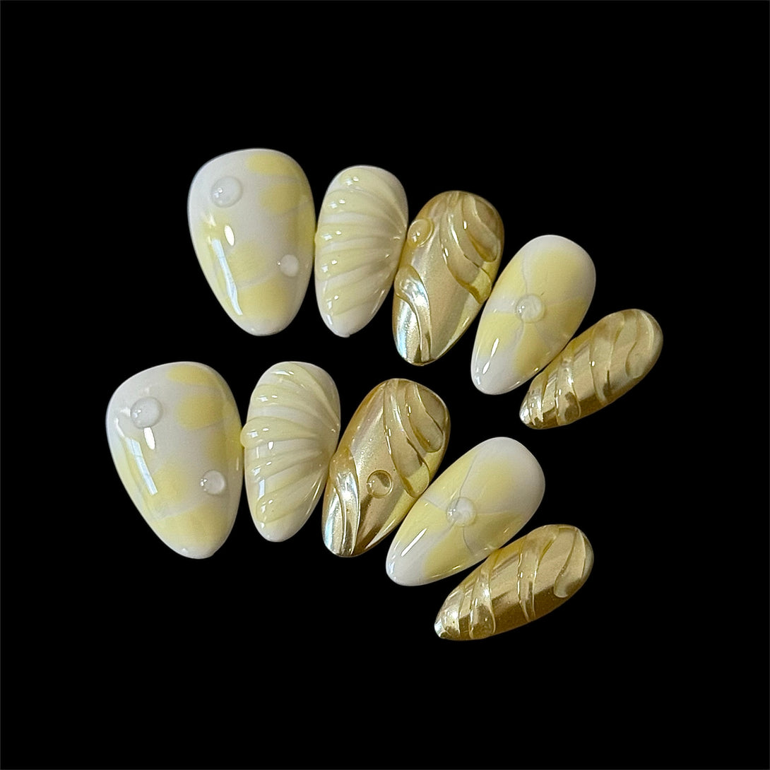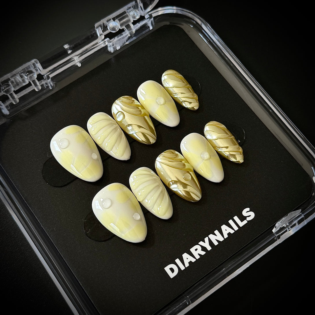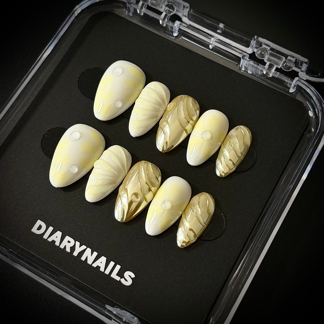 Daisy Star by Diary Nails is a set of press-on nails featuring delicate hand-painted daisy motifs and intricate 3D embossed textures, this design captures the beauty of sunshine and nature in every detail. Perfect for those who love a fresh and graceful.