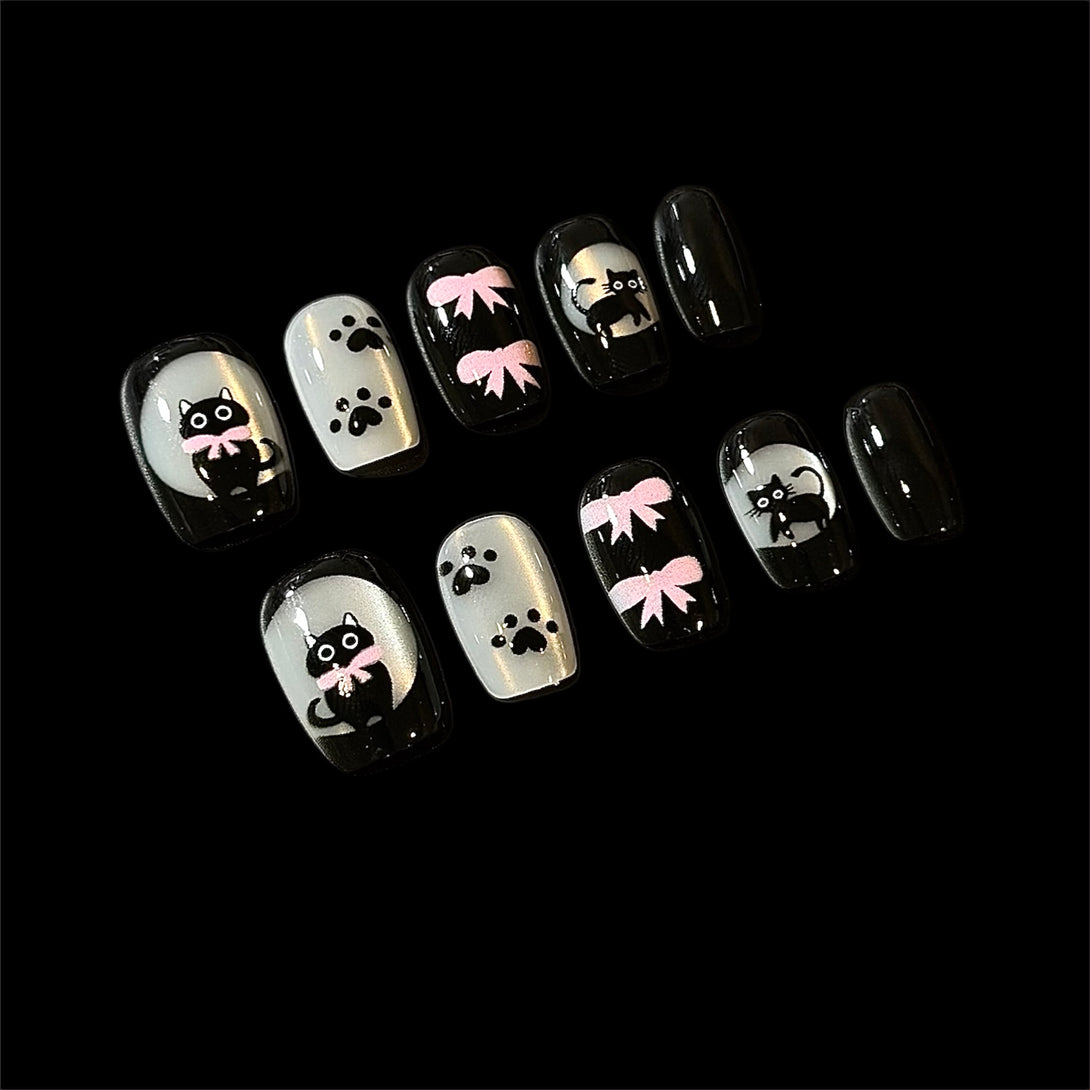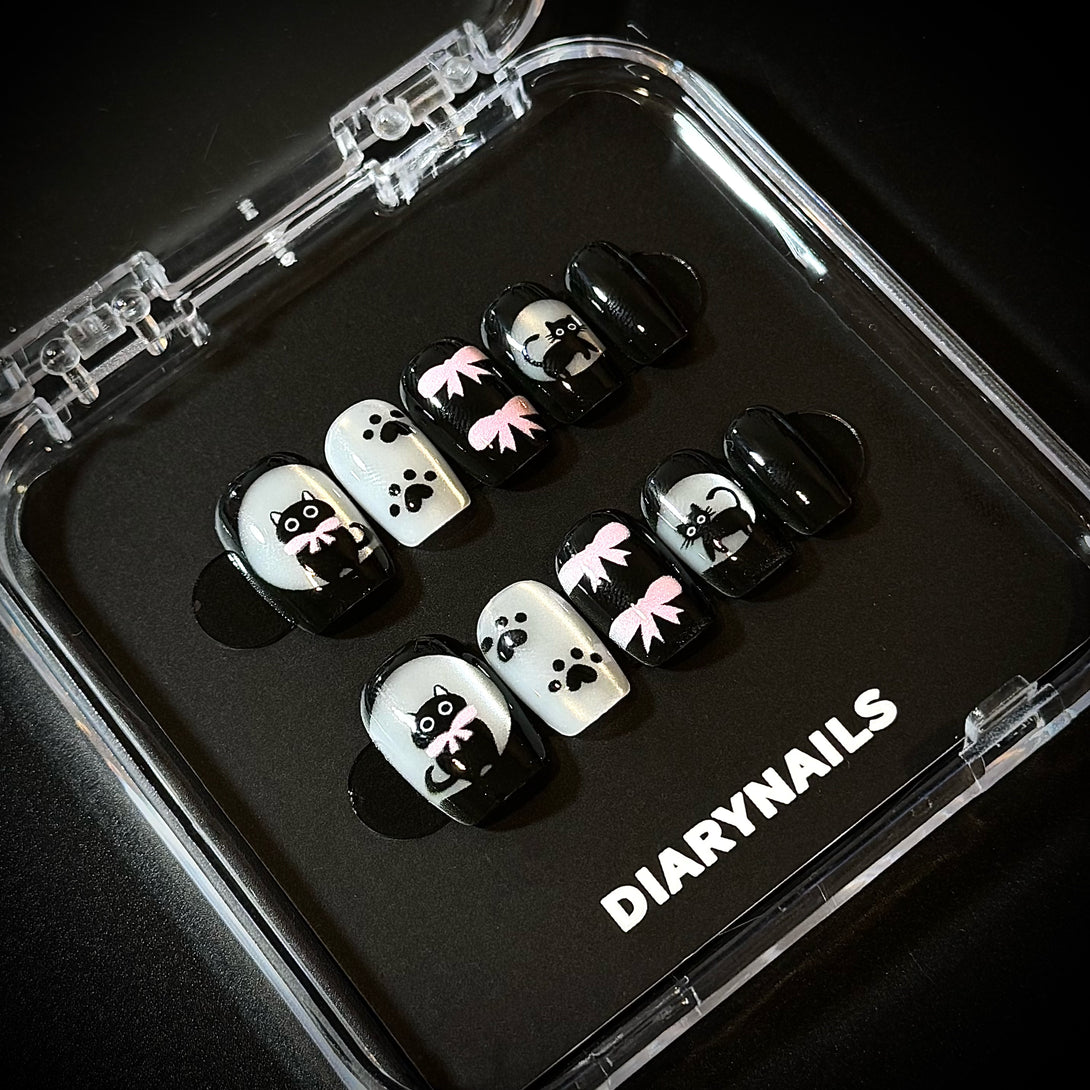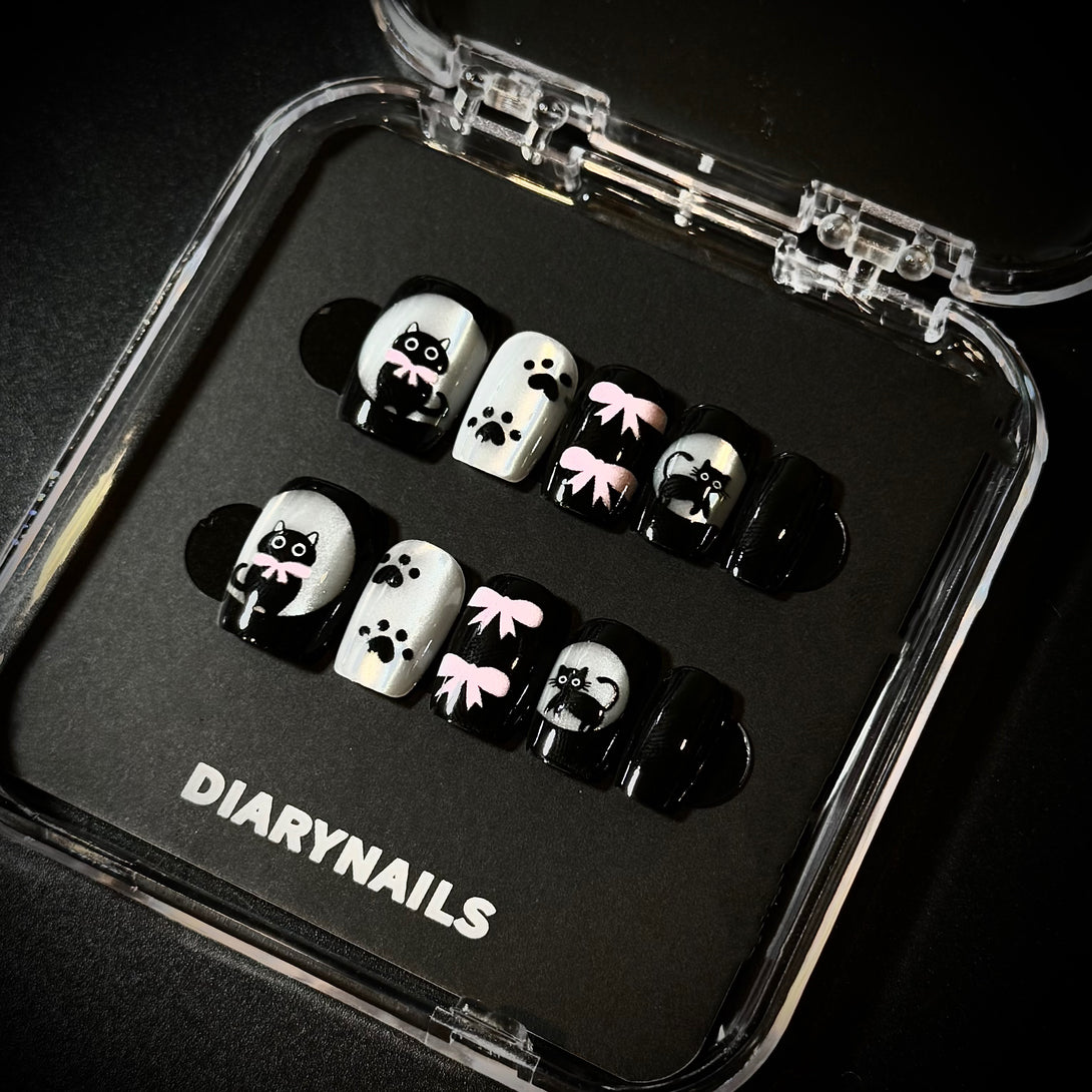 Pink Tied Cat by Diary Nails is a set of press-on nails featuring charming cat designs paired with soft pink bows. The classic black-and-pink color palette adds a chic contrast, while the paw prints and glossy finish bring out a fun, lively personality. Perfect for cat lovers and anyone who adores cute yet fashionable nail art.