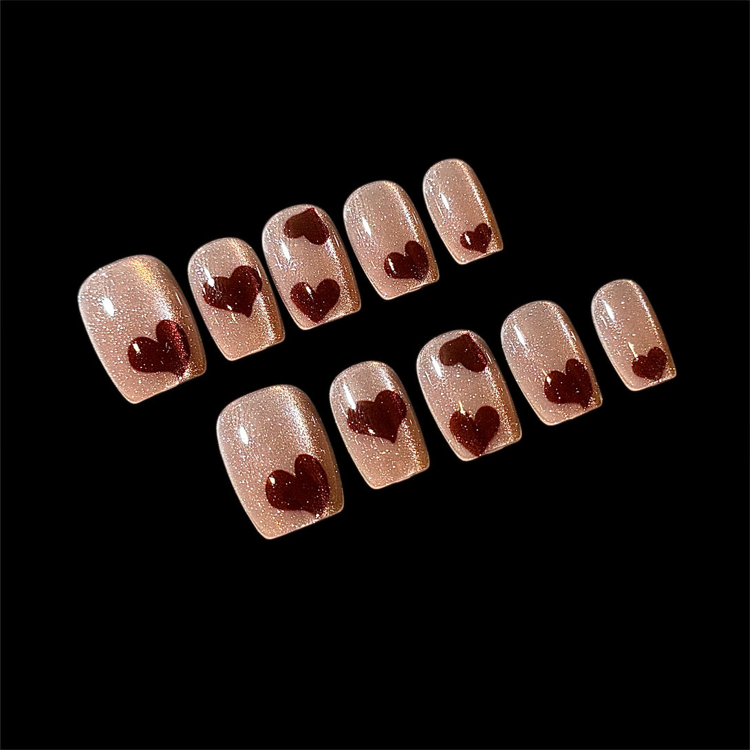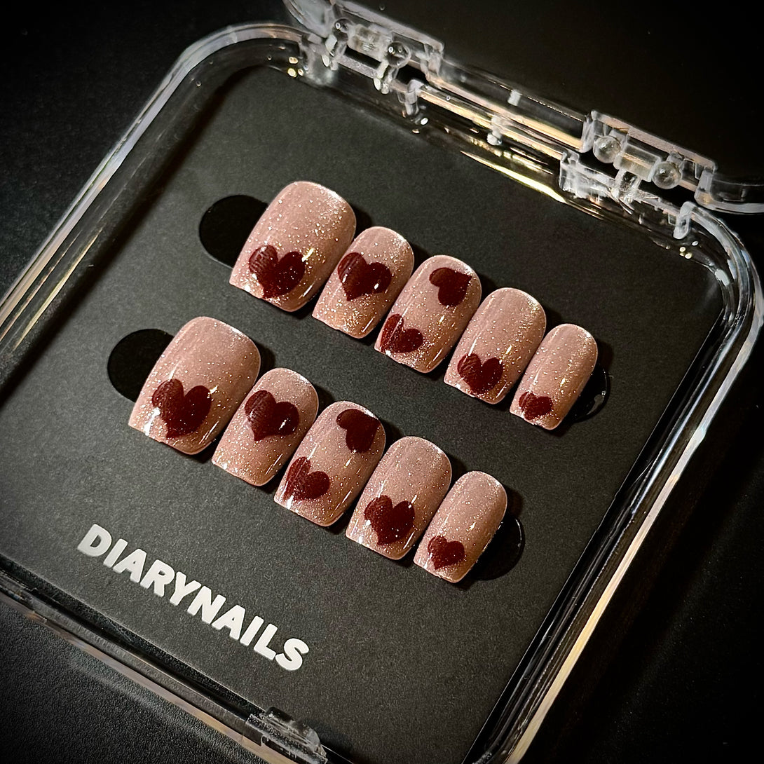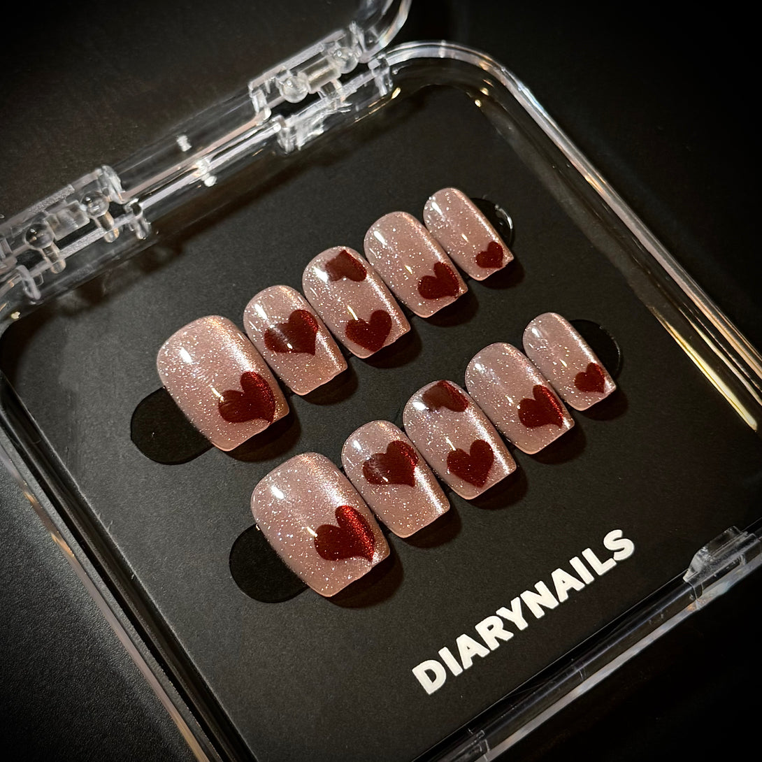 Love Song by Diary Nails is a set of press-on nails featuring a soft pink cat-eye gel base adorned with deep red heart designs. The shimmering finish adds a subtle sparkle, making it both sweet and elegant. Perfect for date nights, Valentine’s Day, or anytime you want to add a touch of love and charm to your look.