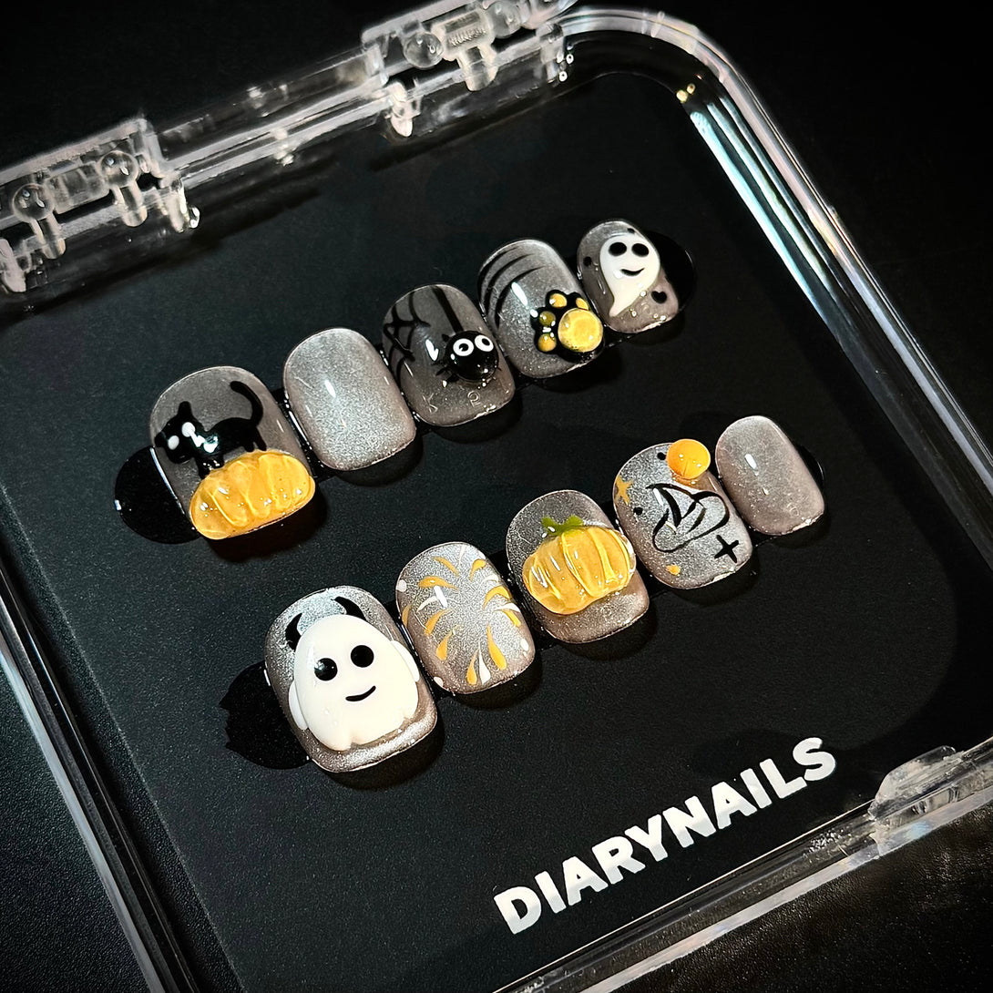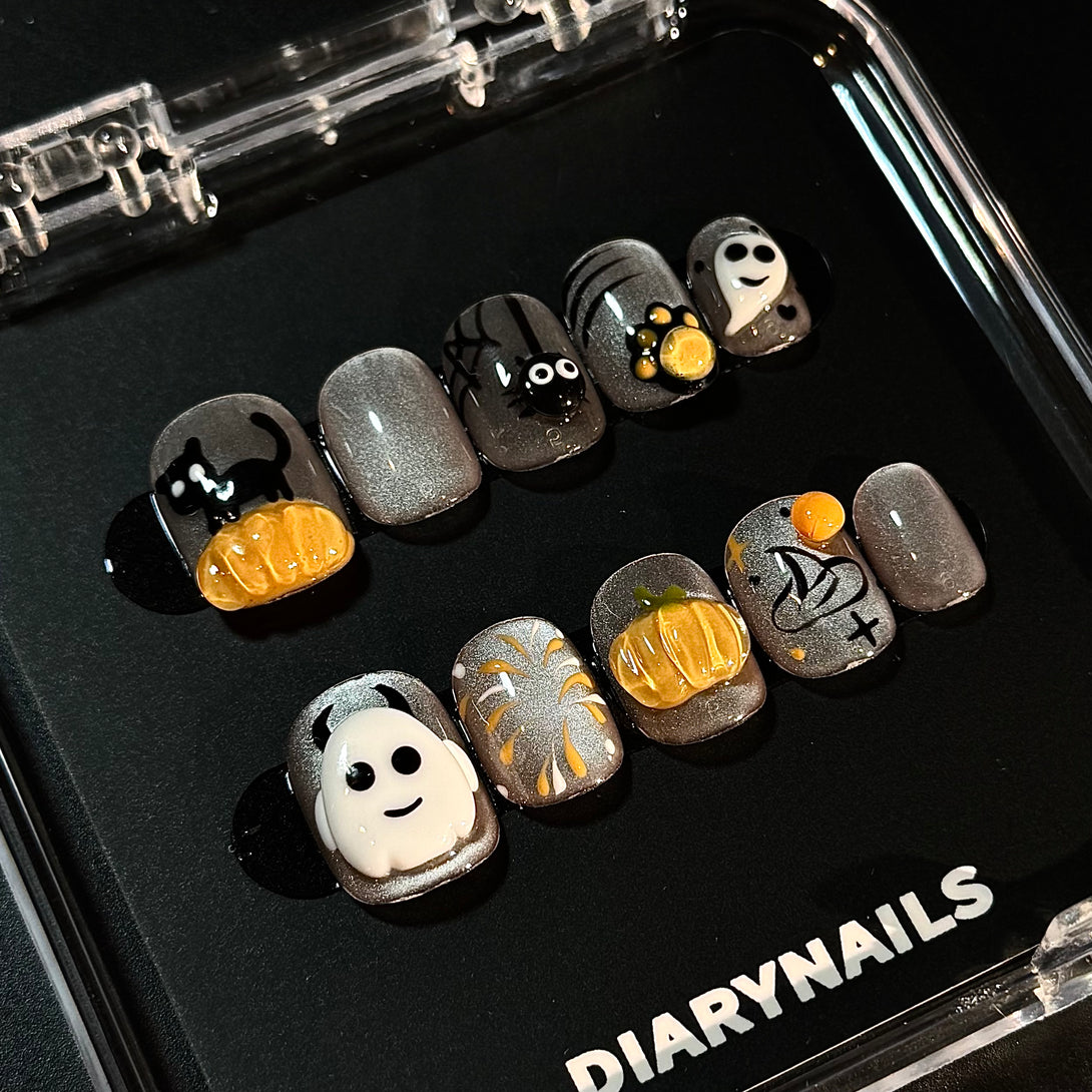 Halloween Night by Diary Nails is a set of press-on nails featuring 3D crystal pumpkins, hand-painted black cats, and playful ghost details. Accented with sparkling fireworks and spooky motifs, this design captures the magic of a Halloween night full of fun and celebration.