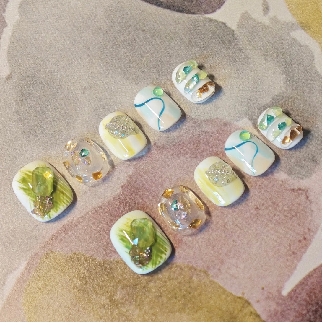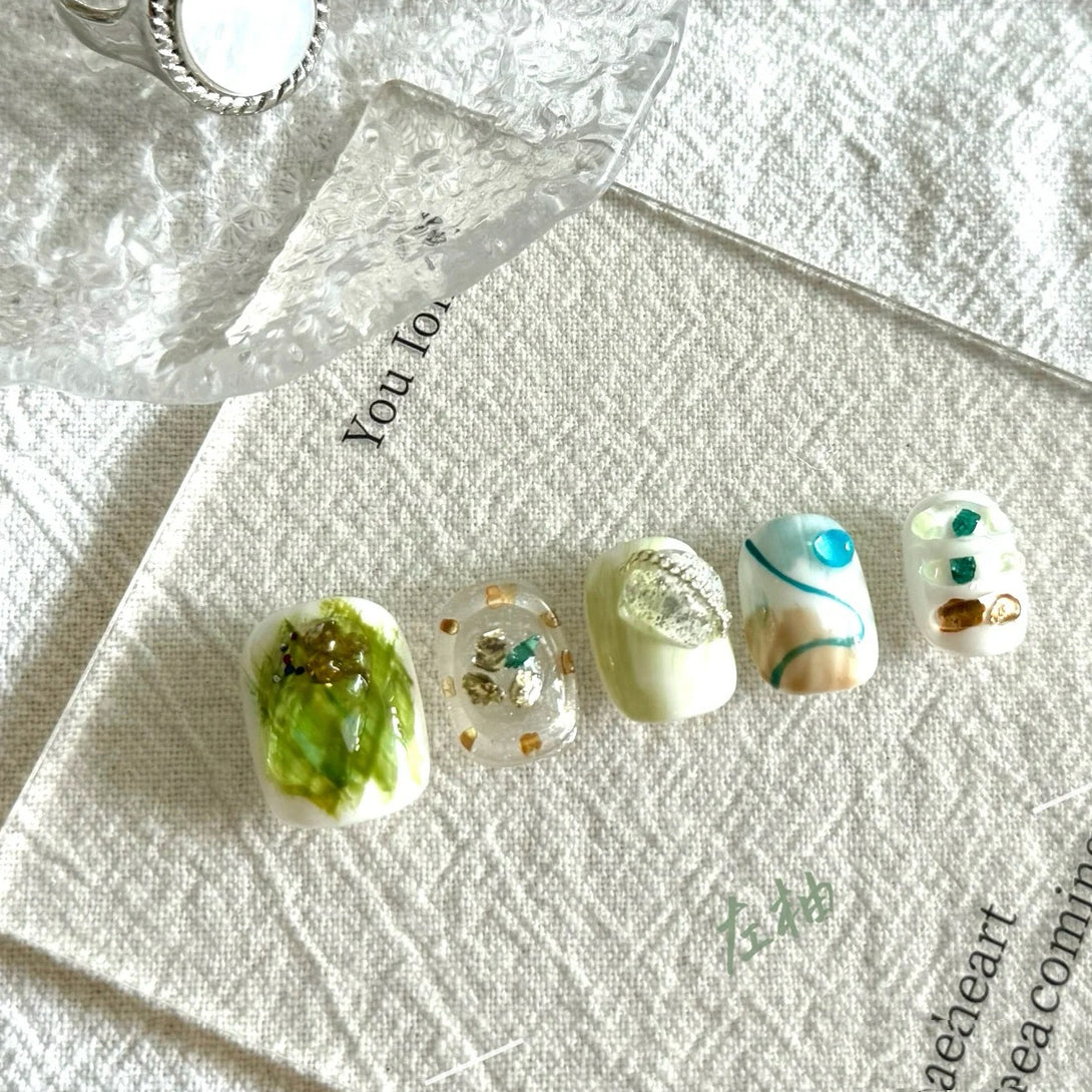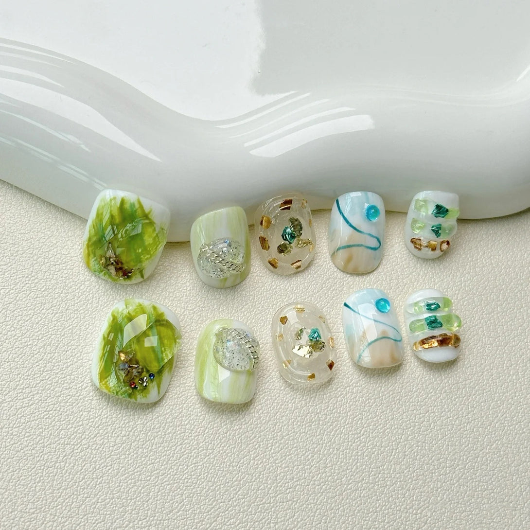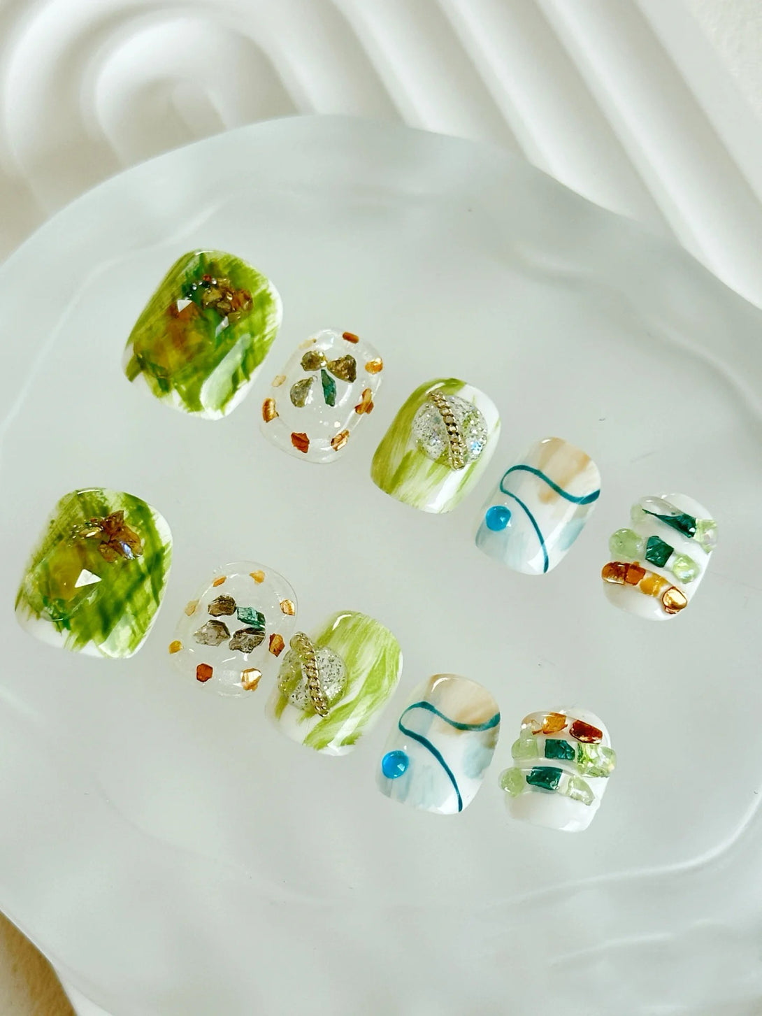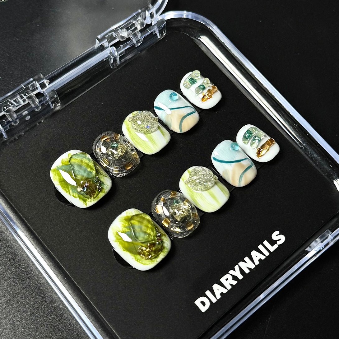 Emerald by Diary Nails is a set of press-on nails featuring intricate hand-painted patterns in soft greens and creams, each nail is accented with emerald-like crystals and golden embellishments that mimic the look of treasure boxes. Perfect for those who love a balance of organic beauty and statement glamour — Emerald Garden Luxe is your go-to set for standout style rooted in nature.