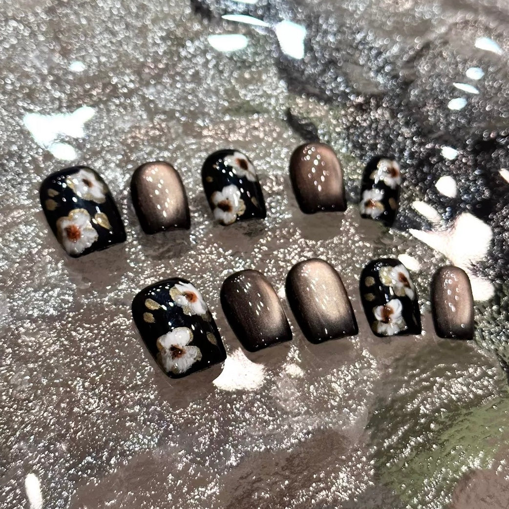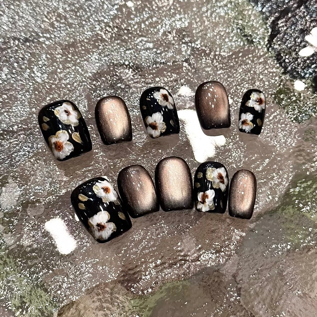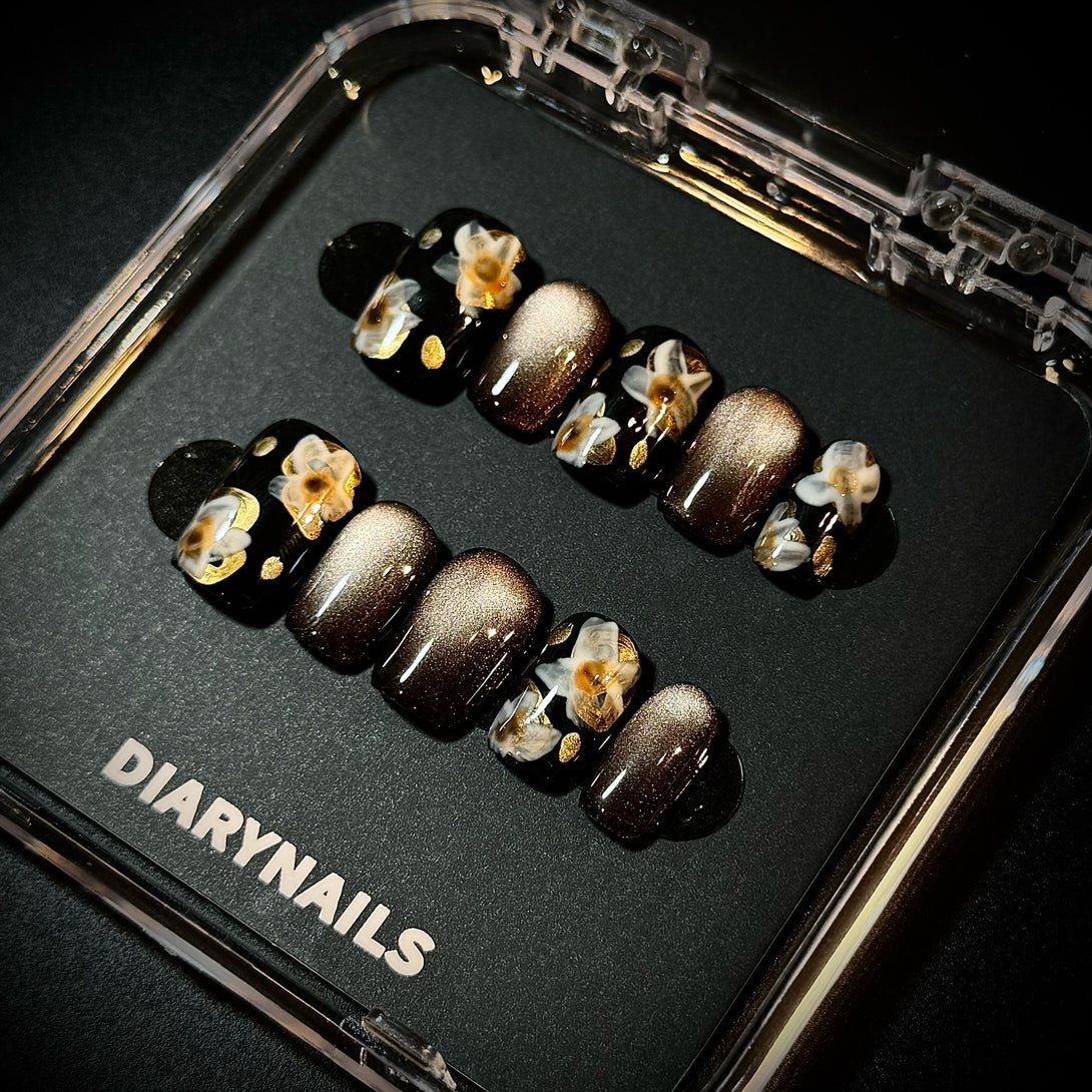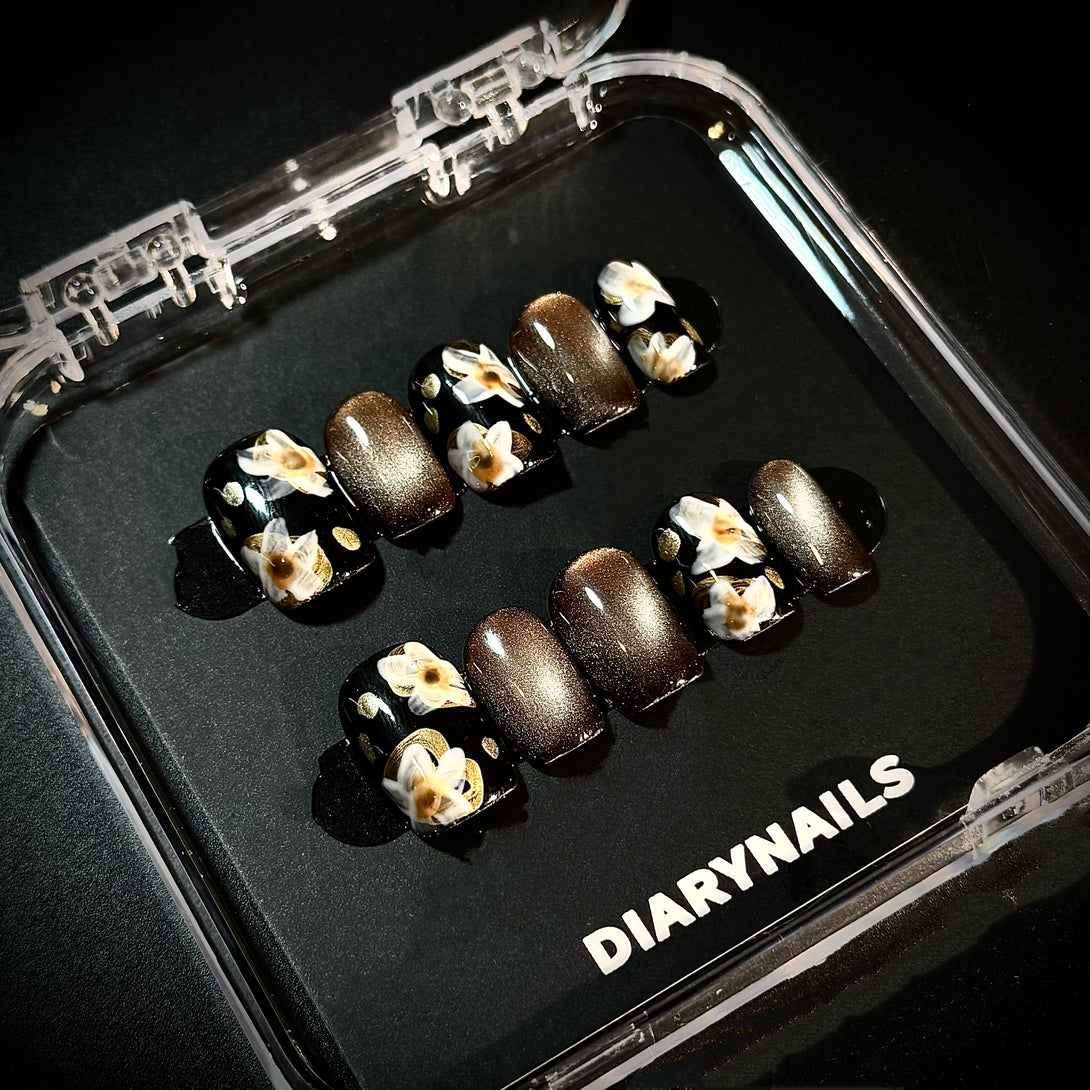 Blanc Flora by Diary Nails is a set of press-on nails featuring a shimmering cat-eye gel base, beautifully adorned with hand-painted golden and white floral designs. The soft gradient effect adds depth and elegance, making this set perfect for a refined and graceful look.