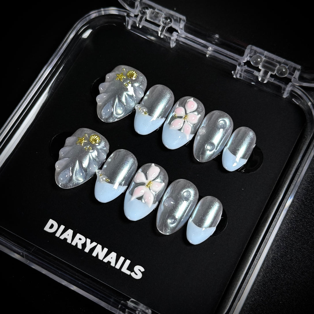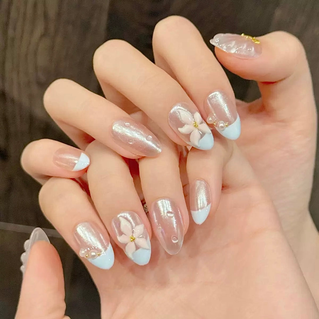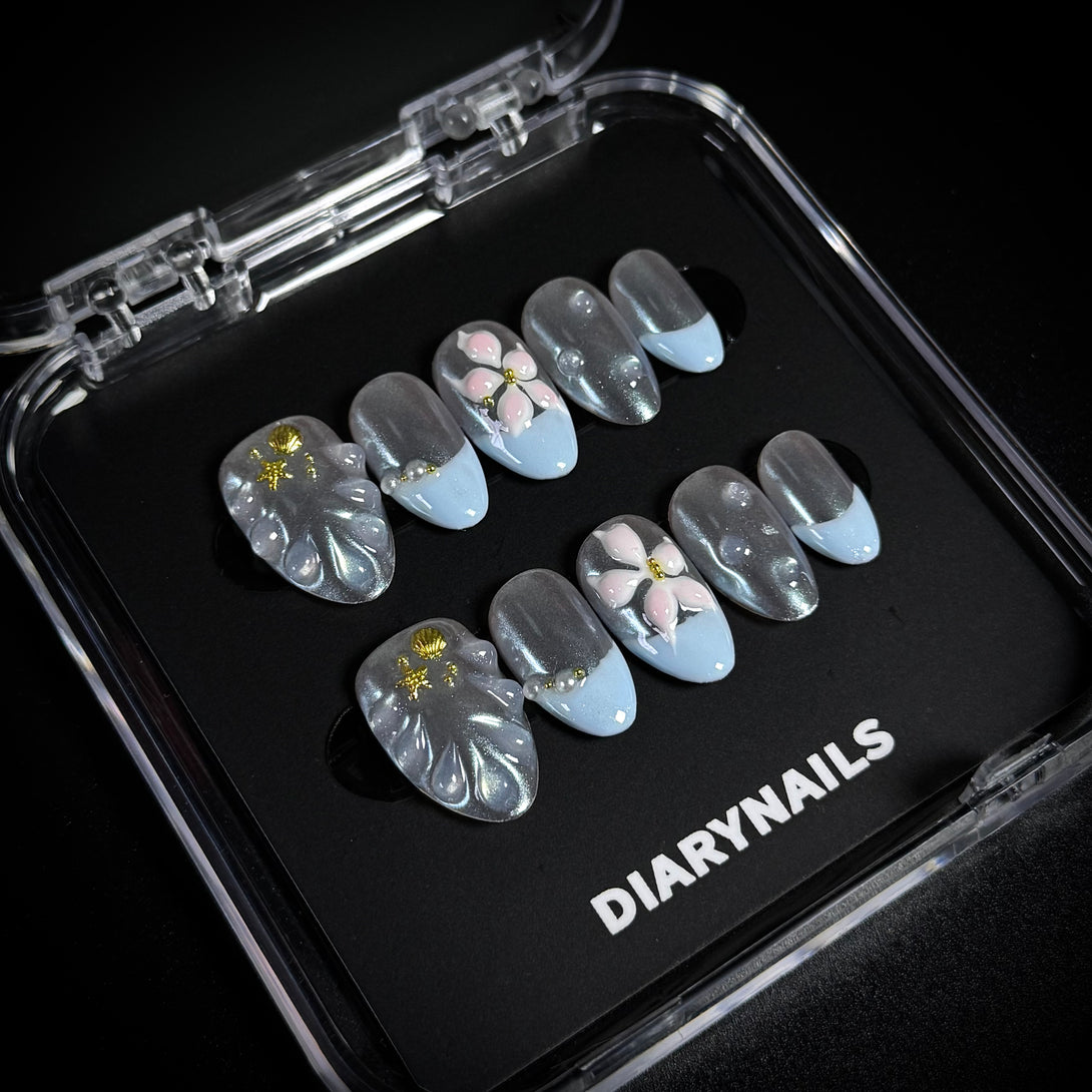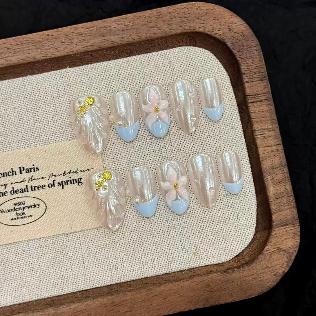 Elevate your manicure with this elegant blue French tip press-on nail set, featuring delicate 3D embellishments. Soft pink floral accents pair beautifully with metallic shell charms and pearl details, creating a refined, feminine look. Each set is meticulously handcrafted with gel for a smooth, high-quality finish by Diary Nail.