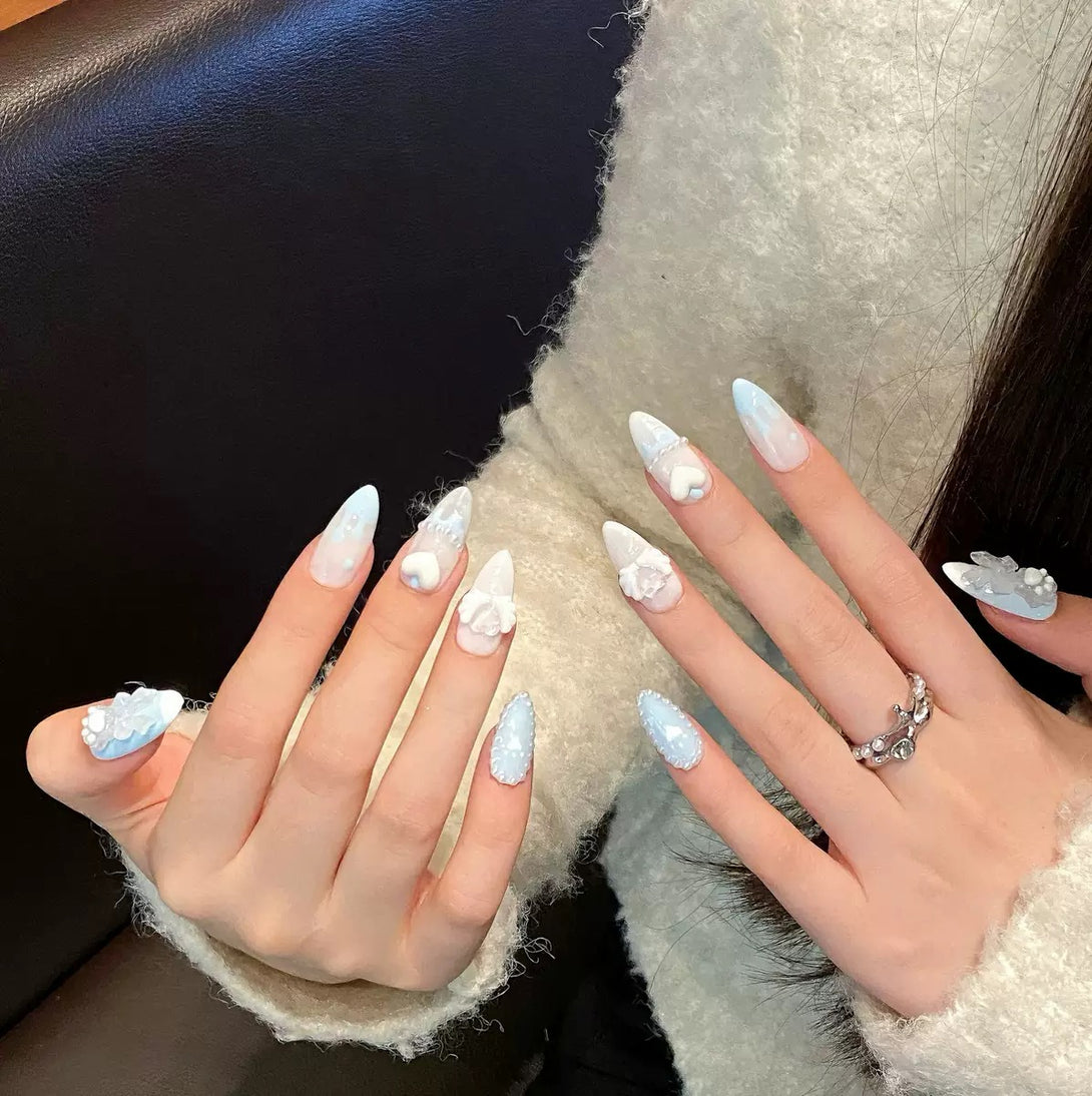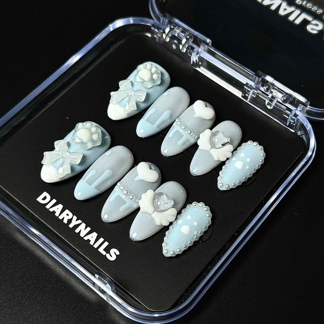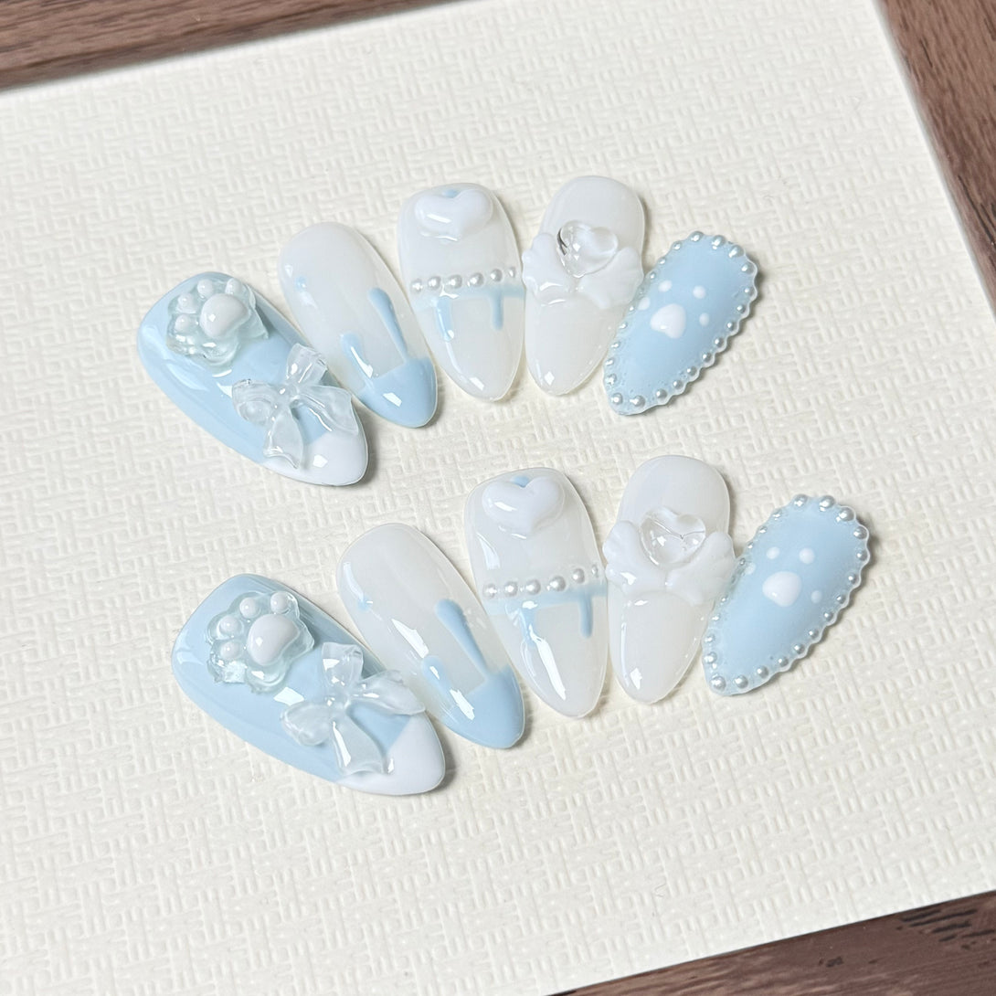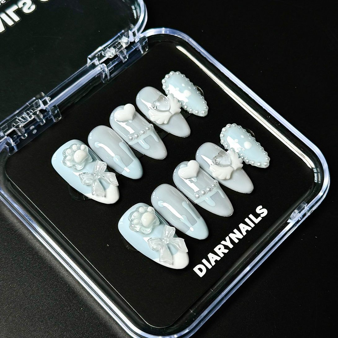 Kinomoto by Diary Nails is a set of press-on nails features soft gradient blues with playful 3D elements like cat paws, bows, angel wings, and pearl accents, creating a perfect mix of cuteness and elegance. Perfect for soft girl styles, anime lovers, or anyone who loves charming, playful nails — Blue Angel Paw is your new go-to set for cuteness with an ethereal twist.