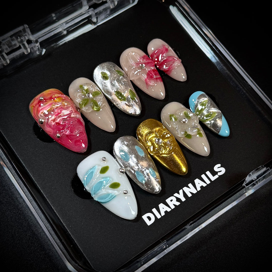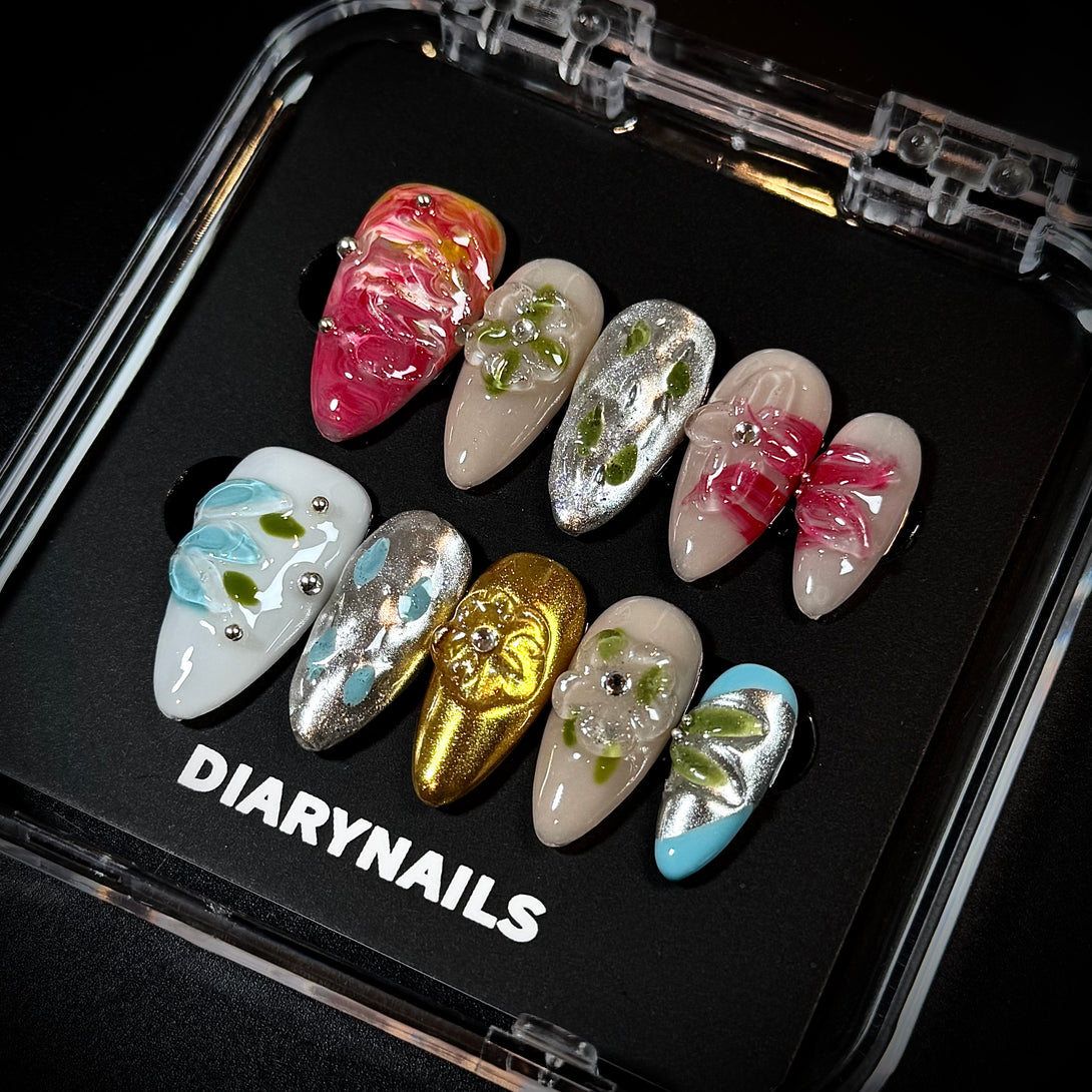 Lychee Soda by Diary Nails is a set of press-on nails showcases a stunning array of 3D floral designs, bringing a garden-inspired elegance to your fingertips. Each nail is a piece of art, featuring intricately sculpted flowers with a mix of lustrous finishes from shimmering metallics to translucent glazes. Accents like tiny beads and glittering crystals enhance the texture and depth, making each nail uniquely captivating. Perfect for those who love a touch of nature’s charm with a luxurious twist.