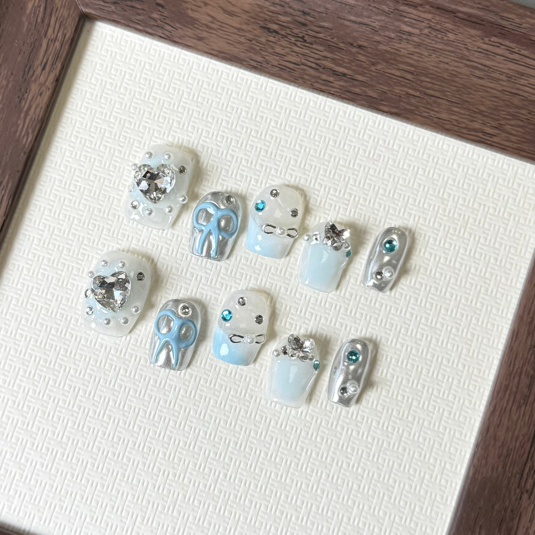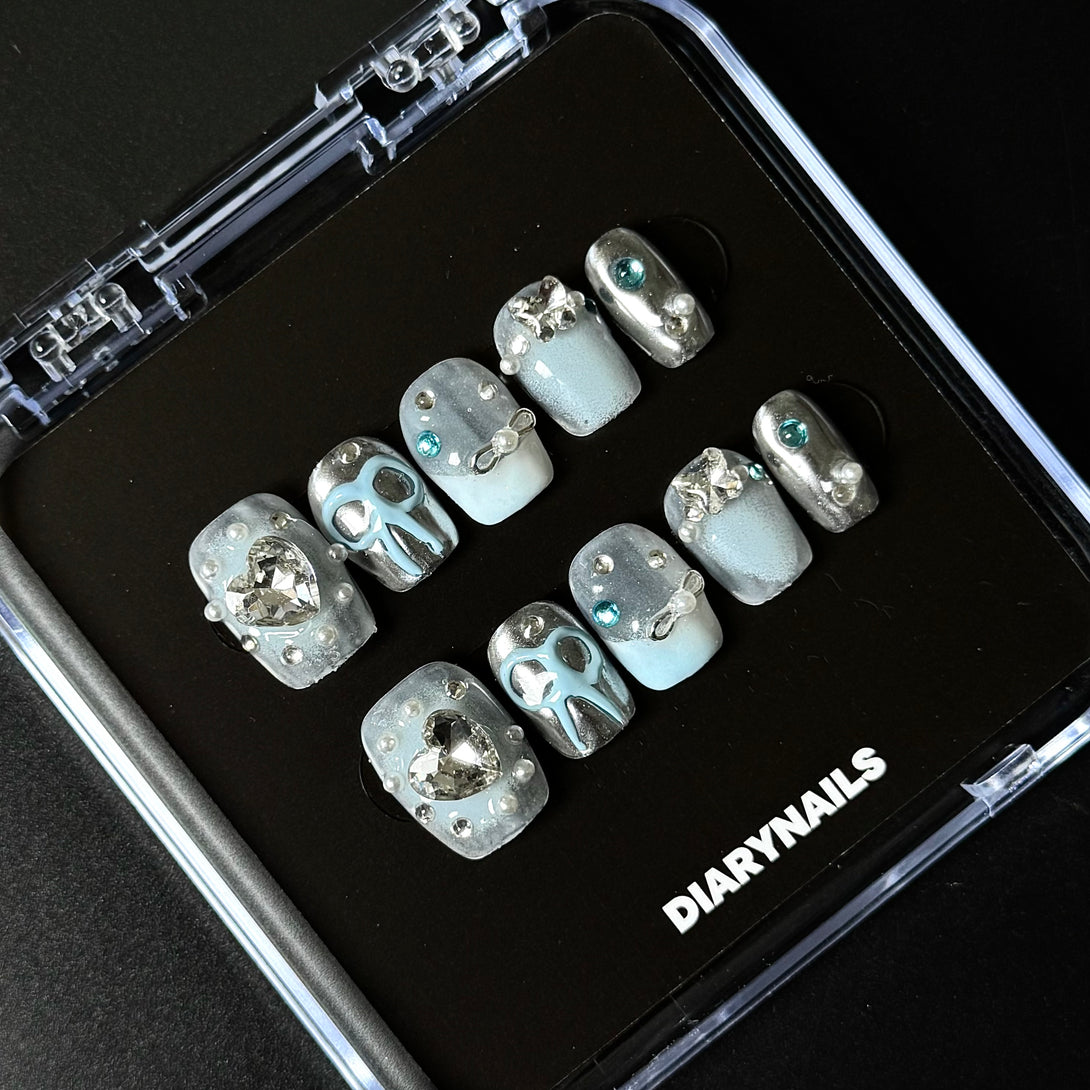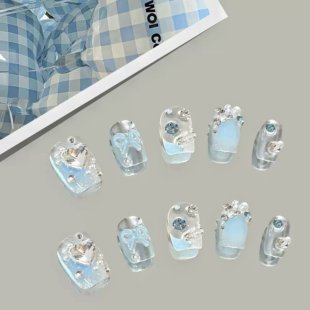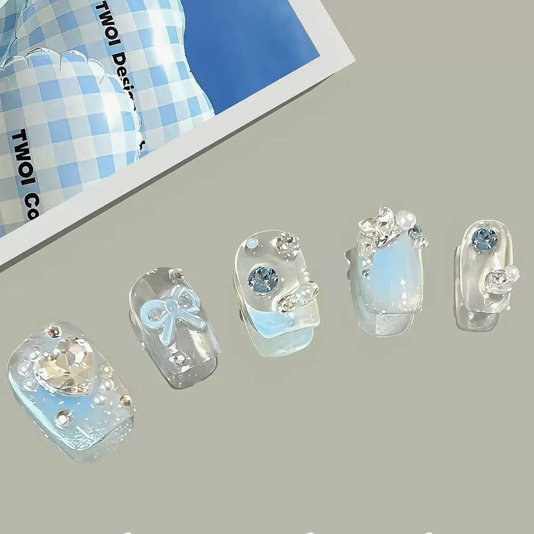 Tahiti by Diary Nails is a set of press-on nails featuring a dreamy translucent blue base, this design is adorned with shimmering rhinestone hearts, delicate 3D bows, and pearlescent accents for a magical, fairycore finish. Step into a frosted fairytale with Blue Frost Bow & Heart – the perfect statement nails for a soft, sparkling touch.