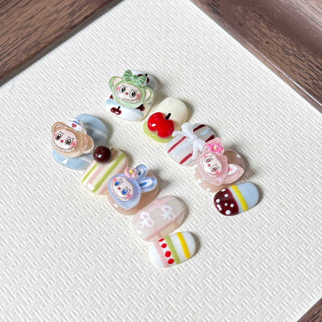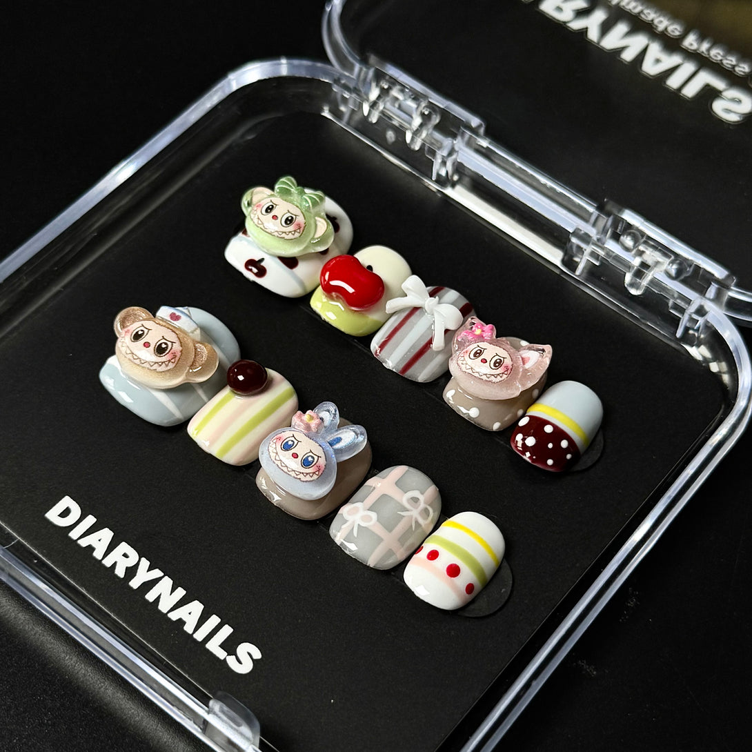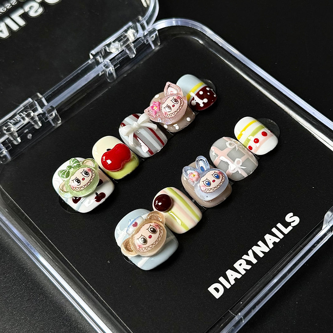 Bubu Land by Diary Nails is a set of press-on nails featuring adorable characters, hand-painted bows, and 3D accents like shiny apples and dots. The sweet pastel stripes, candy-inspired patterns, and cartoon vibes create a whimsical, cheerful aesthetic that’s perfect for adding fun to your everyday look. Ideal for fans of cute, detailed nail art with personality and flair!