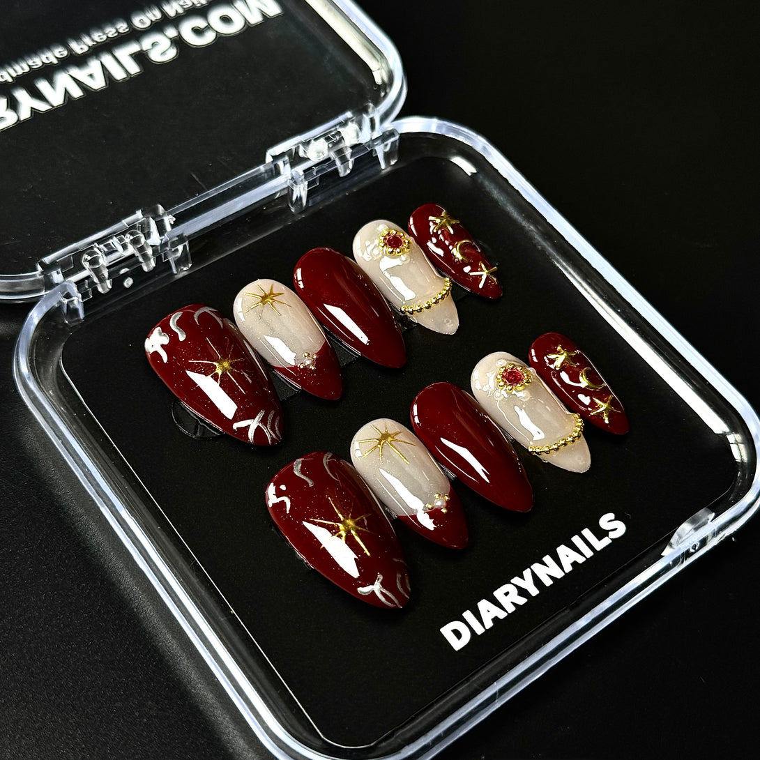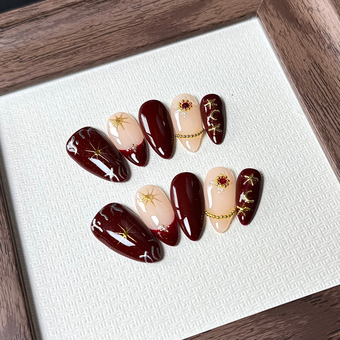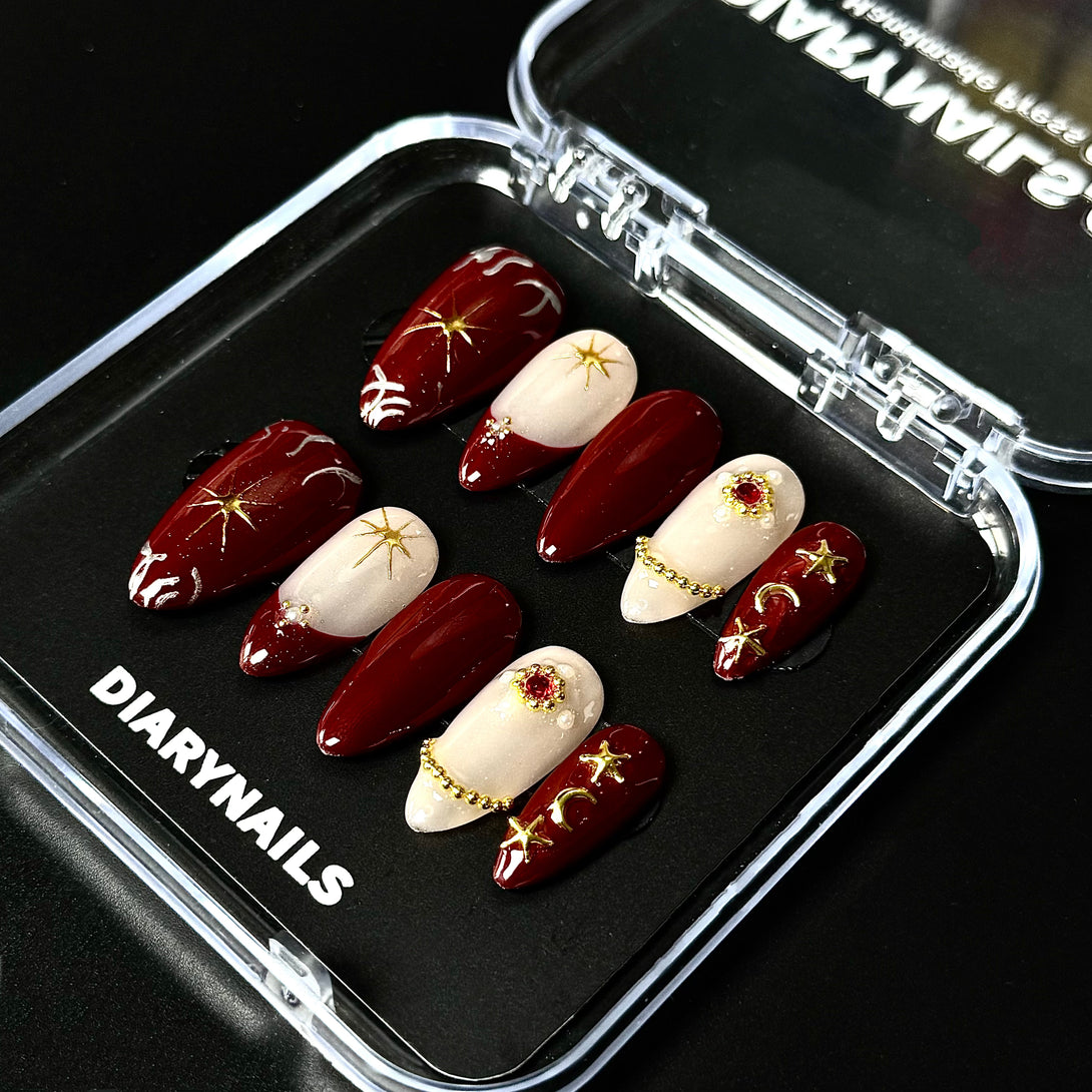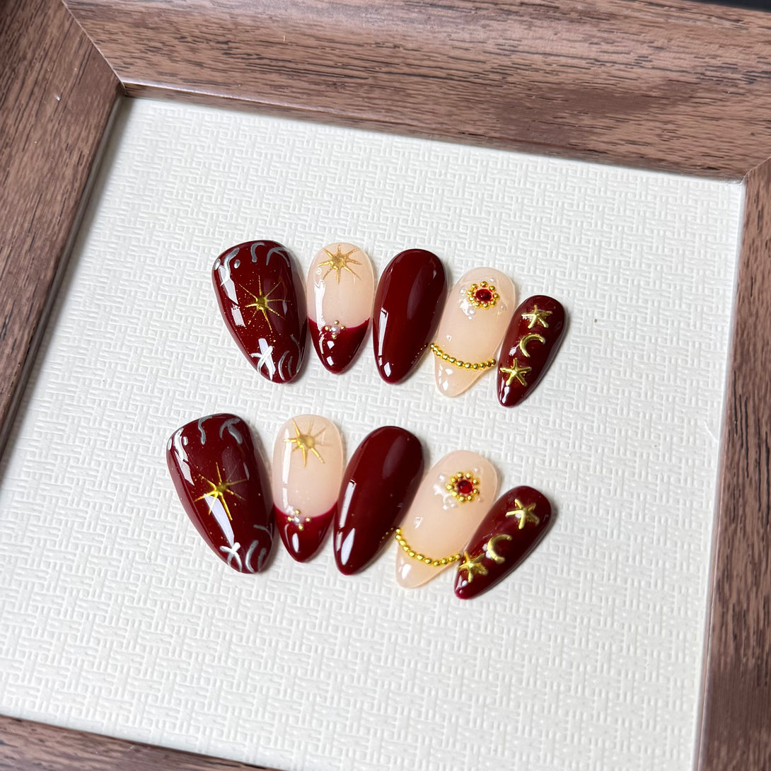 Sangria by Diary Nails is a set of press-on nails featuring deep red French tips accented by delicate hand-painted celestial patterns and gold starbursts, each nail is finished with intricate metallic charms and gem details for a luxurious look. Perfect for any special occasion or when you want to feel effortlessly sophisticated, these nails blend classic romance with modern artistry.