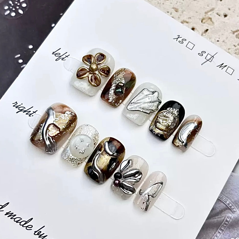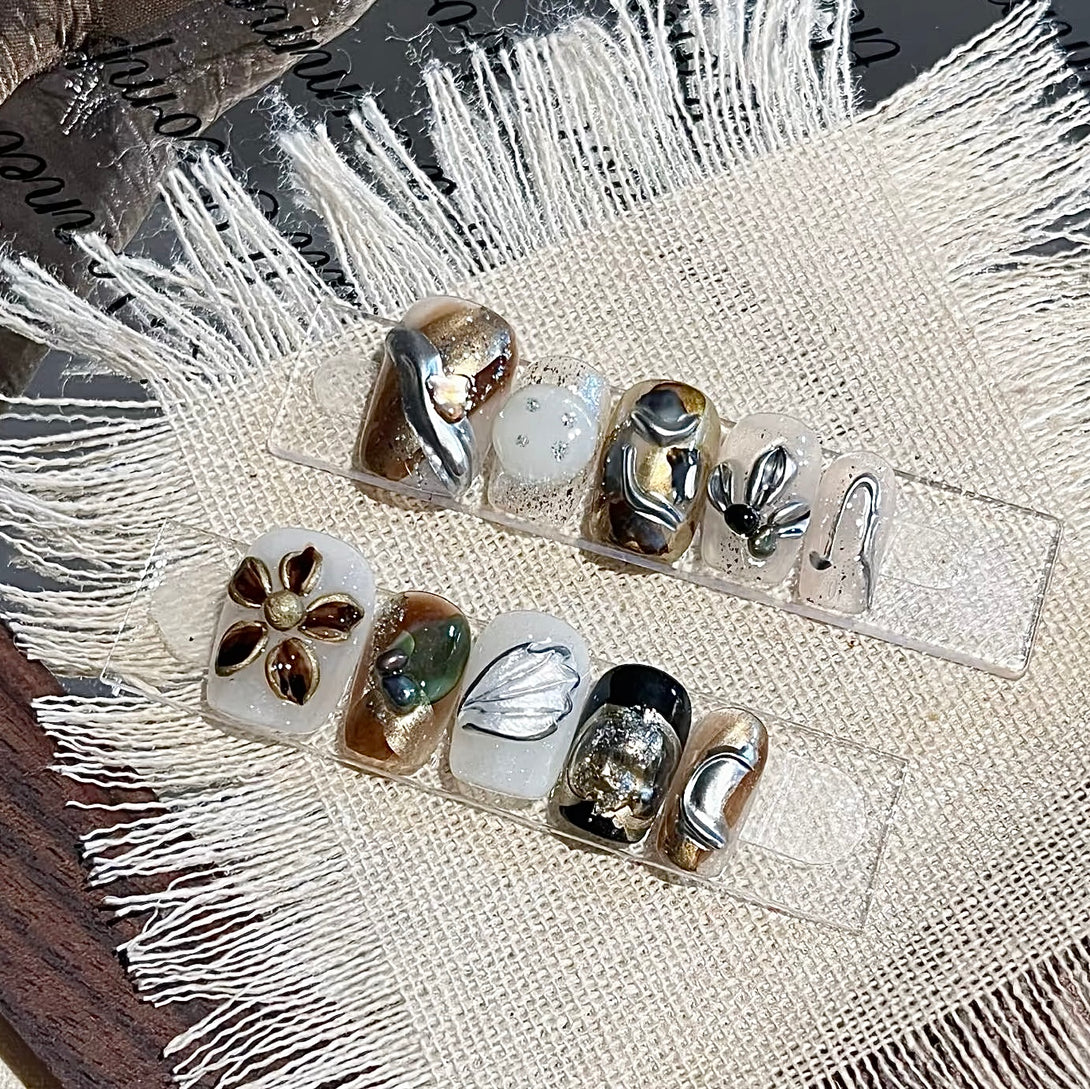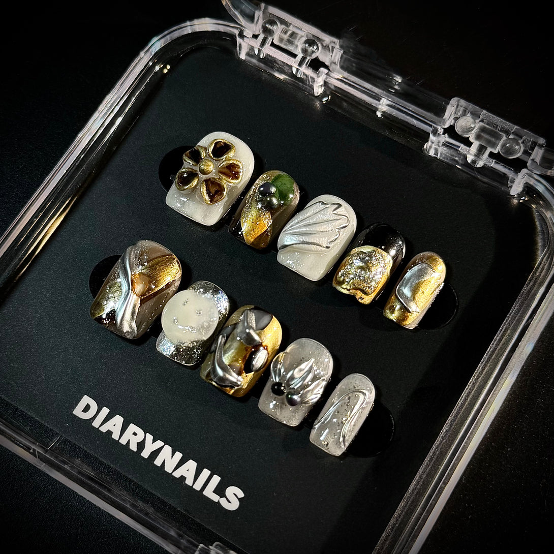 Emberlynn by Diary Nails is a set of press-on nails featuring a stunning 3D amber-toned flower centerpiece paired with shimmering gold foil accents and delicate feather-inspired designs. The mix of metallic textures, bold embellishments, and refined artistry creates a statement-making style that exudes sophistication and opulence. Perfect for special occasions or anytime you want to showcase a high-fashion, artistic edge.