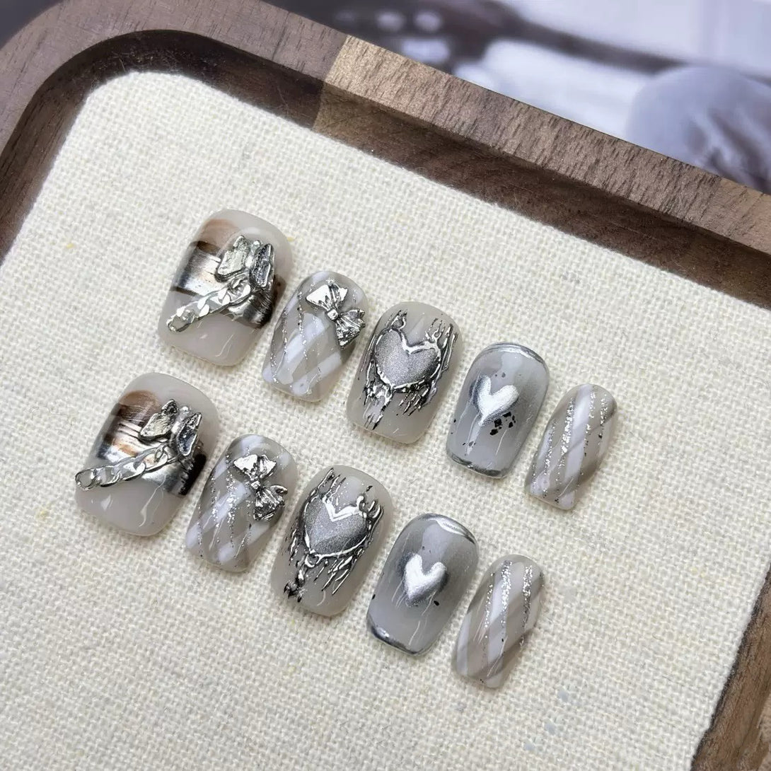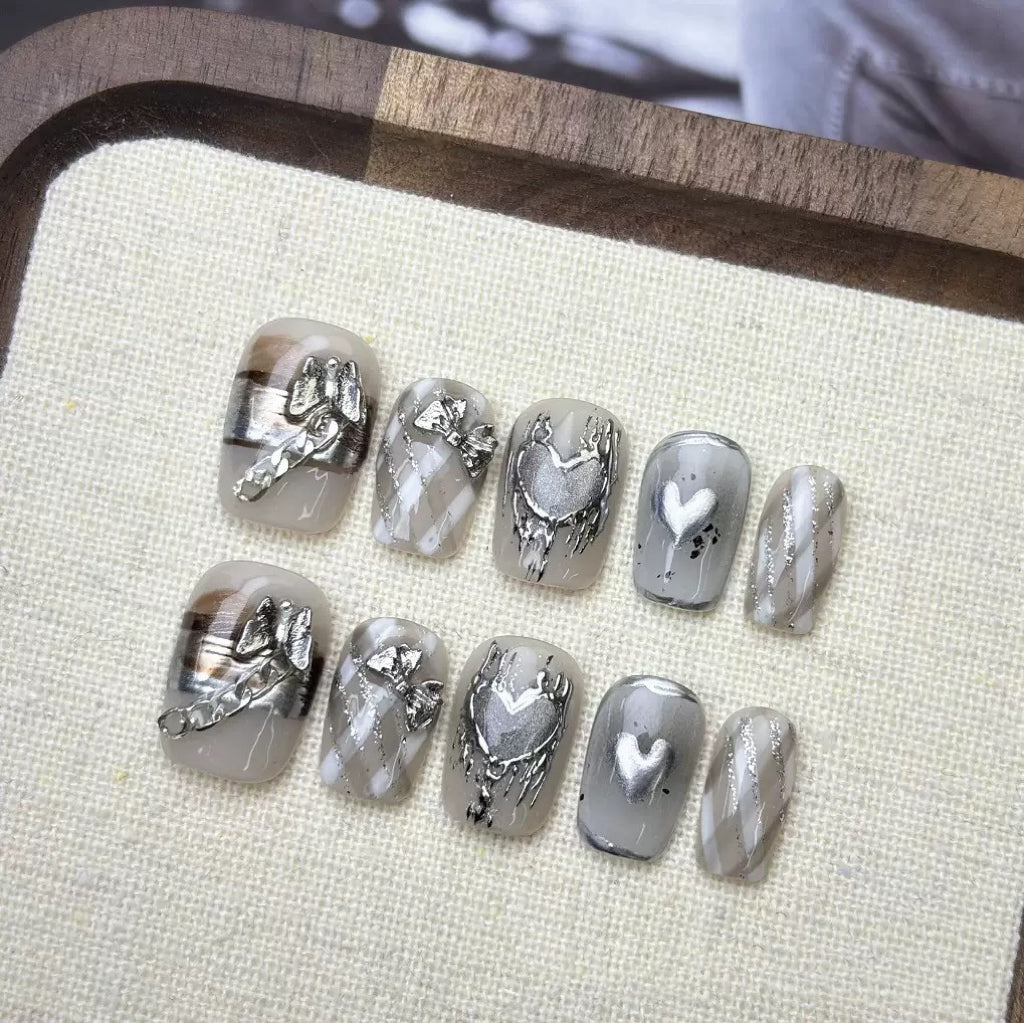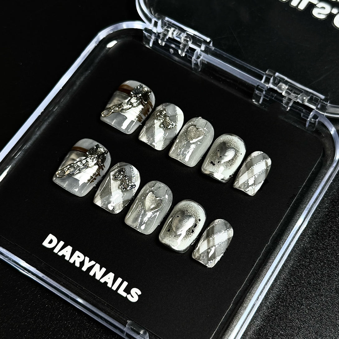 Sliver Heart by Diary Nails is a set of press-on nails featuring metallic hearts, hand-painted diagonal stripes, and striking accents like chrome chains and butterfly charms, these nails blend softness with a bold, mechanical edge. Perfect for those who love edgy elegance and high-fashion statement looks.