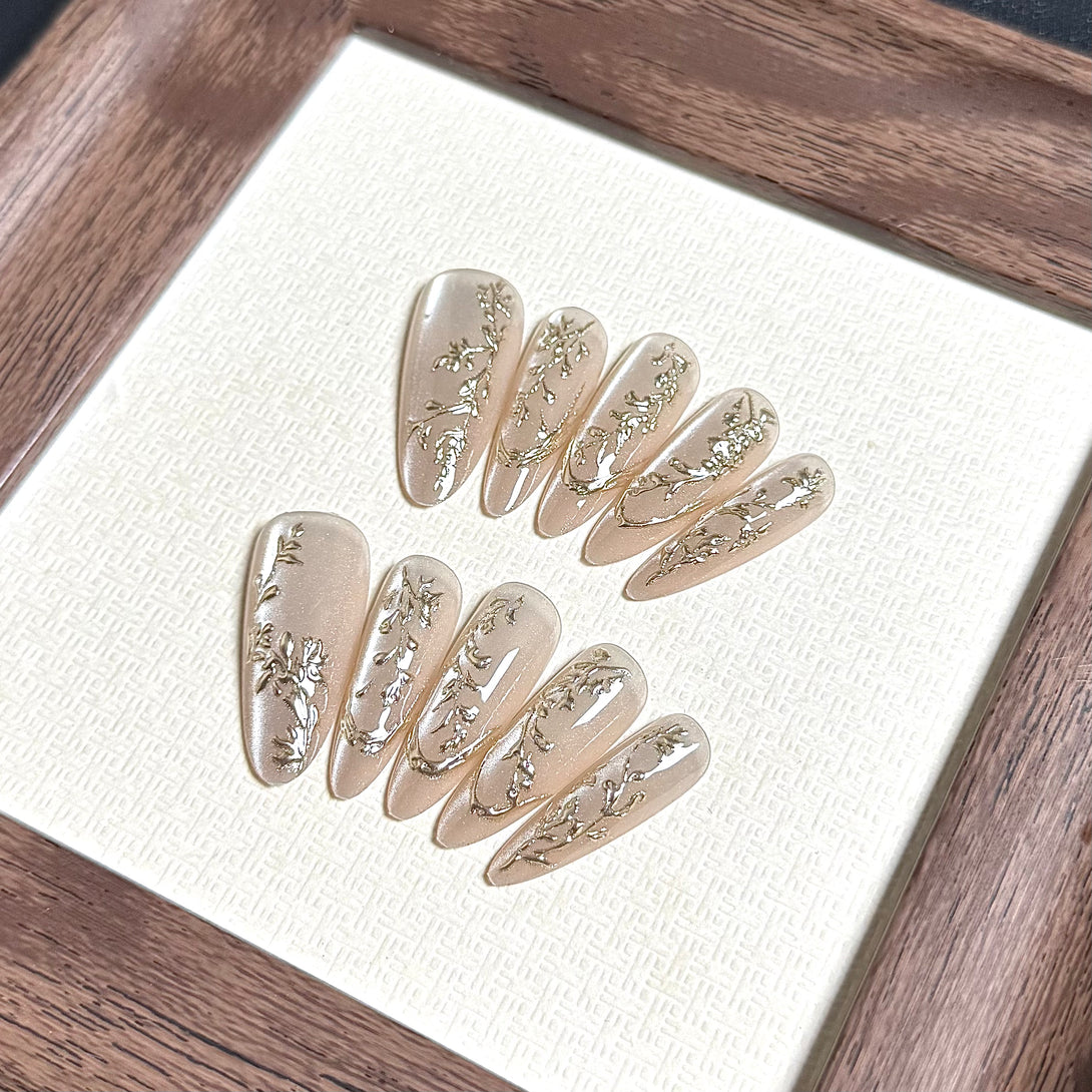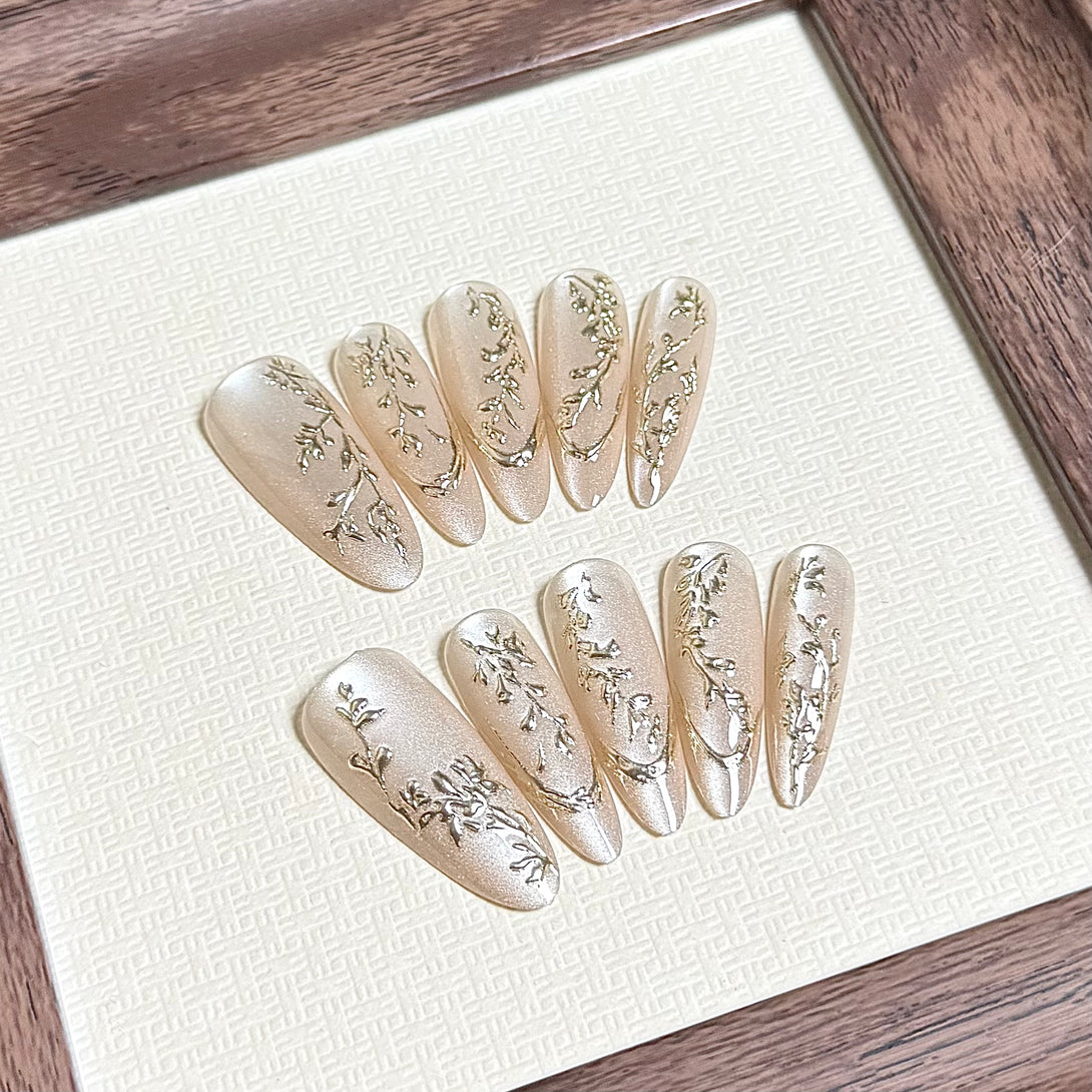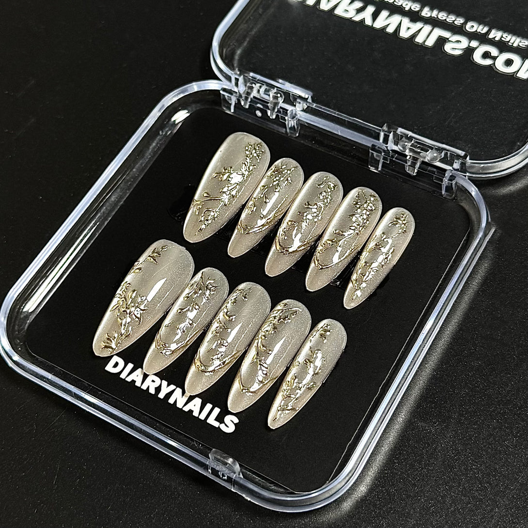 Zlata by Diary Nails is a set of press-on nails featuring a soft, shimmering cat-eye gel base that beautifully elongates the fingers. Delicate hand-painted gold accents add a touch of luxury, while the subtle sparkle catches the light for a refined, graceful finish. Perfect for special occasions or adding everyday sophistication.