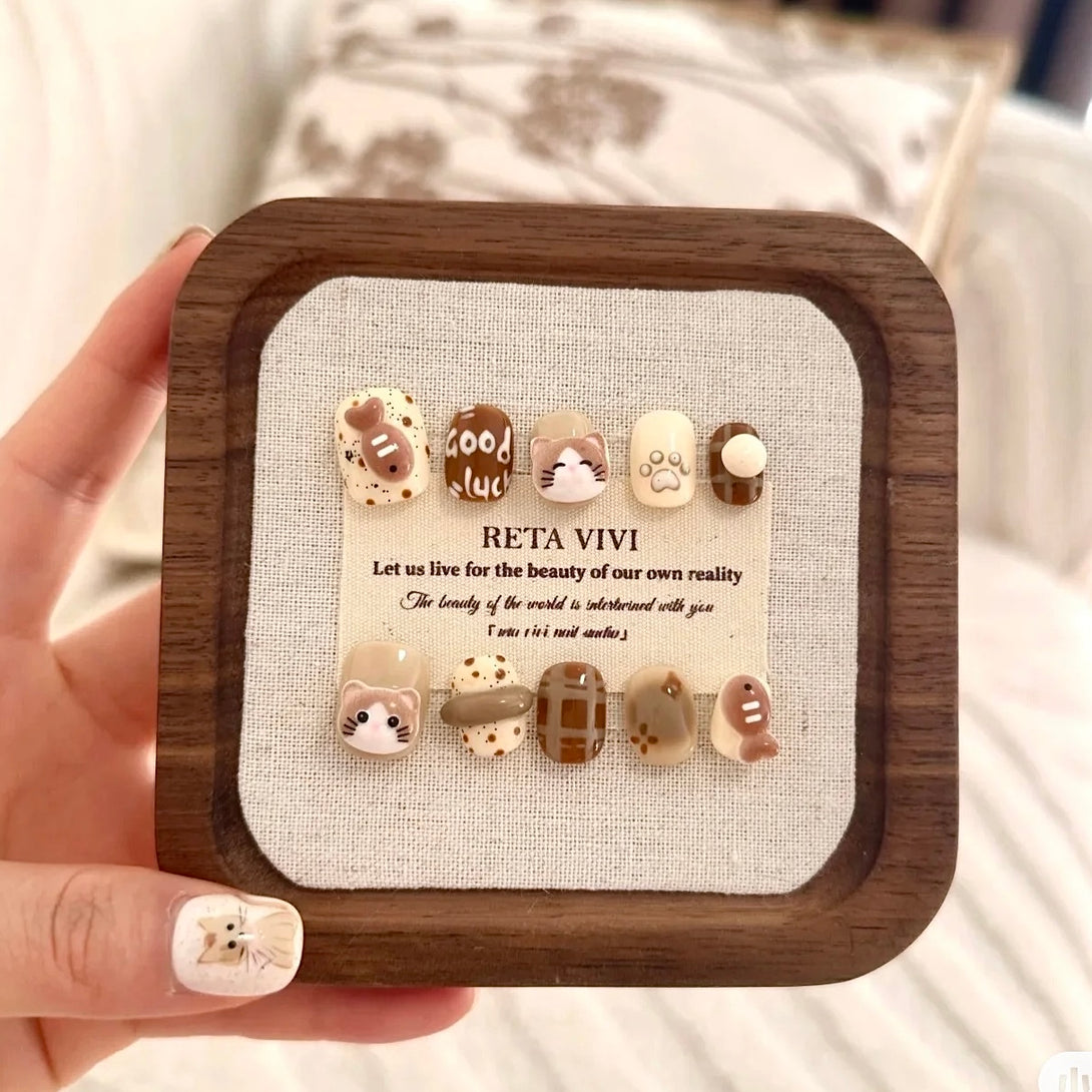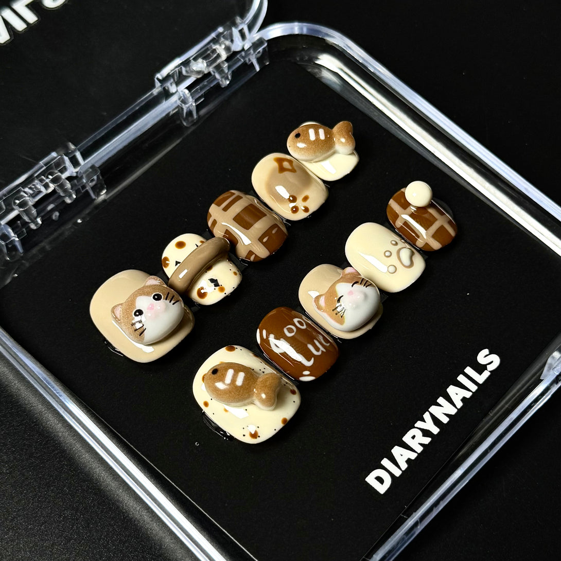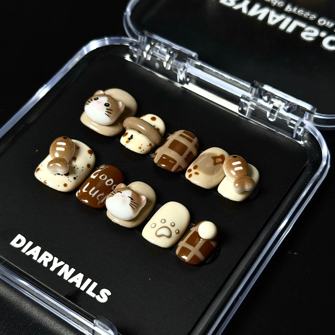 Lucky Cat by Diary Nails is a set of press-on nails featuring charming 3D designs of cute kittens and little fish, each nail is a mini work of art. The warm beige and brown tones, paired with fun stripes and “Good Luck” accents, create a cozy and whimsical vibe. Perfect for animal lovers and anyone who adores kawaii style, these nails add a sweet and quirky touch to your everyday look.