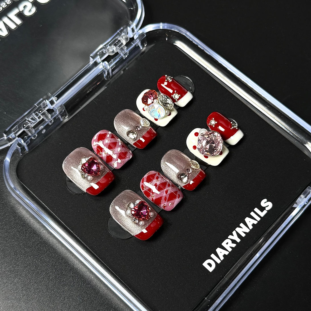 Strawberry Jam by Diary Nails is a set of press-on nails featuring a rich red cat eye French tip combined with shimmering champagne tones. Embellished with sparkling rhinestones, hand-painted crisscross details, and a mix of glitter hearts and cute polka dots, this design is all about bold charm with a flirty twist. Perfect for date nights, or anyone who loves a cute-meets-glam vibe—these nails are made to steal hearts and turn heads.
