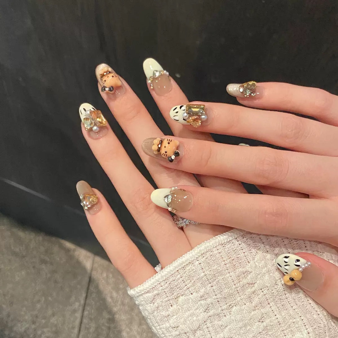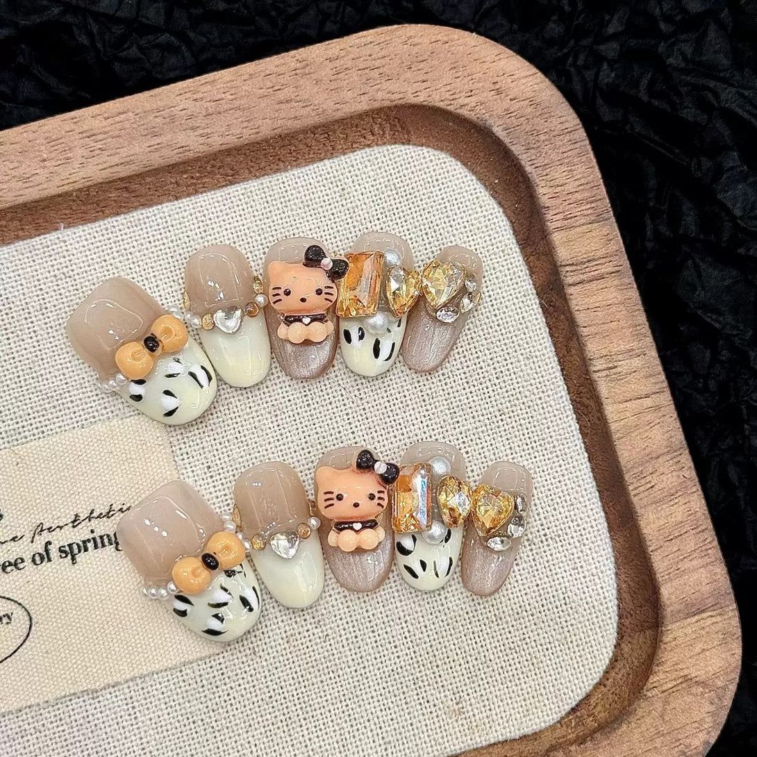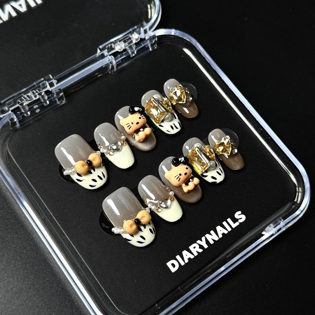 Leopard Kitty by Diary Nails is a set of press-on nails — a bold blend of fierce leopard print, 3D cartoon Kitty charms, and glamorous accents. Each nail features neutral taupe and cream tones adorned with pearl-studded bows, golden rhinestones, and adorable Kitty cat figurines for a look that’s both wild and irresistibly cute. Whether you're heading out for a fun date, a girls’ night, or just want to feel fabulous, Wild Kitty Glam is the ultimate playful-meets-chic manicure statement.