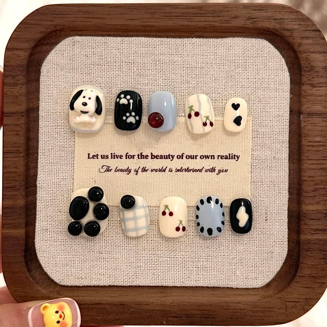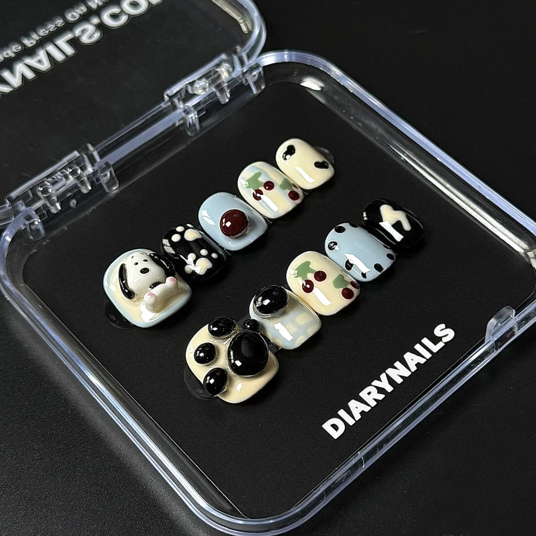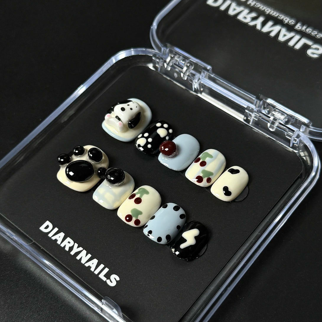 Cherry Dog by Diary Nails is a set of press-on nails featuring a 3D puppy, glossy dog paw accents, and sweet hand-painted cherry details. The soft pastel base is balanced with pops of black, red, and creamy tones, creating a fun yet stylish look. Perfect for dog lovers or anyone who adores cute, whimsical designs, this set brings together cozy vibes and lighthearted charm in every fingertip.