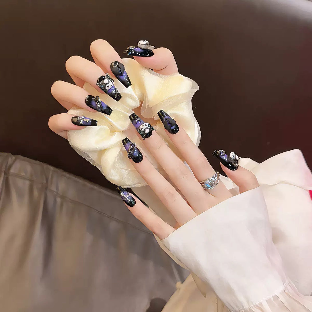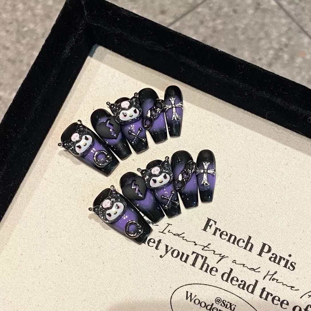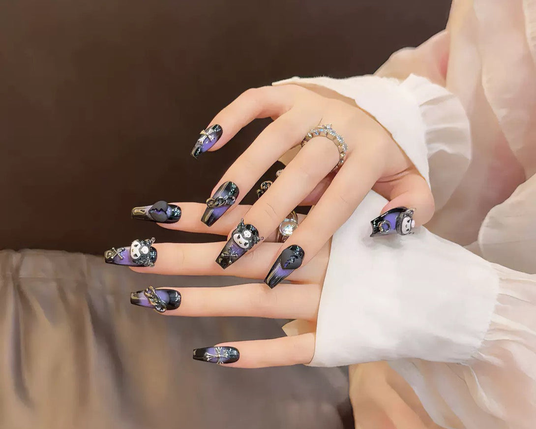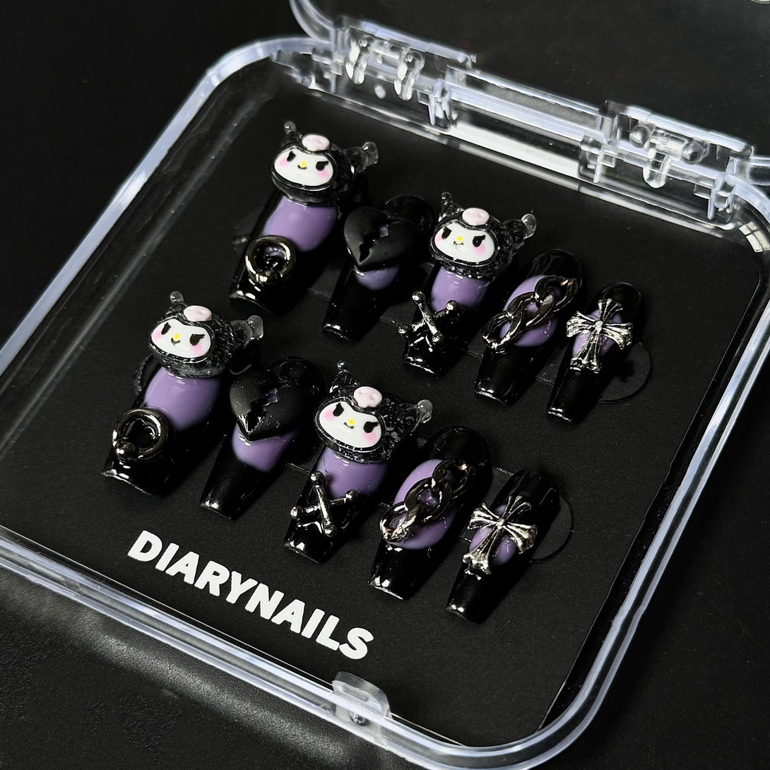 Purple Kuromi by Diary Nails is a set of press-on nails featuring 3D Kuromi charms! The bold black and purple base is paired with metallic accents, crossbones, and chain details for an extra punk vibe. Each nail is uniquely decorated with Kuromi’s mischievous face and gothic metal embellishments, making this set perfect for anyone who loves sweet and rebellious styles. Show off your love for Kuromi and stand out with these statement nails — the ultimate blend of kawaii and cool!