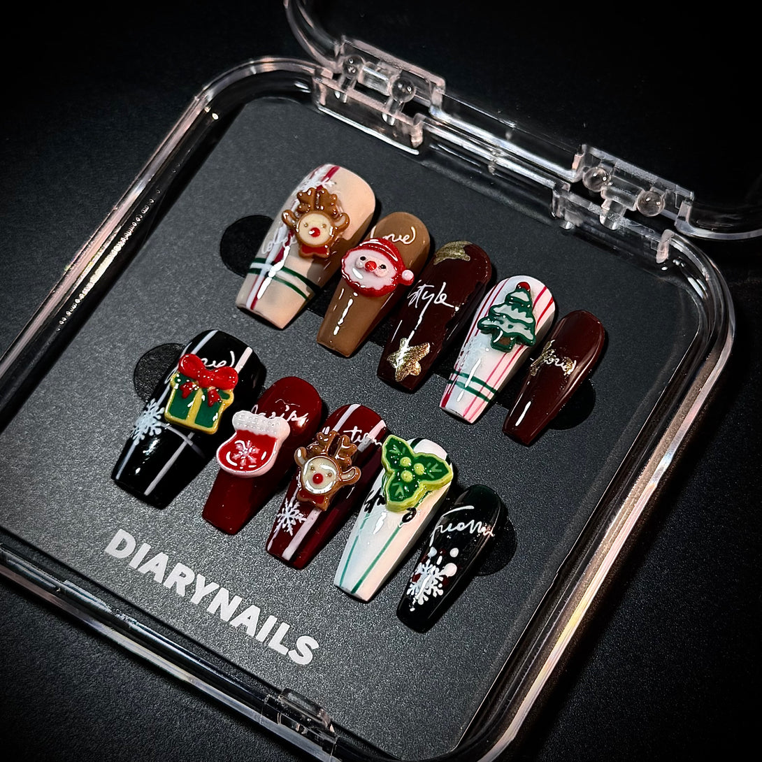 Christmas Gift by Diary Nails is a festive press-on nail set features a fun and whimsical holiday theme with a mix of classic Christmas colors like red, green, white, and gold. Each nail is adorned with 3D holiday embellishments, including reindeer, Santa Claus, Christmas trees, snowflakes, and presents. The designs are playful and cheerful, perfect for the Christmas holiday season, with a combination of glossy finishes and intricate details that bring out the festive spirit. This nail set is perfect for anyone looking to embrace the holiday season with a fun, festive manicure that stands out and spreads holiday cheer.