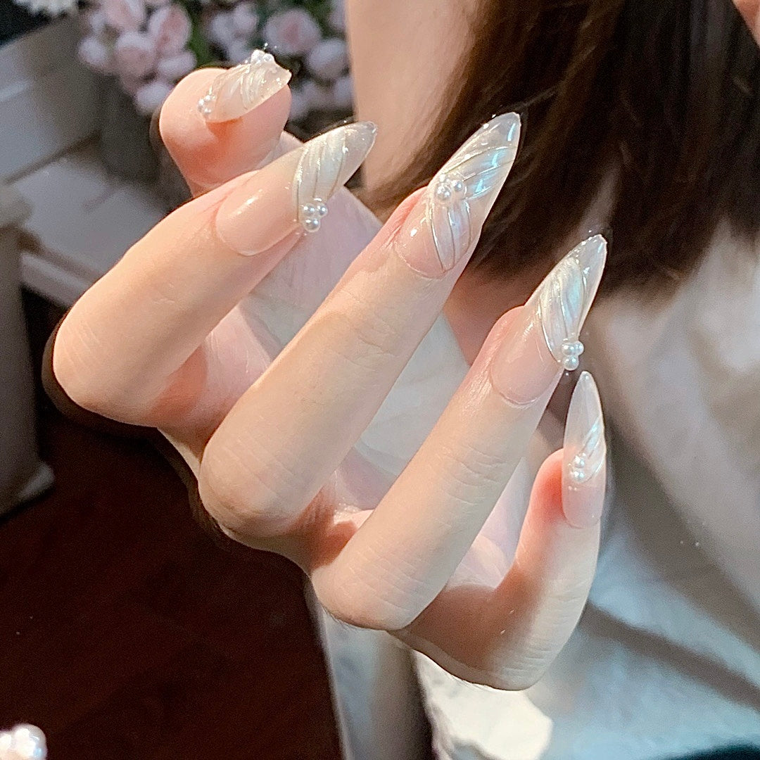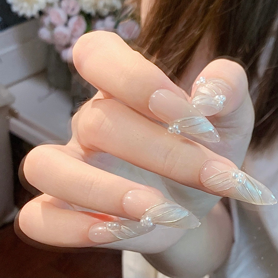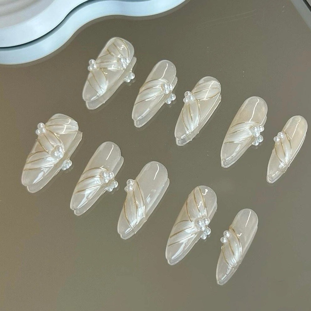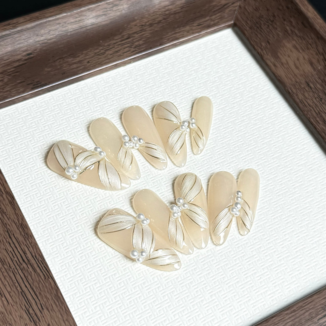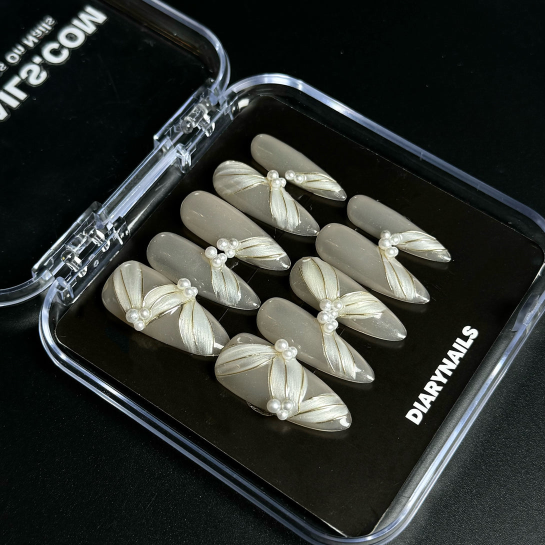 Cotton Daisy by Diary Nails is a set of press-on nails featuring intricate 3D ribbon designs, shimmering pearl accents, and captivating cat-eye gemstone effects. This design exudes sophistication and class, making it the perfect accessory for weddings, formal events, or any moment you want to shine.
