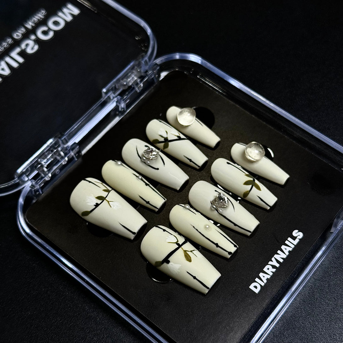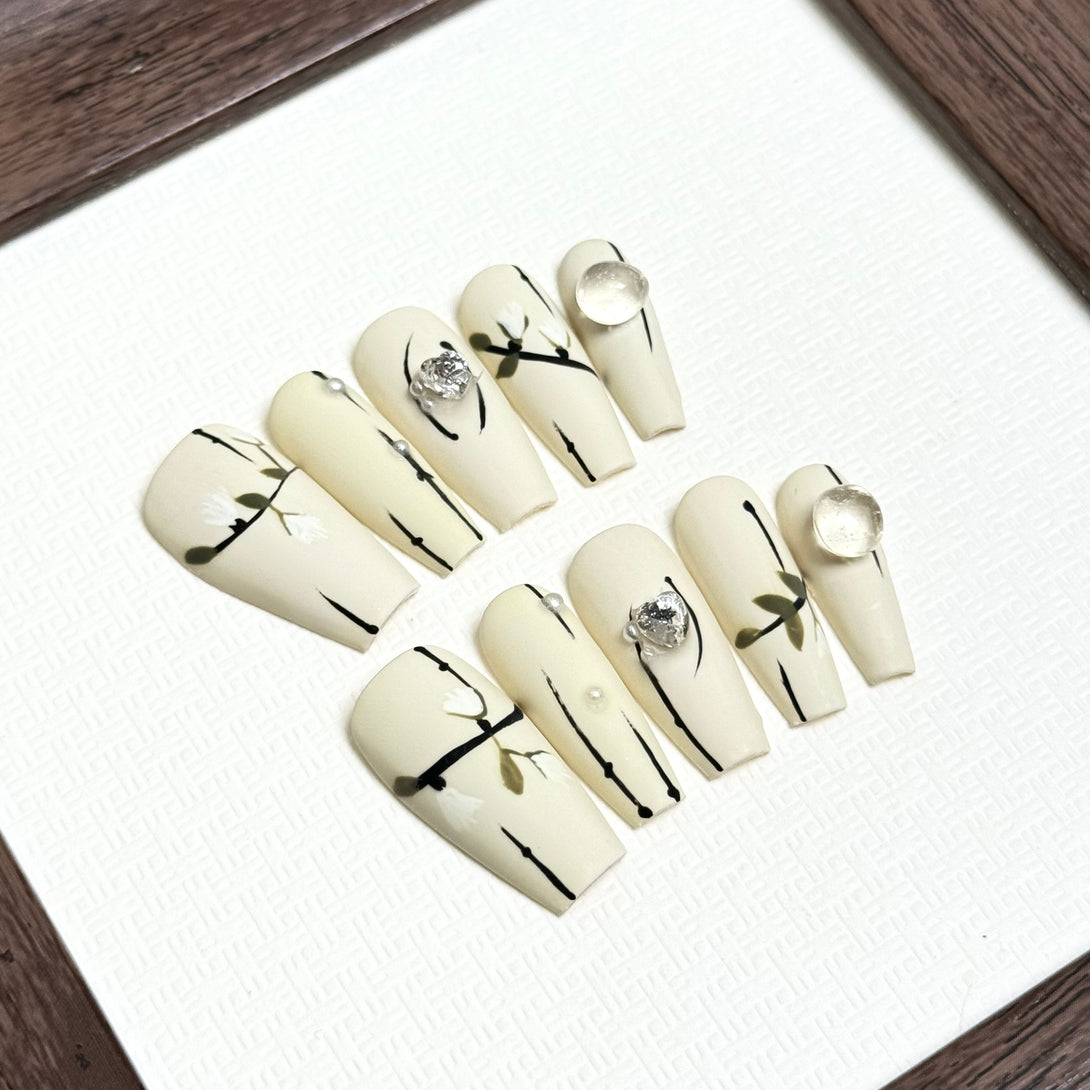 Cyan Bamboo by Diary Nails is a minimalist yet elegant press-on nail set features a clean white base with delicate, nature-inspired black and green bamboo detailing. The design includes subtle branches with tiny bamboo leaves, creating a sophisticated and organic look. Some nails are adorned with small gemstones, adding a touch of sparkle to the understated aesthetic. Also these are hand-painted flowers. The matte finish enhances the refined and modern feel of the set. This nail set is perfect for individuals who appreciate understated beauty and want to embrace a nature-inspired, minimalist aesthetic with a touch of sparkle.