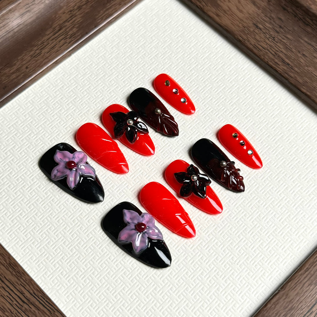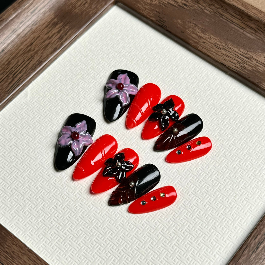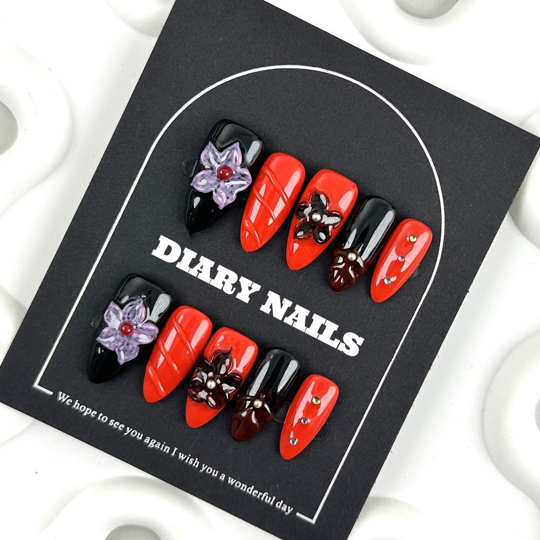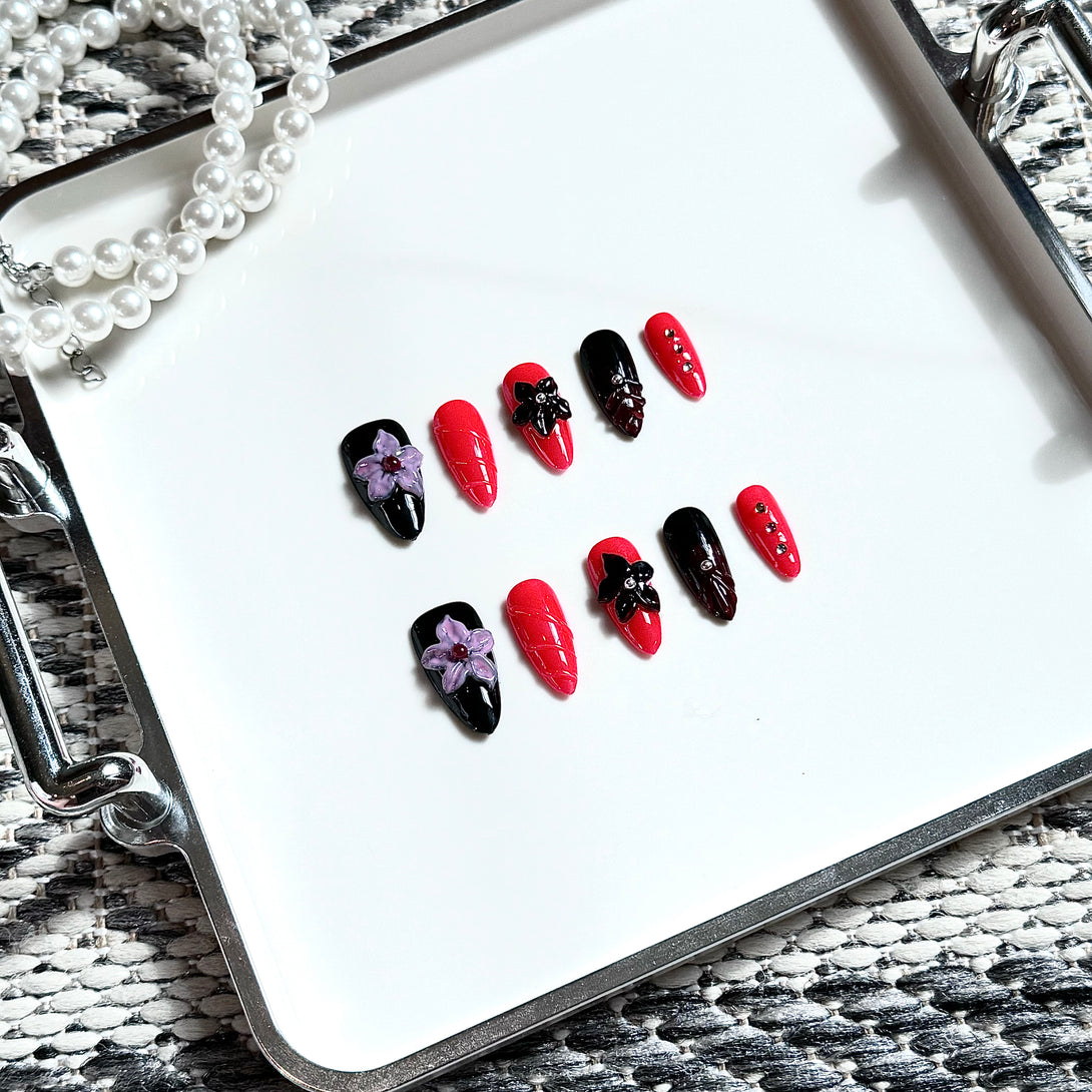 Dahlia by Diary Nails make a bold and sophisticated statement with this striking red and black floral press-on nail set. Each nail is adorned with intricate 3D floral embellishments, creating a unique and eye-catching look. The deep red and black combination exudes confidence and elegance, while the floral details add a touch of femininity. Ideal for special occasions or when you want to add a bit of drama to your everyday style, this nail set offers both elegance and impact.