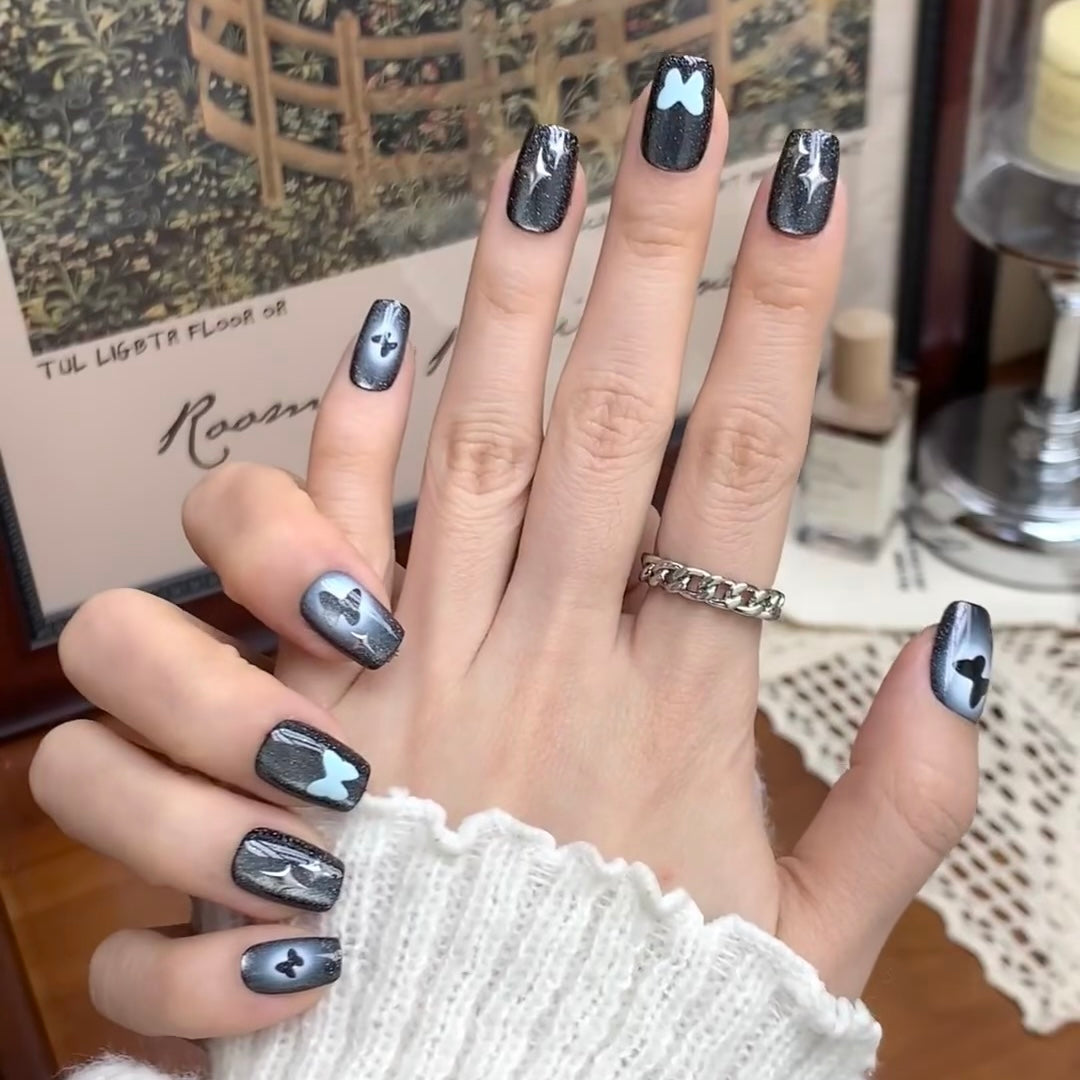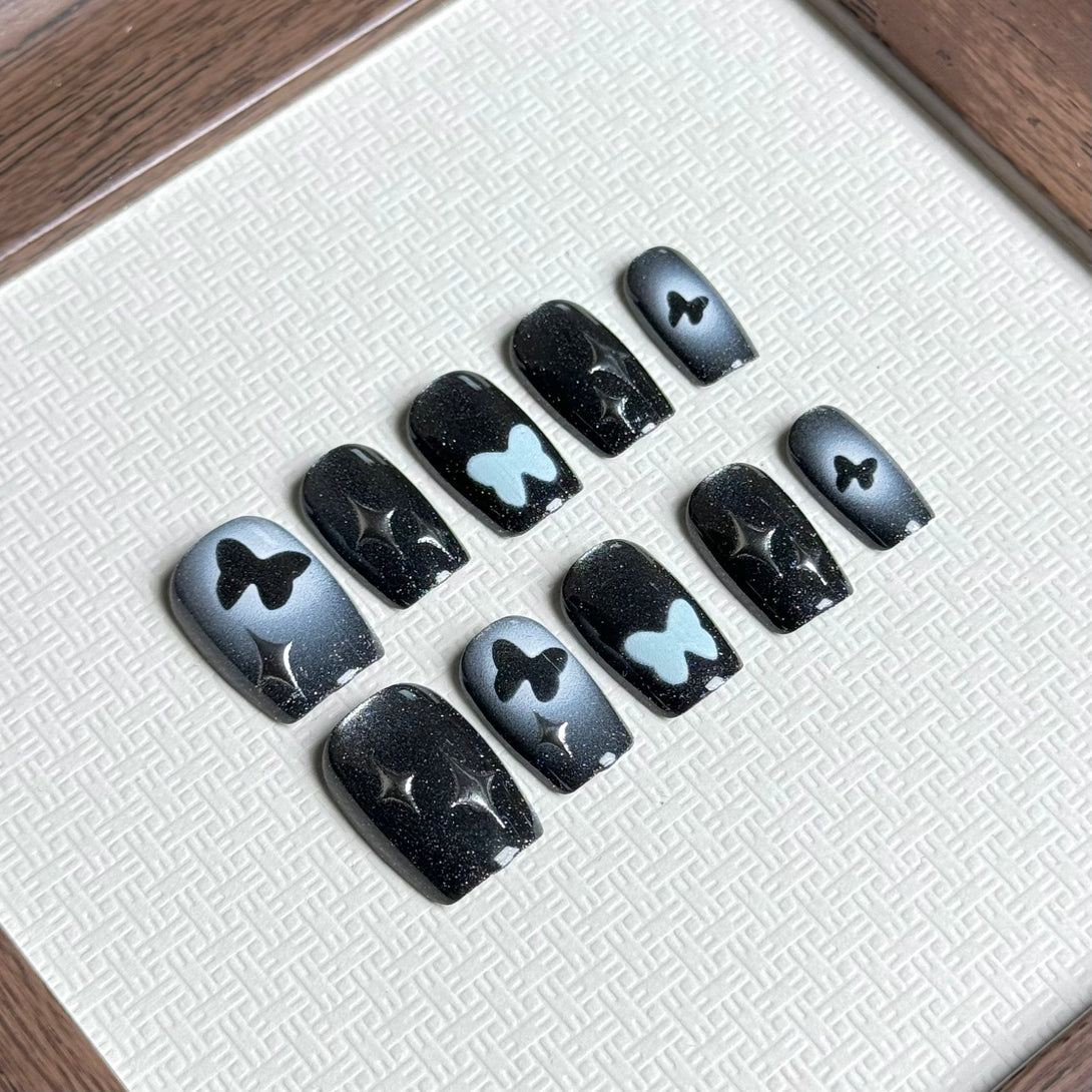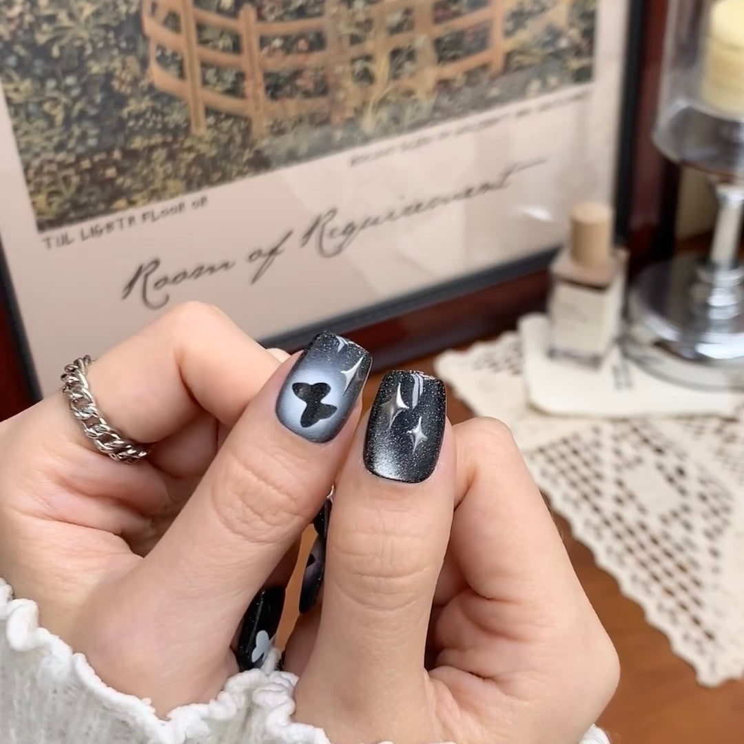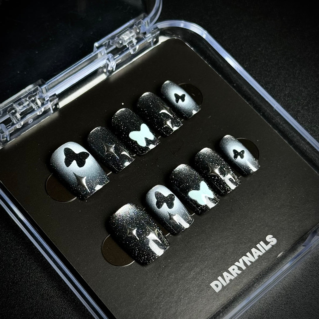 Dark Butterfly by Diary Nails is a set of black cat-eye press-on nails, featuring a striking shimmer effect and intricate butterfly designs. Enhanced with 3D star embellishments, this set combines mystery and elegance, perfect for any occasion where you want to stand out. Ideal for evening events, parties, or when you want to add a touch of drama to your style, these nails are perfect for anyone who loves chic and edgy designs!