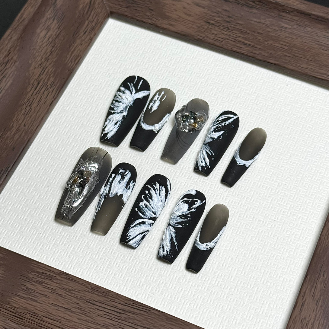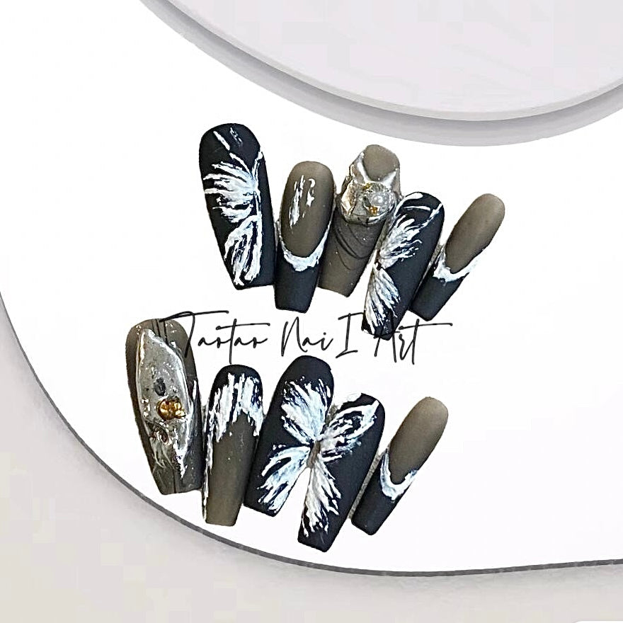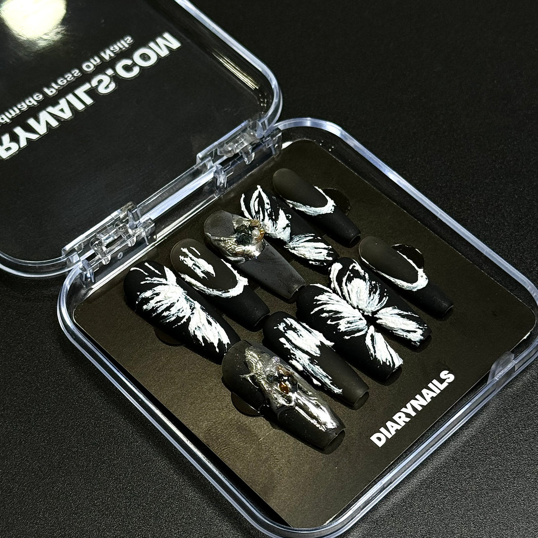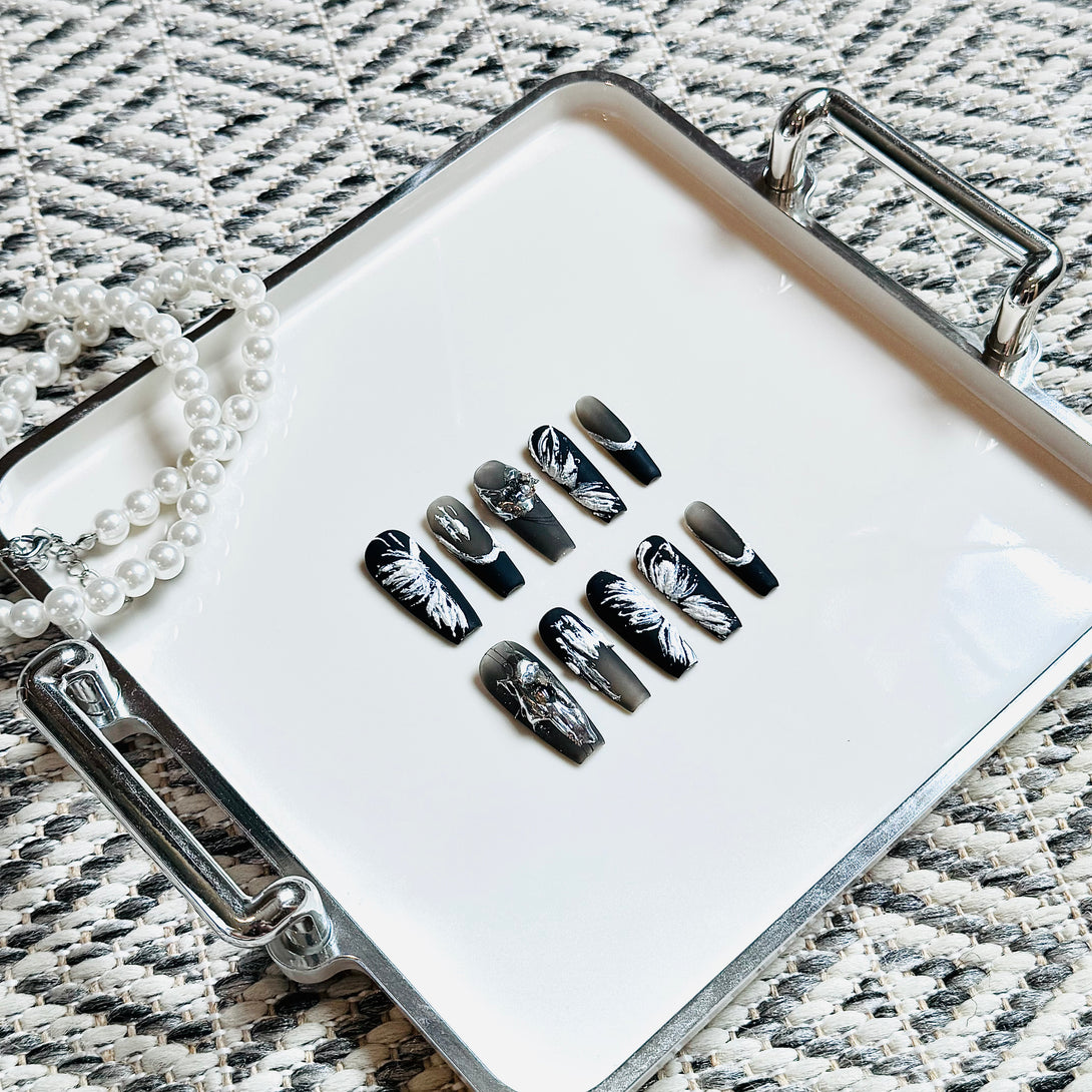 Dreamy Butterfly by Diary Nails is make a bold statement with this stunning black and white press-on nail set, featuring intricate feather-inspired designs and sparkling crystal embellishments. The sleek black base provides a dramatic backdrop for the hand-painted white feathers, just like a beautiful butterfly, creating a striking contrast that exudes elegance and sophistication. Perfect for both formal events and everyday wear, this nail set is designed to give you a high-fashion look with minimal effort.