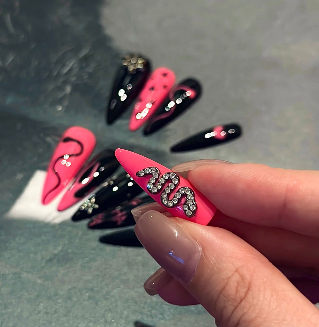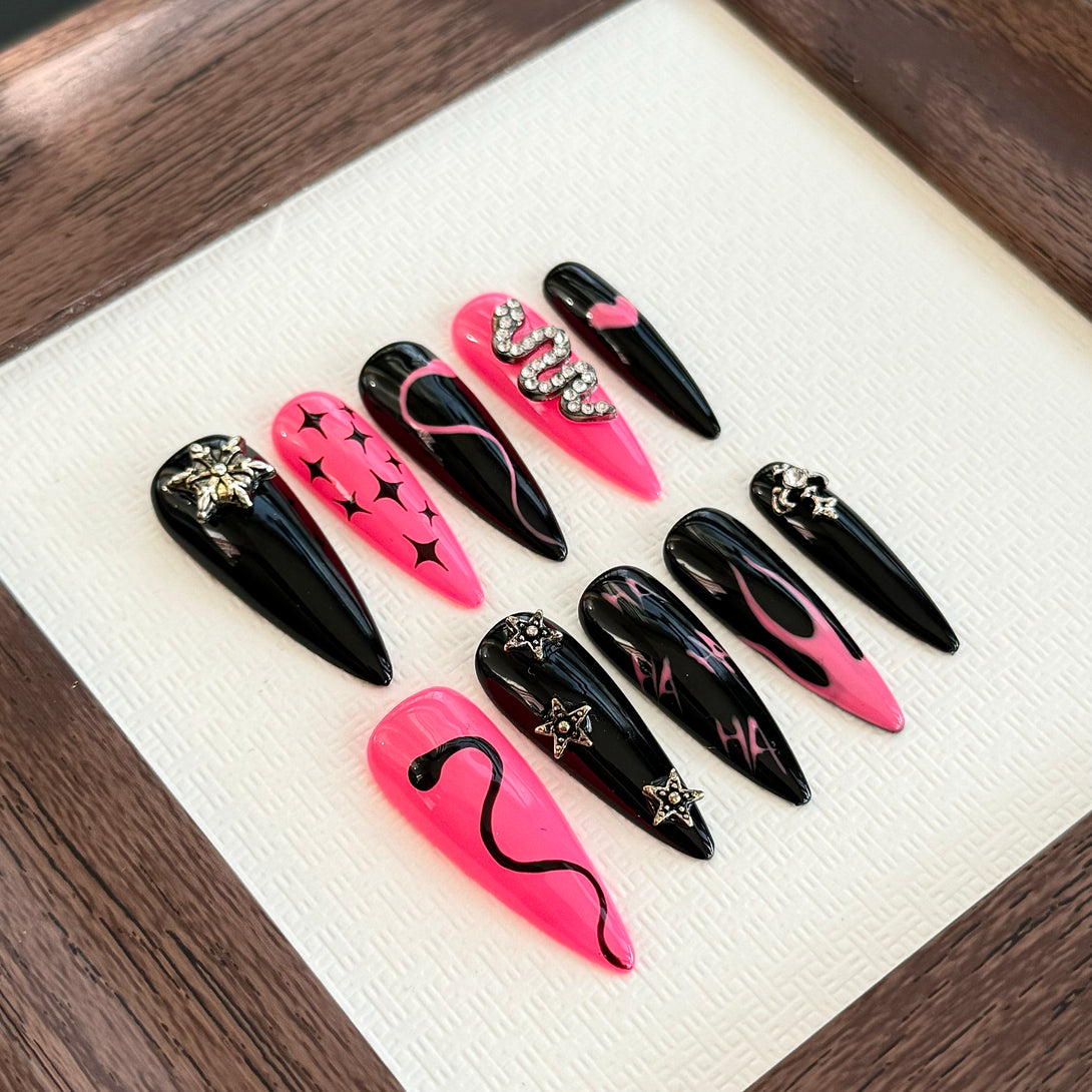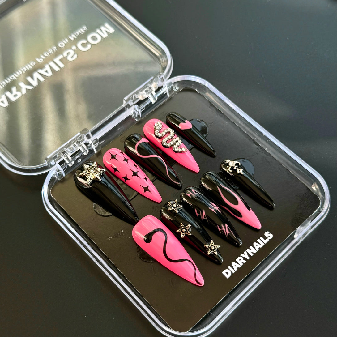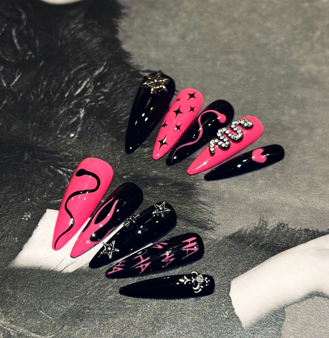 Ghost Sweetheart by Diary Nails is a bold and edgy press-on nail set combines vibrant pink with deep black for a striking contrast. Featuring playful designs such as flaming details, and hand-painted graffiti elements, this set captures a rebellious spirit. Embellished with rhinestone snakes, hearts, and star charms, it adds a touch of glamour to the punk-inspired look. These nails are perfect for anyone looking to make a daring statement with their style. Ideal for nights out, special events, or simply adding a pop of attitude to your everyday fashion.