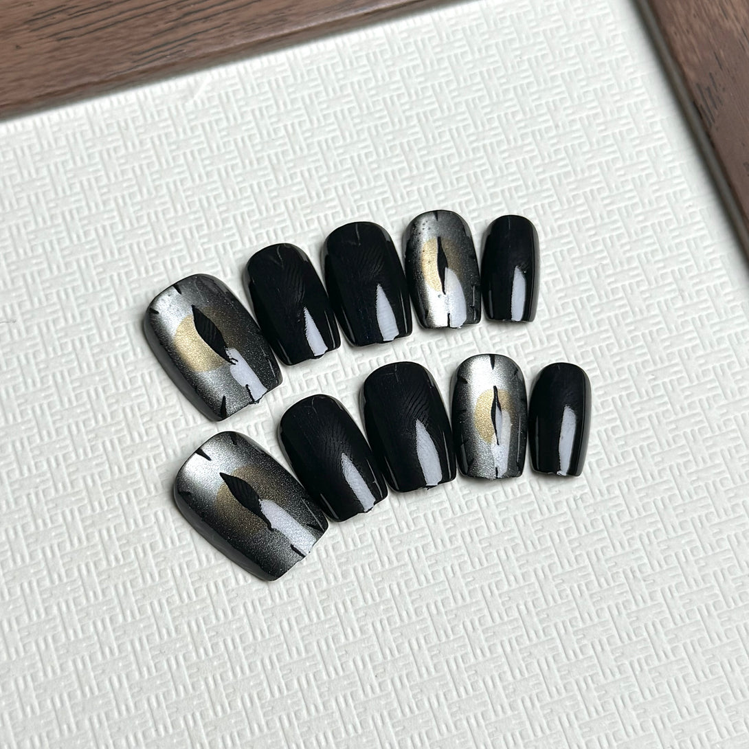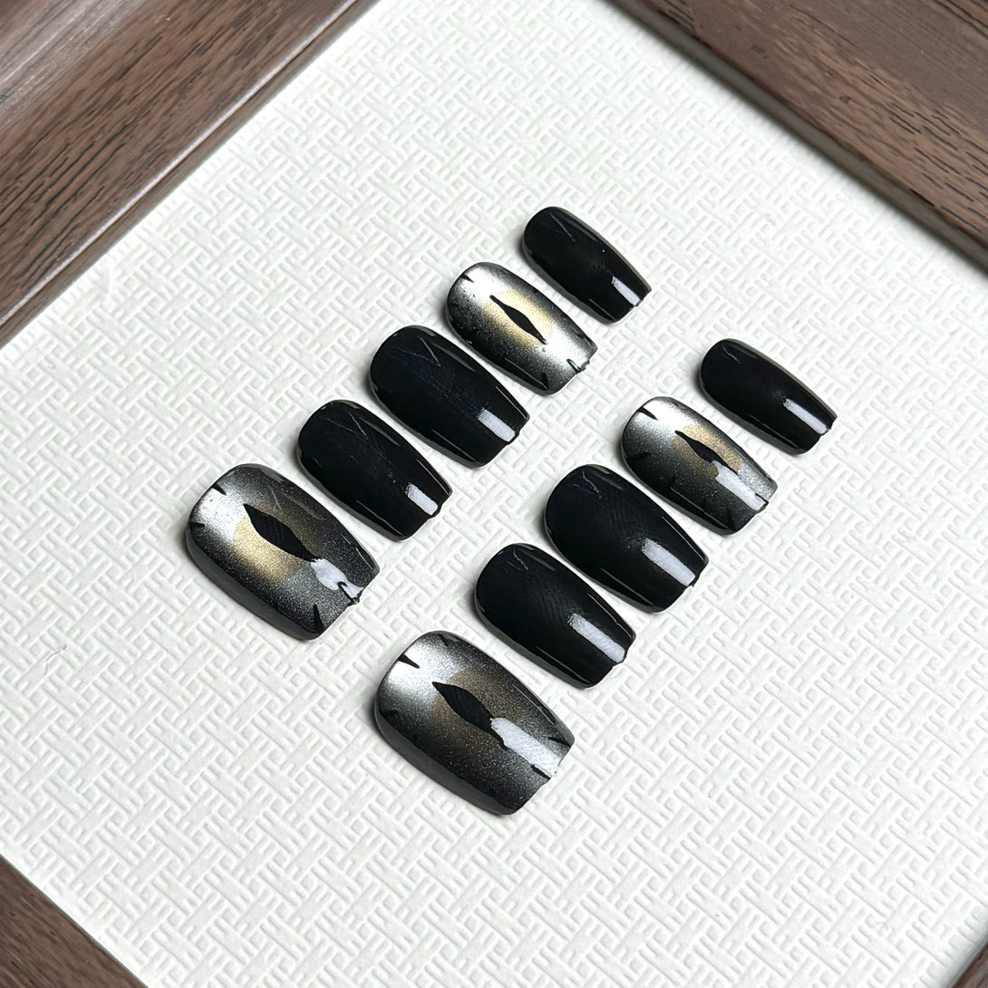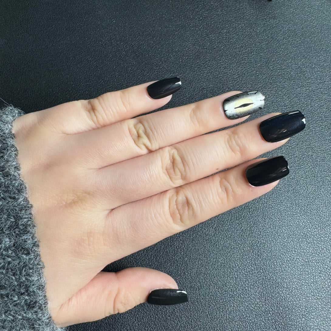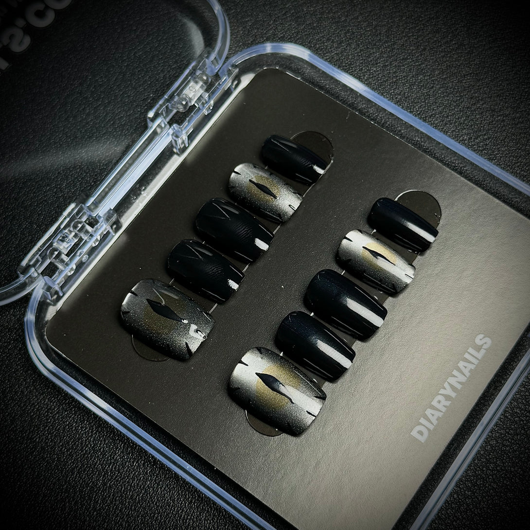 Grey Devil Eye by Diary Nails is a set of press-on nails features gray cat-eye designs and a sophisticated black base. Intricate gray eye illustrations that create a bold, enigmatic statement. A shimmering gradient in silver and gray for added depth and drama. Make a statement with these dramatic and elegant nails that exude timeless charm and allure!