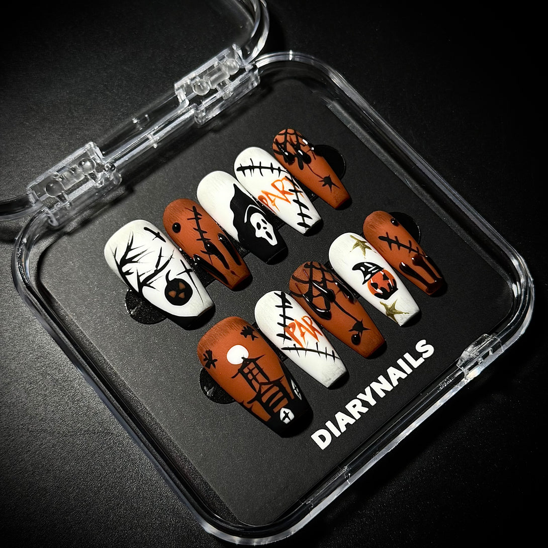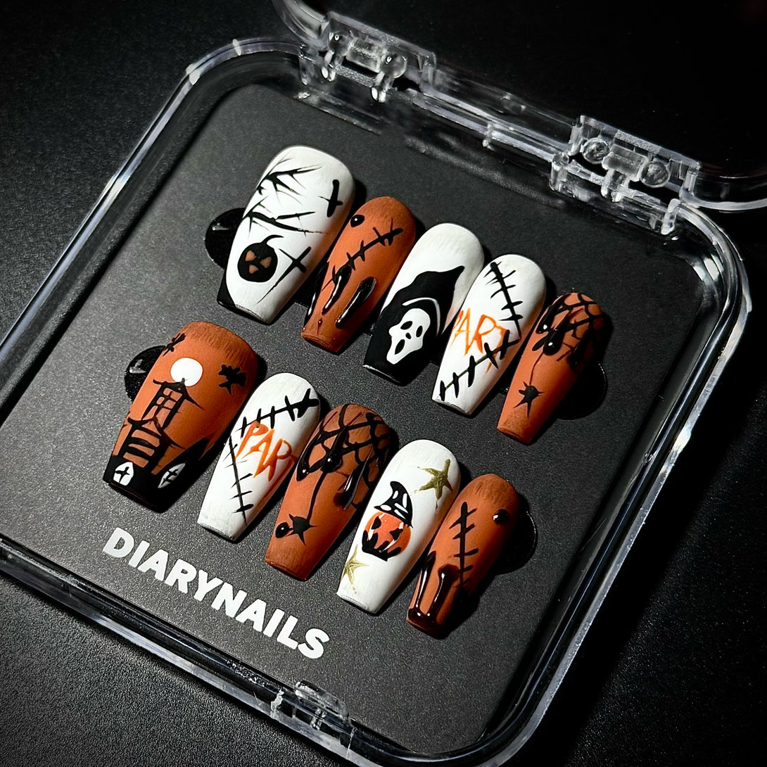 Hallo Pumpkin by Diary Nails is a spooky season with this Halloween-themed 3D press-on nail set! Designed to embrace the eerie vibe of the holiday, these nails feature a combination of black, orange, and white with creepy 3D elements like skulls, pumpkins, spider webs, and haunting silhouettes. Each nail tells a spooky story, from grinning jack-o'-lanterns to stitched-up designs, perfect for anyone wanting to showcase their Halloween spirit. Whether you're attending a Halloween party or simply enjoying the festive season, these nails will be a show-stopping addition to your costume.