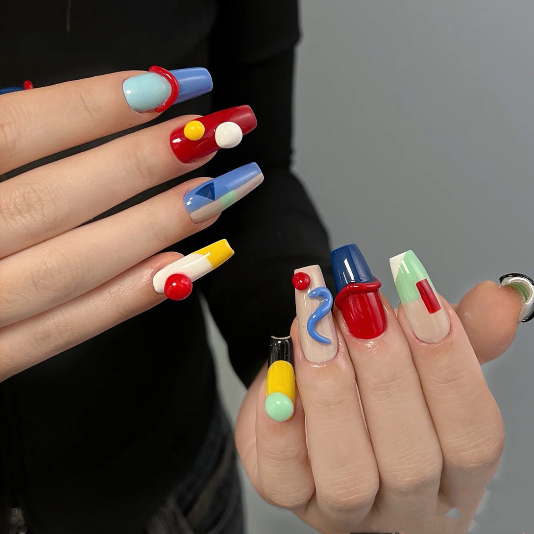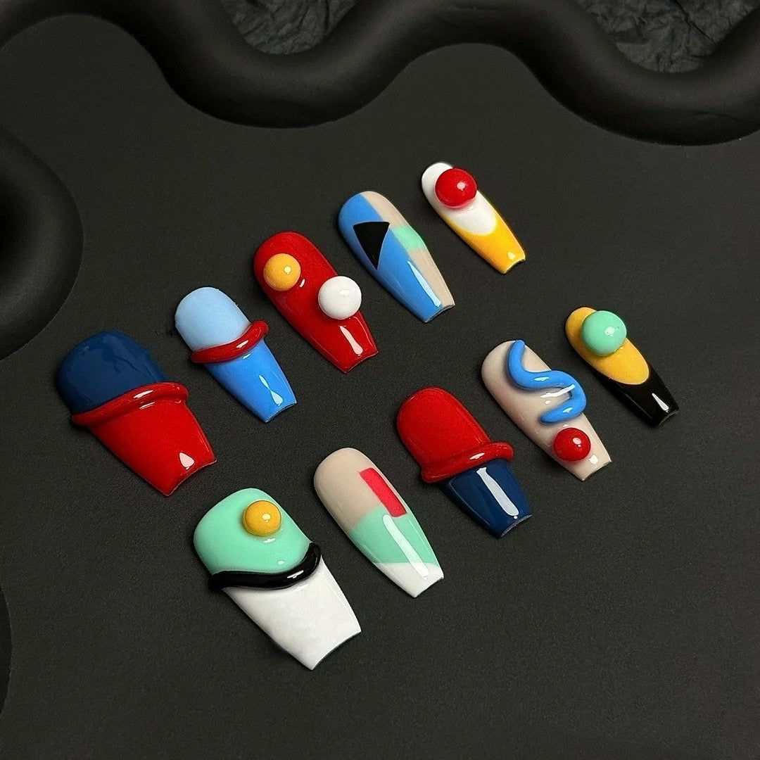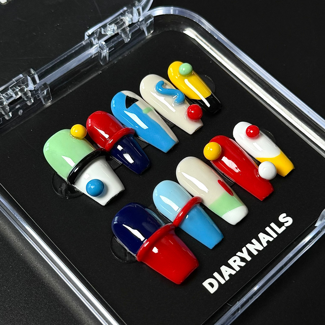 Harley by Diary Nails is a Playful 3D Press-On Nails, a fun and vibrant set designed to bring out your inner child. These nails feature bold, primary colors with whimsical, three-dimensional elements that add a pop of personality to your look. The abstract shapes and playful design evoke a sense of creativity and joy, making them perfect for those who want to express their unique style with a fun twist. These nails are ideal for anyone looking to add a bit of cheer and imagination to their daily fashion.