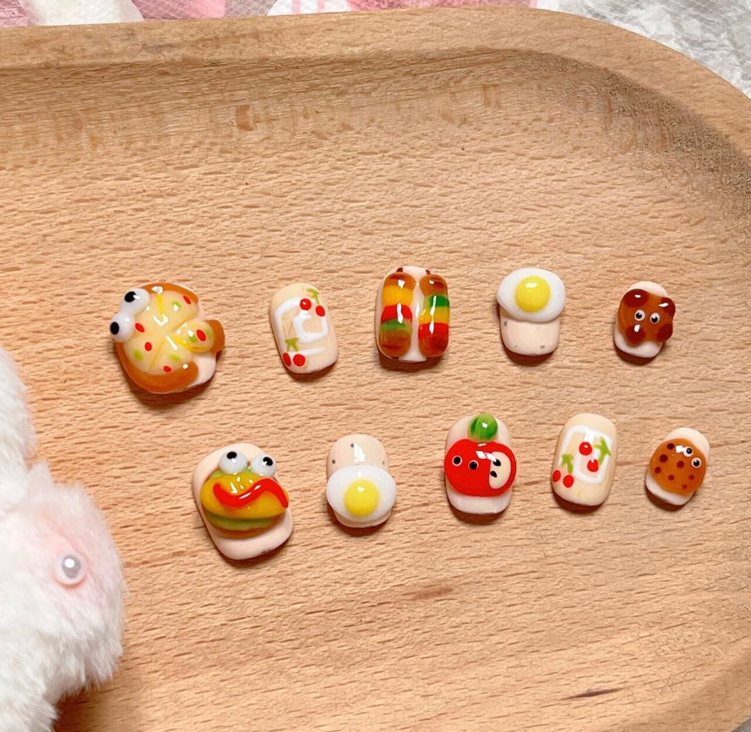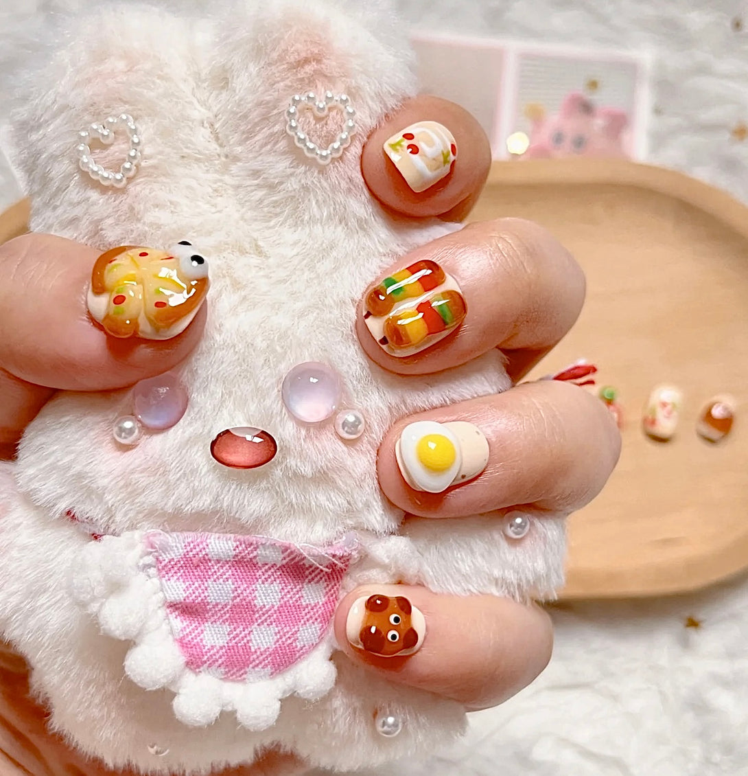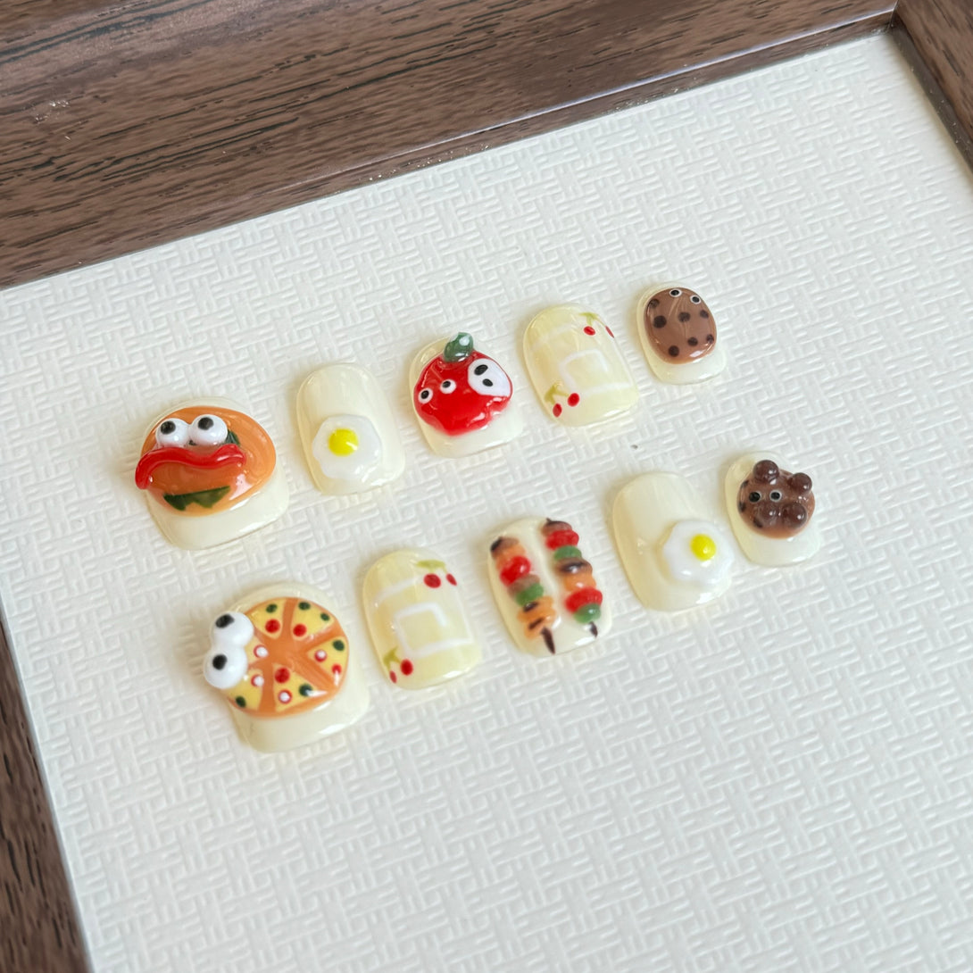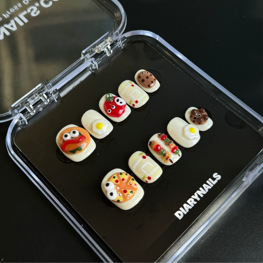 Hawaii Pizza by Diary Nails is a set of press-on nails is designed with a delightful theme of food elements, making it uniquely appetizing. The collection features intricately detailed 3D art such as sunny-side-up eggs, slices of pepperoni pizza, and chocolate chip cookies. This fun and quirky manicure set captures the spirit of a lively pizza party right at your fingertips, perfect for food enthusiasts or anyone looking to add a whimsical, tasty touch to their look.