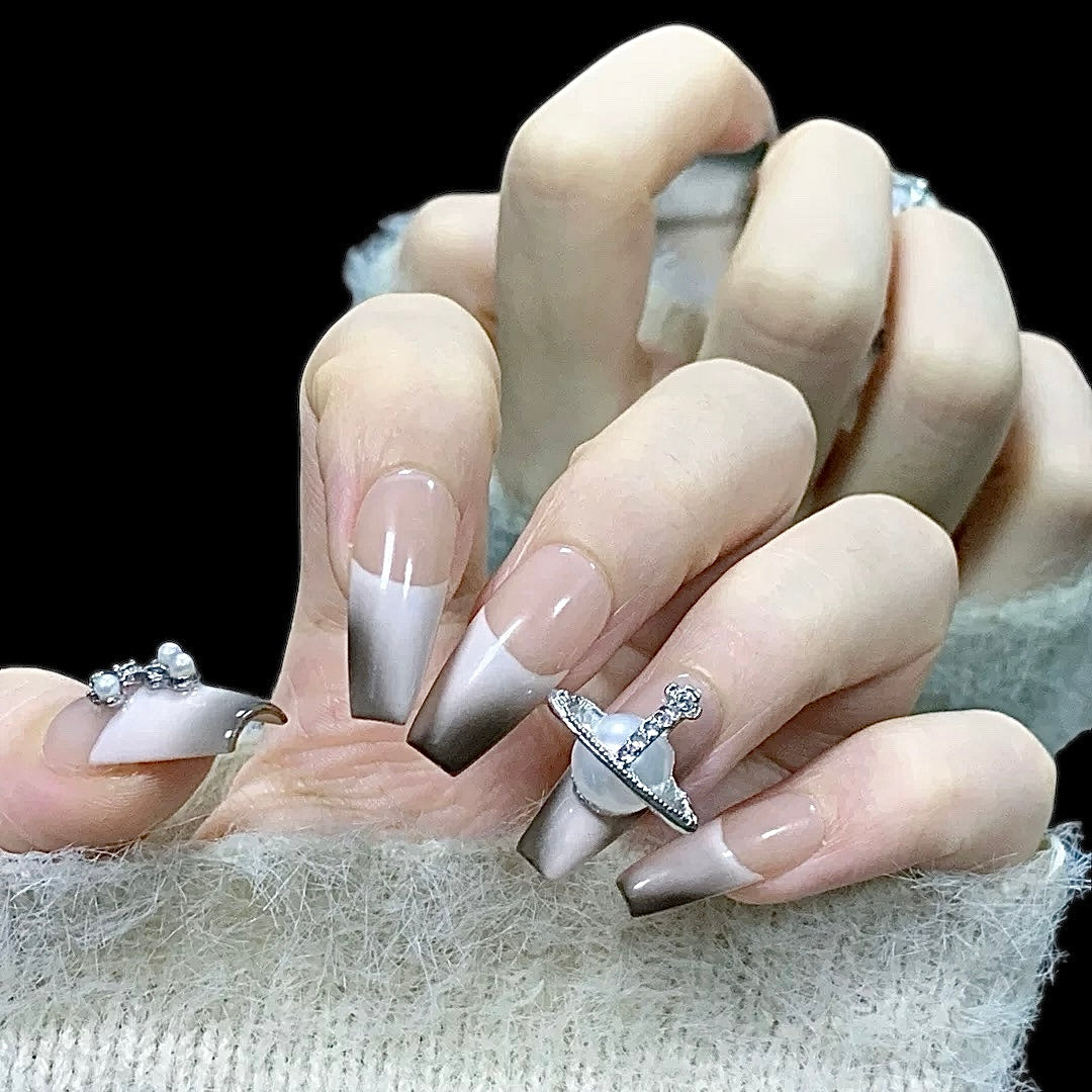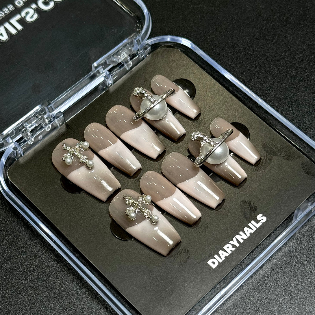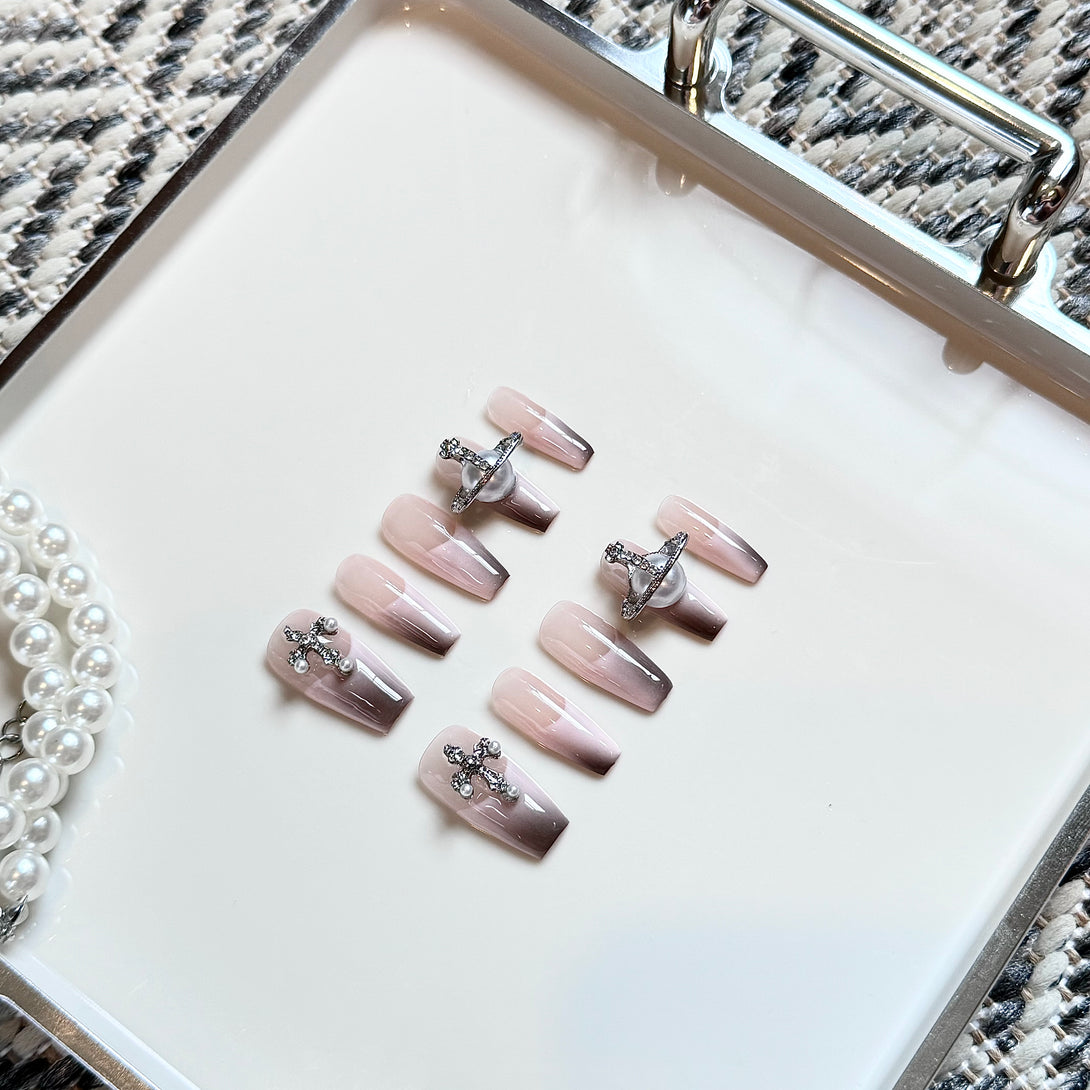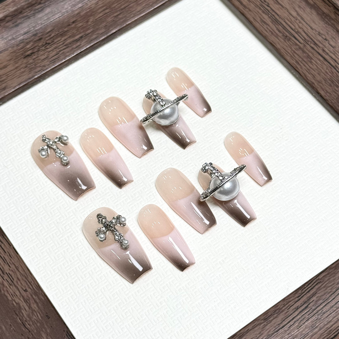 Jupiter by Diary Nails is a set of featuring a soft pink ombre design and beautiful planetary style. These nails exude elegance with their gradient effect transitioning from a delicate pink to a soft taupe. The set also includes embellishments in the form of crosses and planetary symbols, adding a touch of glamour and sophistication. Perfect for those who want to make a statement, this set offers a refined yet bold look suitable for any occasion, whether casual or formal.