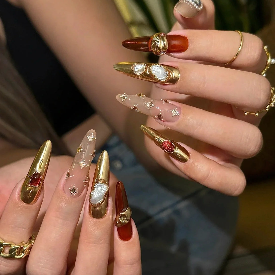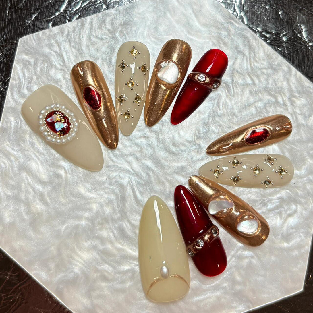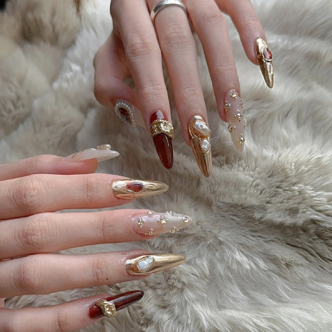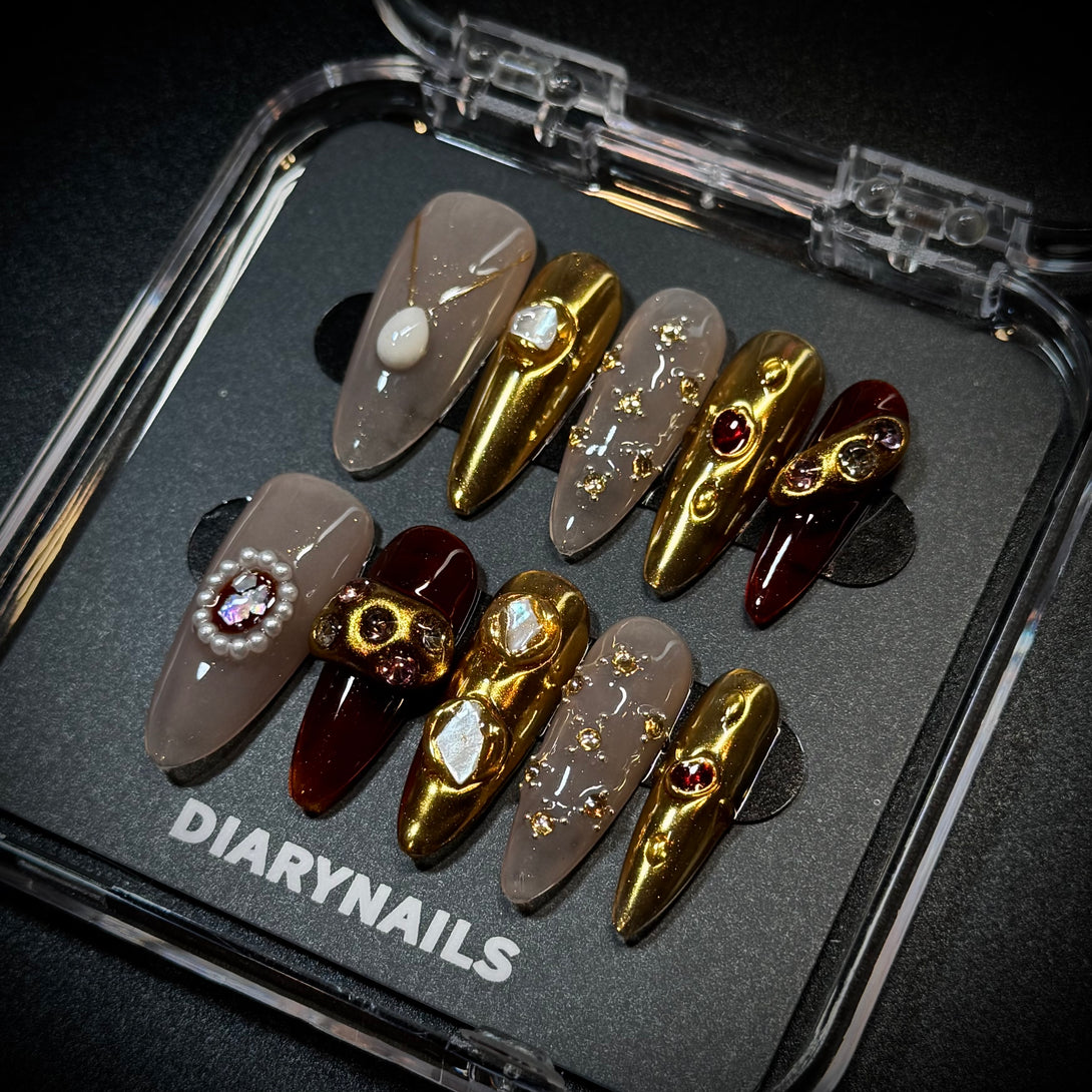 La Reine by Diary Nails is a set of Baroque Vintage Palace-Inspired Press-On Nails, a luxurious blend of elegance and opulence. This set features intricately designed nails adorned with pearls, gemstones, and rhinestone embellishments, capturing the grandeur of royal courts. The rich gold and deep burgundy tones add a regal touch, while the detailed accents of pearls and jewels create a stunningly ornate aesthetic. Perfect for adding a touch of classic sophistication and timeless glamour to any outfit, these nails are designed for those who appreciate vintage luxury and exquisite craftsmanship. They are ideal for formal occasions or whenever you want to elevate your style.