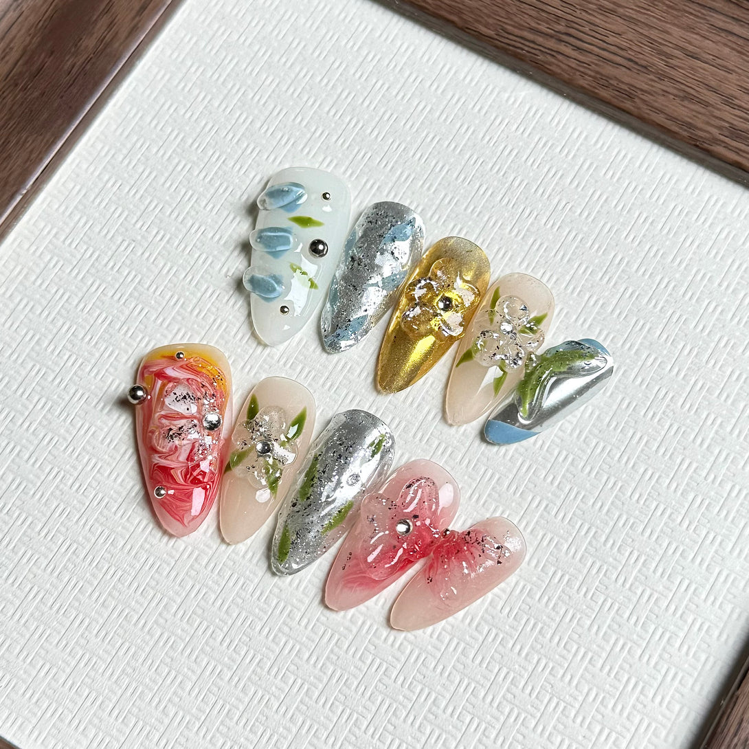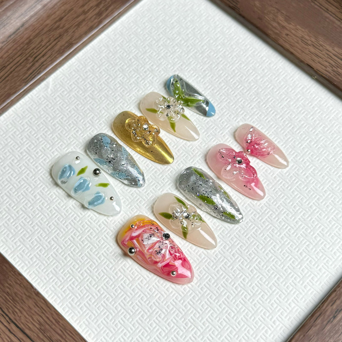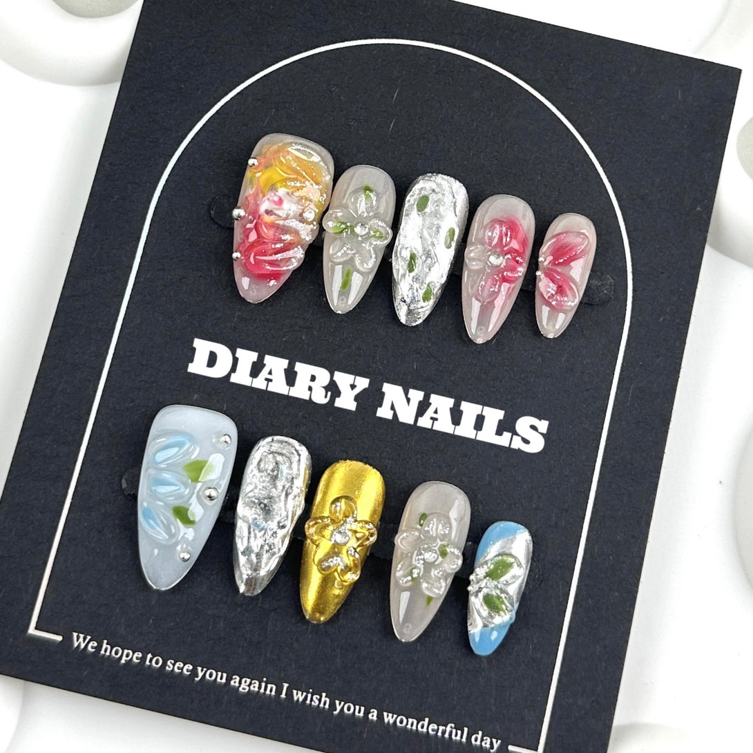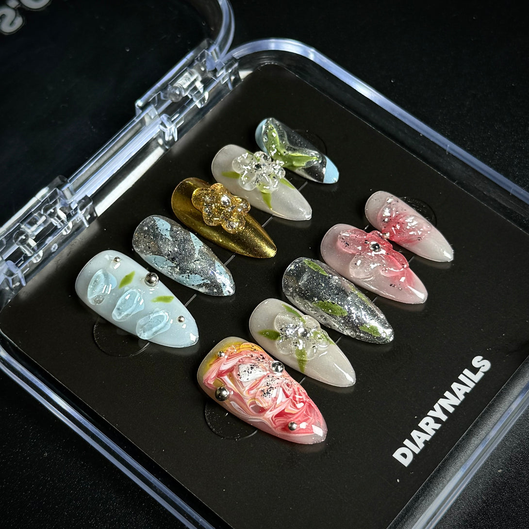 Lychee Soda by Diary Nails is a set of press-on nails showcases a stunning array of 3D floral designs, bringing a garden-inspired elegance to your fingertips. Each nail is a piece of art, featuring intricately sculpted flowers with a mix of lustrous finishes from shimmering metallics to translucent glazes. Accents like tiny beads and glittering crystals enhance the texture and depth, making each nail uniquely captivating. Perfect for those who love a touch of nature’s charm with a luxurious twist.