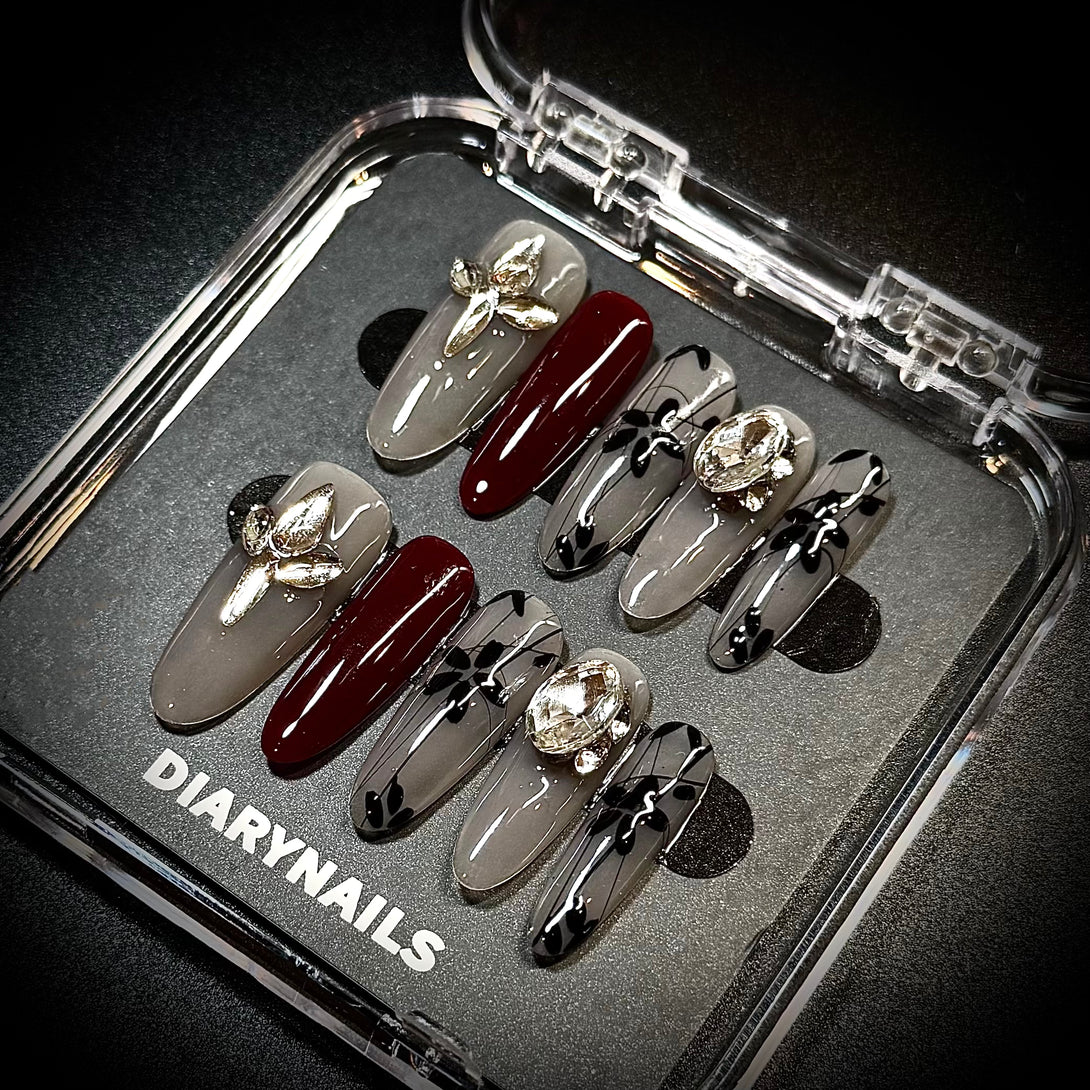Maple Leaf Song by Diary Nails is a refined set of press-on nails that combines elegance and boldness with hand-painted maple leaf designs and deep burgundy accents. This set is elevated with large, brilliant rhinestone embellishments, creating a striking balance between delicate artistry and high-end glam. The neutral beige base serves as the perfect backdrop for the intricate maple leaf patterns, while the rich burgundy nails add depth and drama. Perfect for any special occasion.