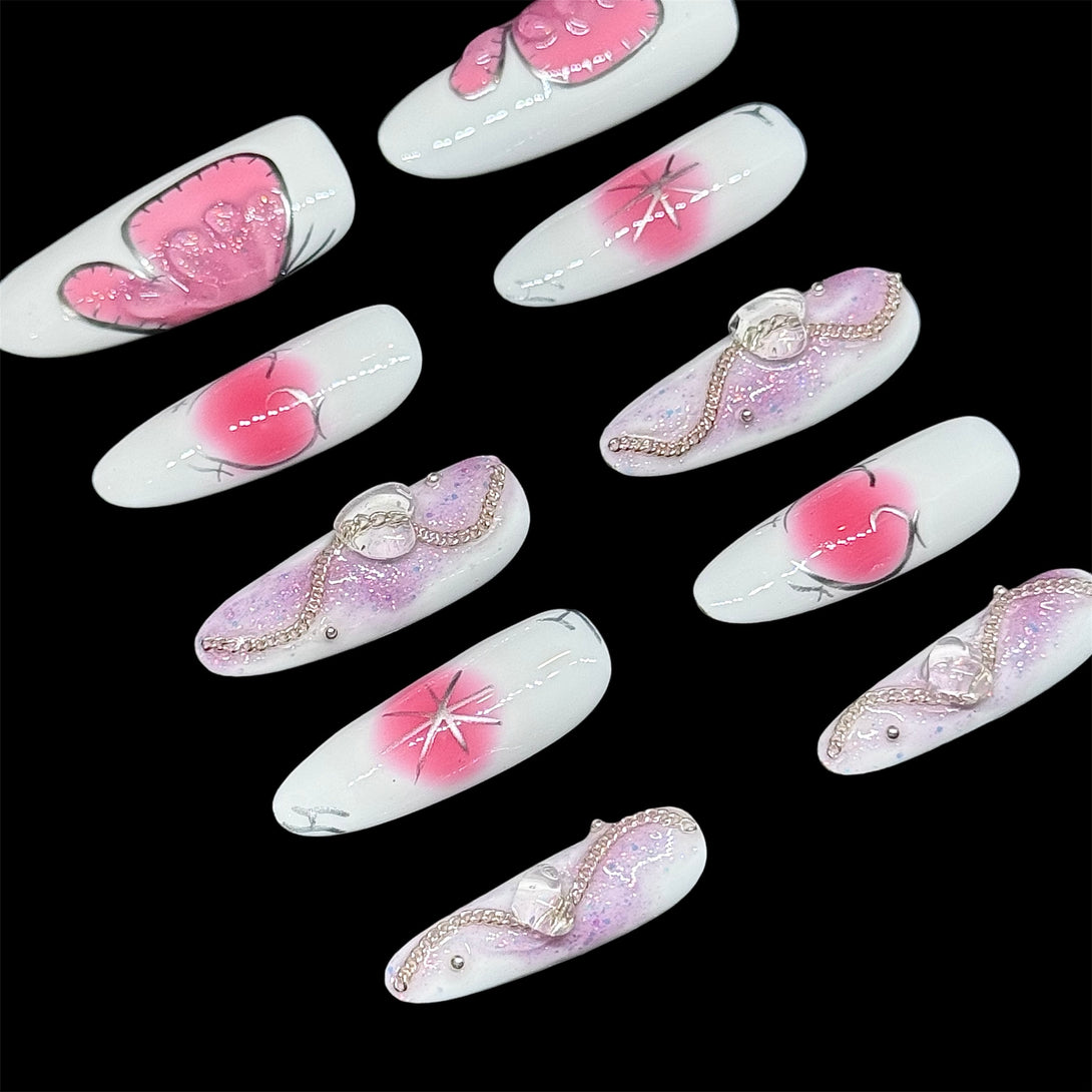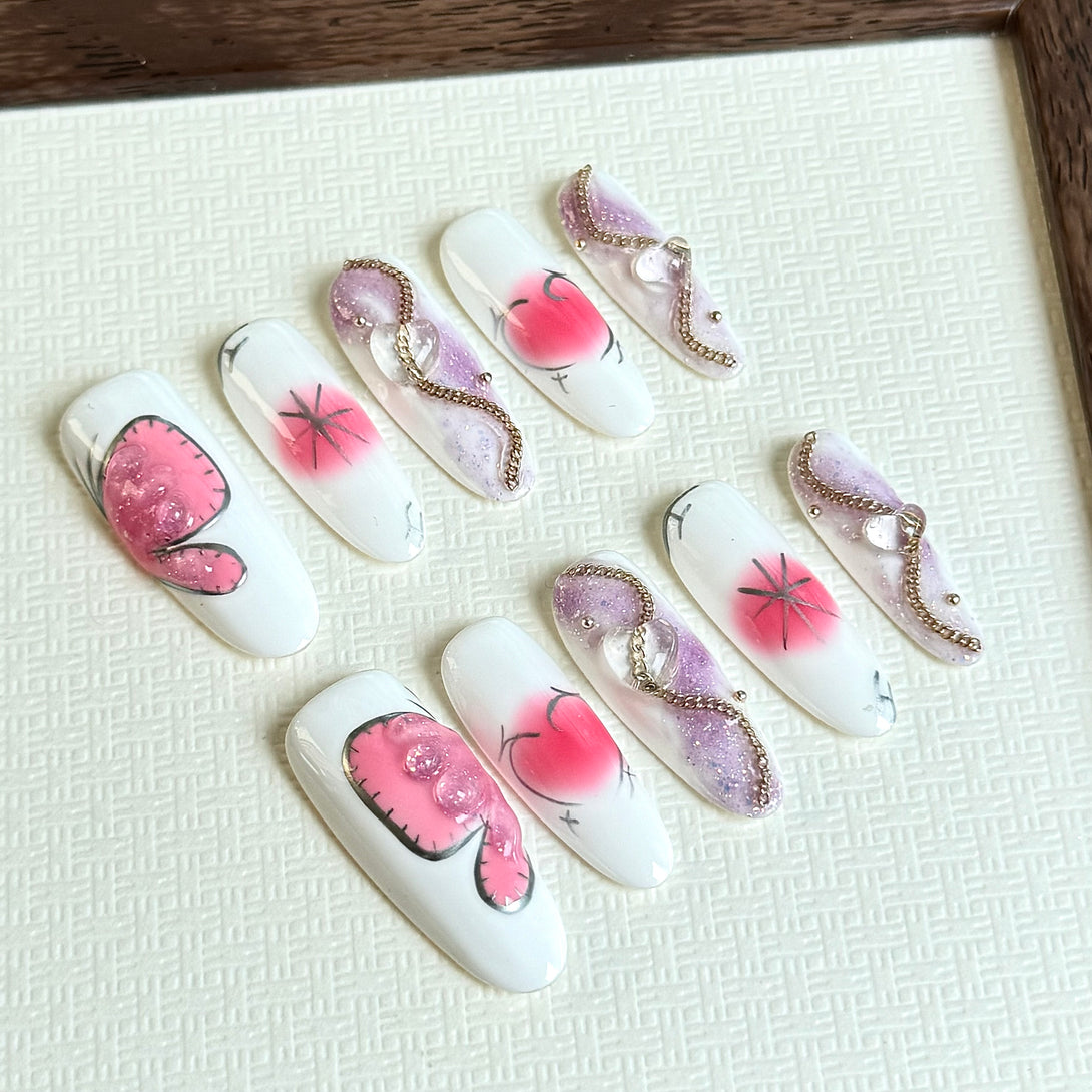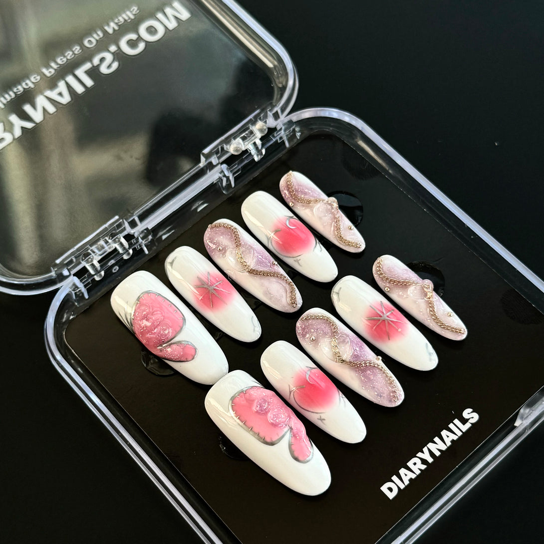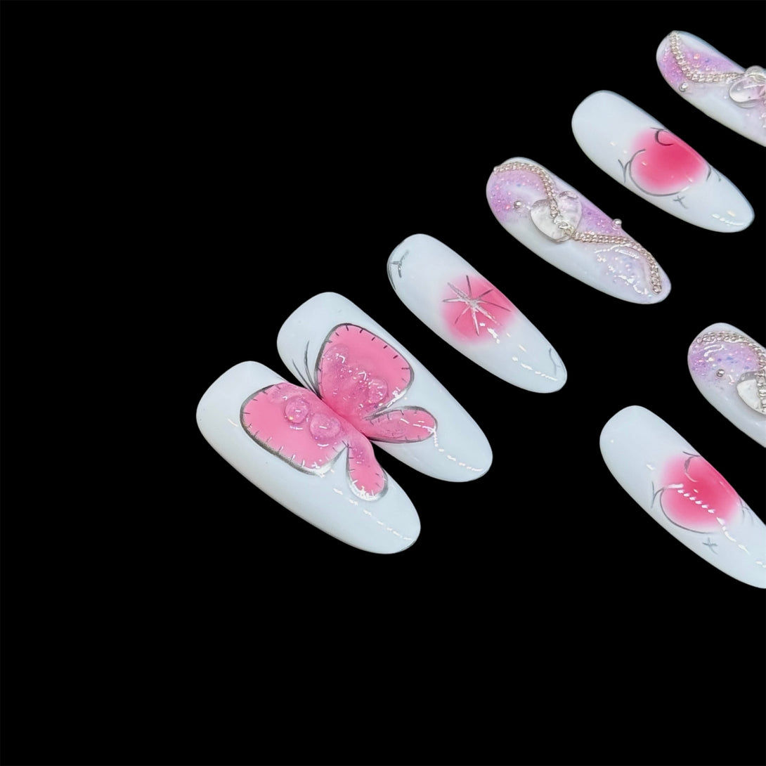 Petal Murmur by Diary Nails is a set of press-on nails features a unique butterfly patchwork design, accentuated by 3D gel water droplets and delicate chain embellishments. The soft gradient from pink to white gives a dreamy, ethereal feel, while the intricate details add a touch of sophistication. Perfect for those looking to add a whimsical yet elegant statement to their look, these nails are ideal for special occasions or everyday wear with a twist of charm.