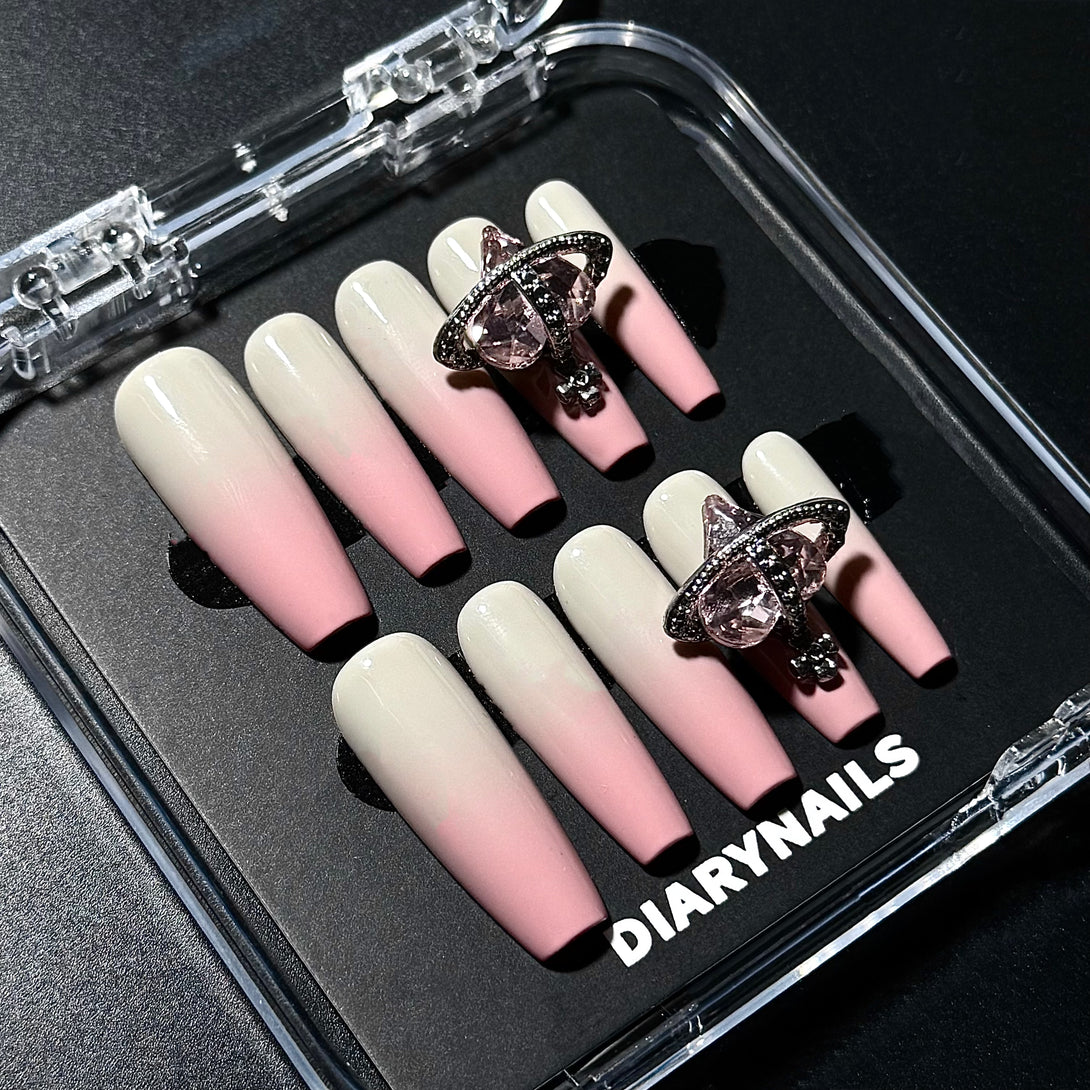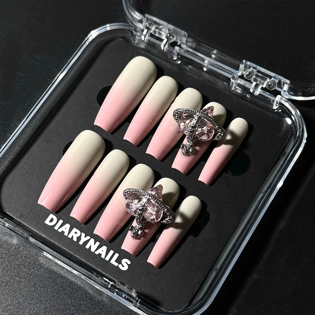 Roche Limit by Diary Nails is a set of Pink Gradient Press-On Nails with 3D Planetary Accents! This set features a soft pink-to-white ombre design, perfect for an elegant and feminine look. Adorned with eye-catching 3D planet-shaped decorations, encrusted with sparkling rhinestones, these nails add a touch of celestial glamour. Ideal for a chic, modern style. Perfect for special occasions or daily wear.