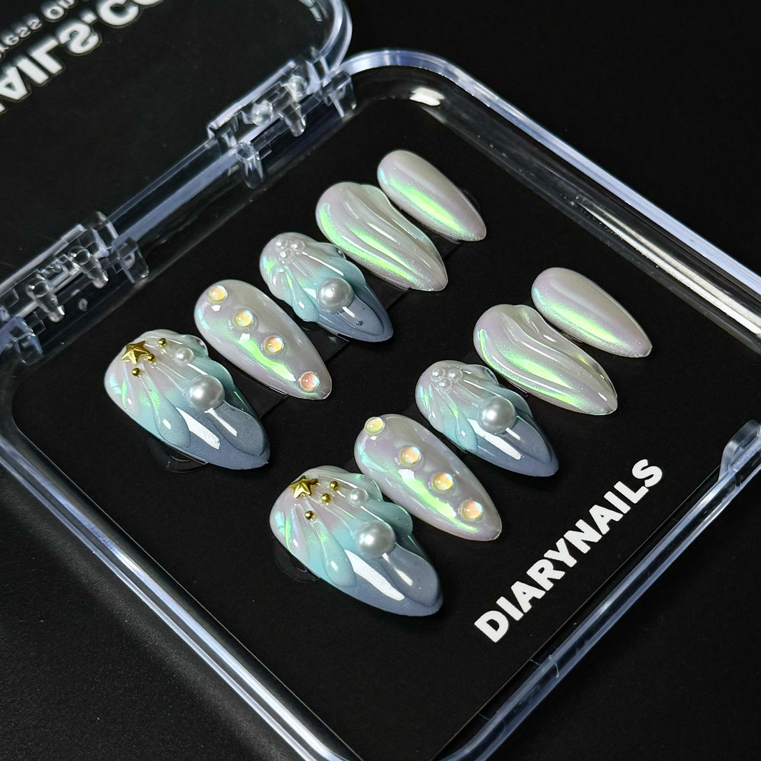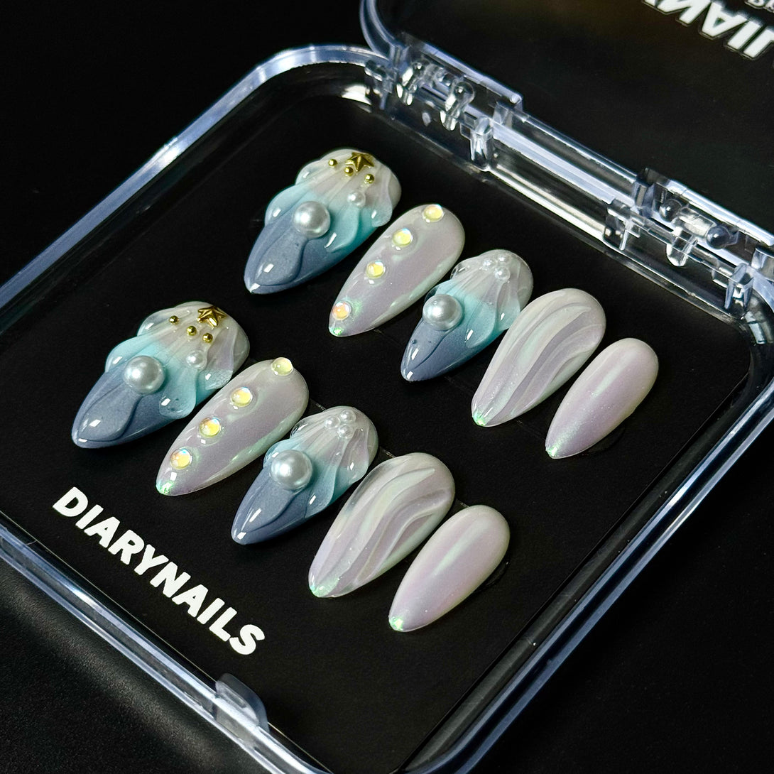Sea Salt Soda by Diary Nails is a set of press-on nails features an ocean-inspired design with a shimmering laser-like glow, enhanced by 3D water droplets and pearl accents. The blue-to-silver gradient gives a serene, aquatic vibe, while the intricate starfish detail adds a touch of marine elegance. Perfect for those seeking a unique and ethereal look that reflects the beauty of the sea, this set is ideal for beach outings or any occasion where you want to shine with oceanic charm.
