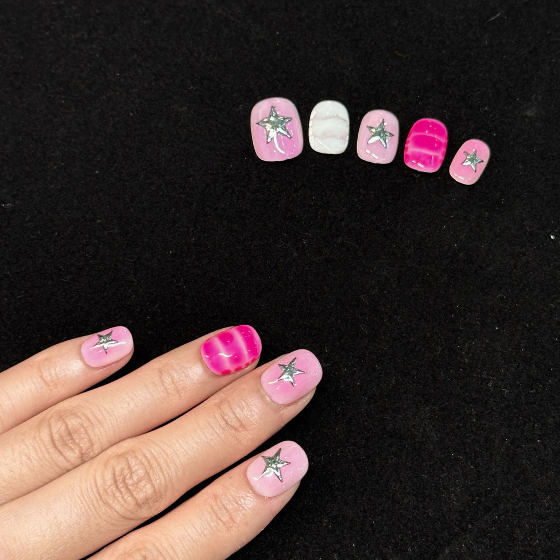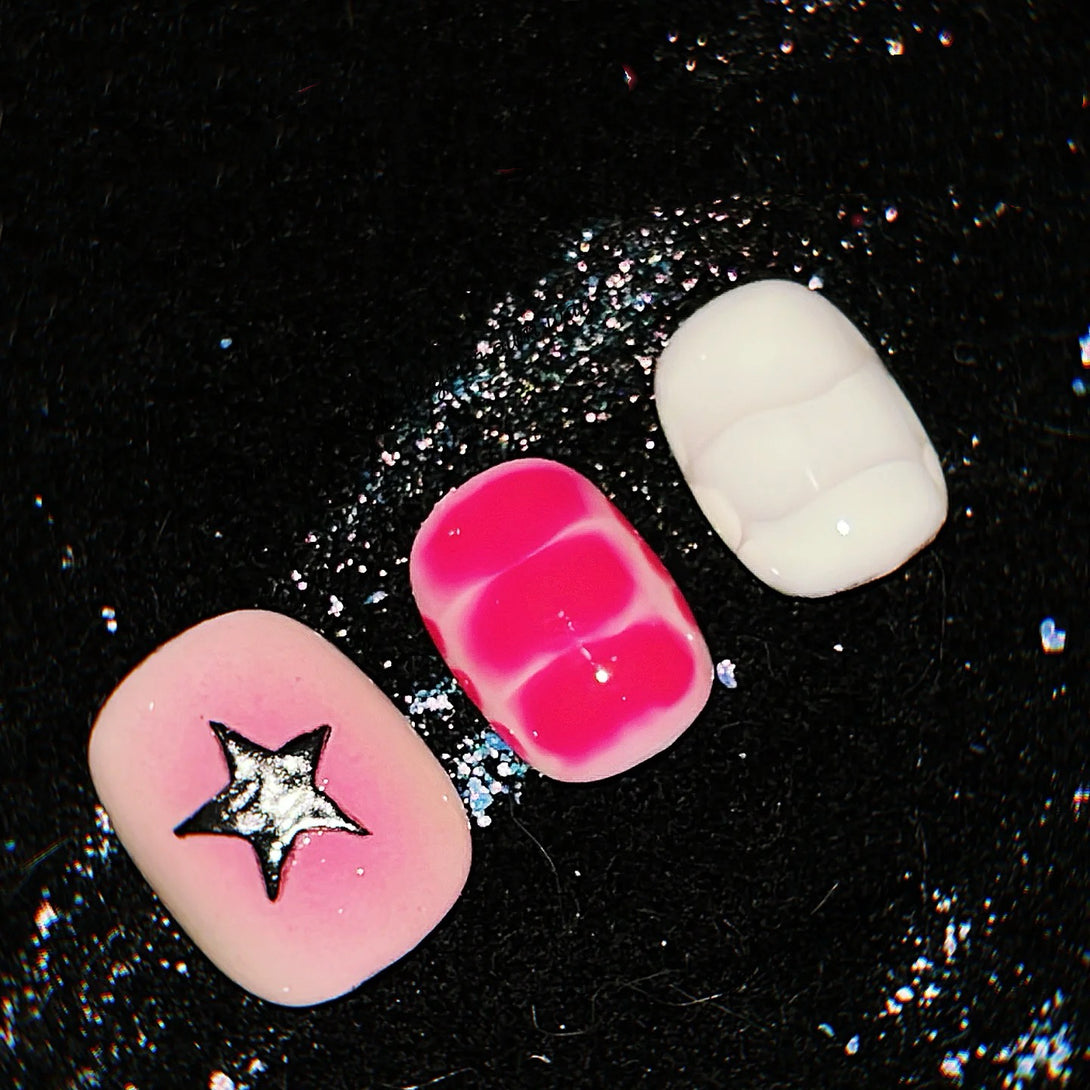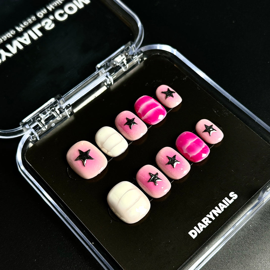 Star Feather Pinky by Diary Nails is a bold and stylish statement with this beautiful press-on nail set. Featuring a stunning gradient transition from white to pink, these nails are adorned with silver star embellishments that add a fun, eye-catching touch. The soft, ombre effect gives these nails a chic and trendy look, perfect for any occasion—from casual outings to special events.