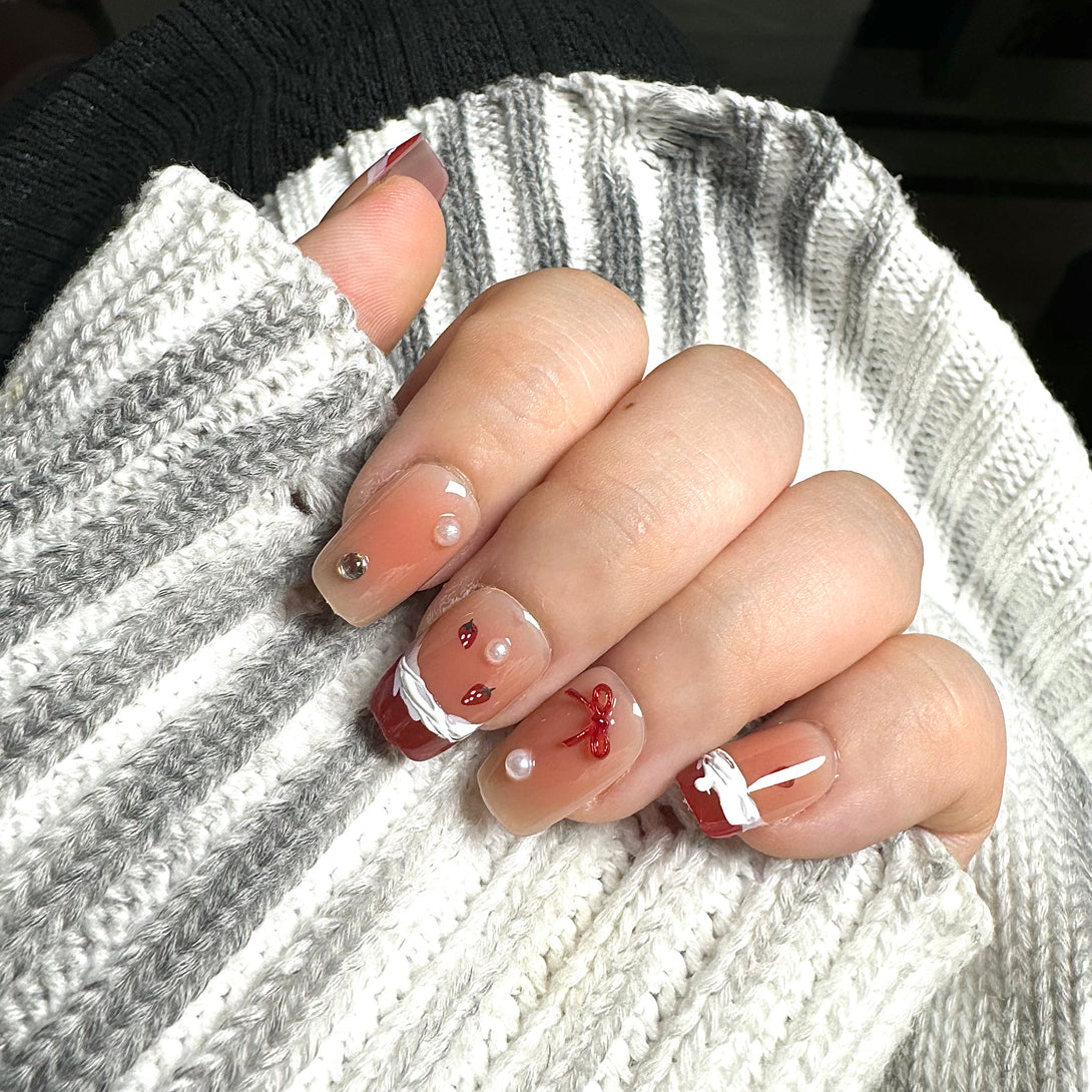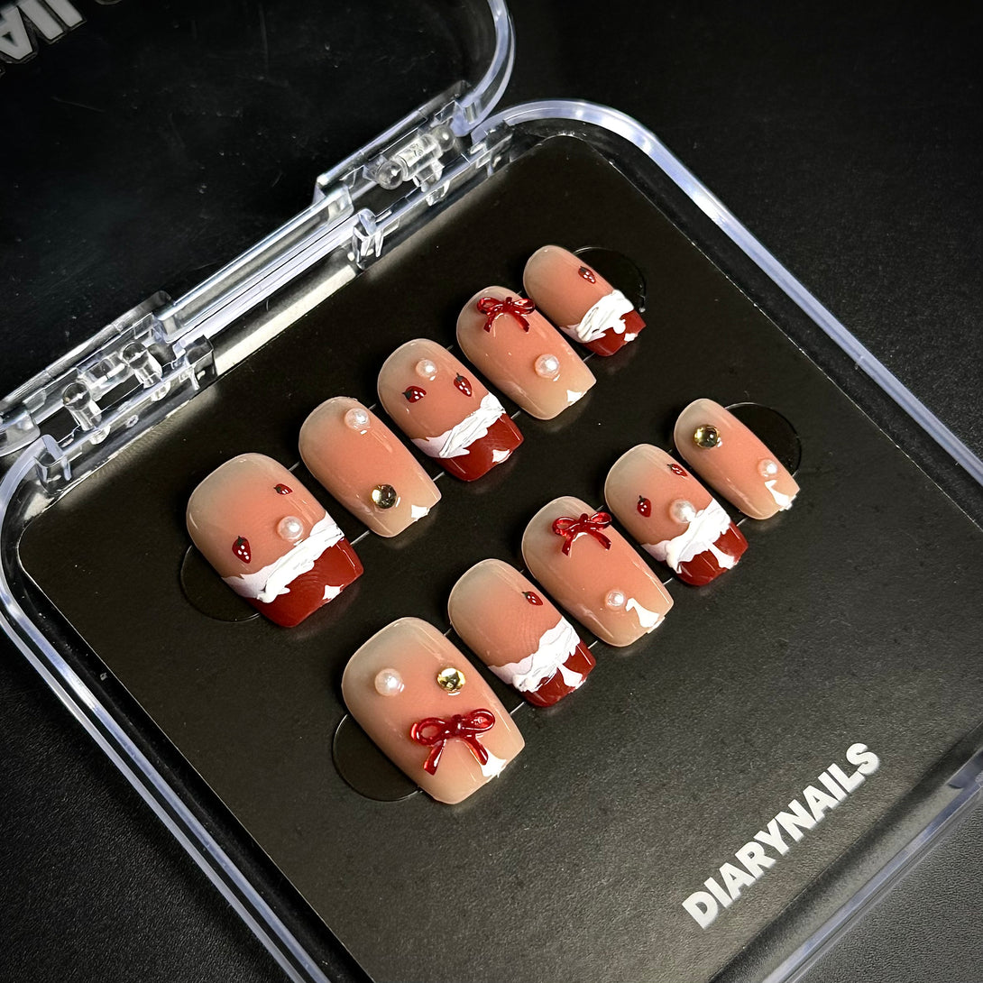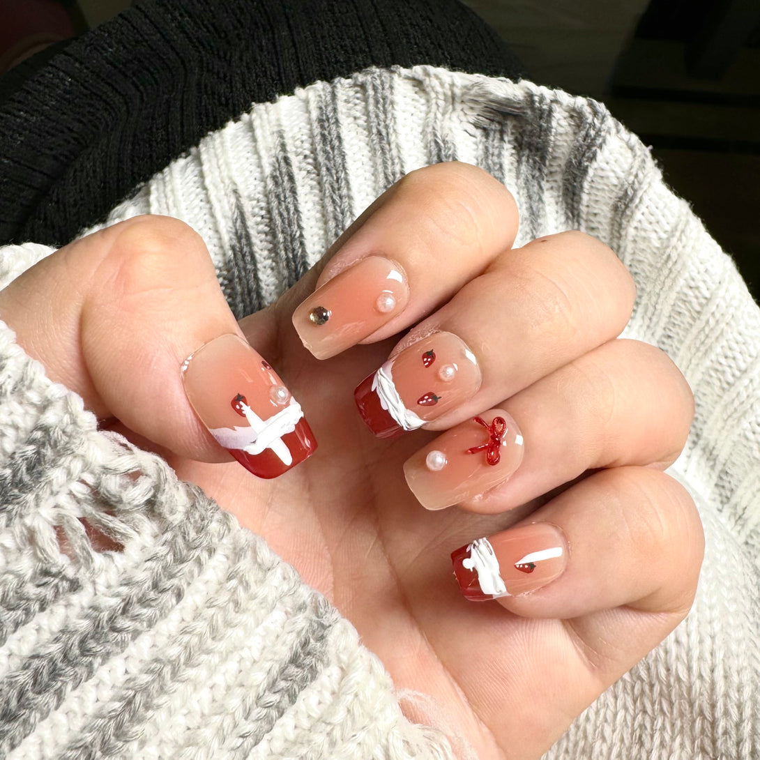 Strawberry Smoothie by Diary Nails is a set of red French-style Christmas-themed press-on nails featuring delicate pearls and 3D frosted details for a chic and festive look. A bold and timeless red French tip style paired with neutral undertones. Textured snowy frost details add a unique and seasonal touch. Adorned with pearls, bows, and metallic accents for a luxurious finish. This design is ideal for festive gatherings, holiday parties, or whenever you want to make a statement with your nails. Add a touch of elegance and glamour to your look this season!