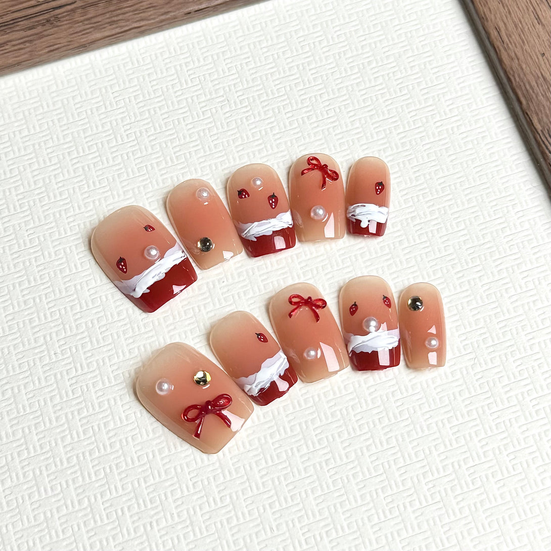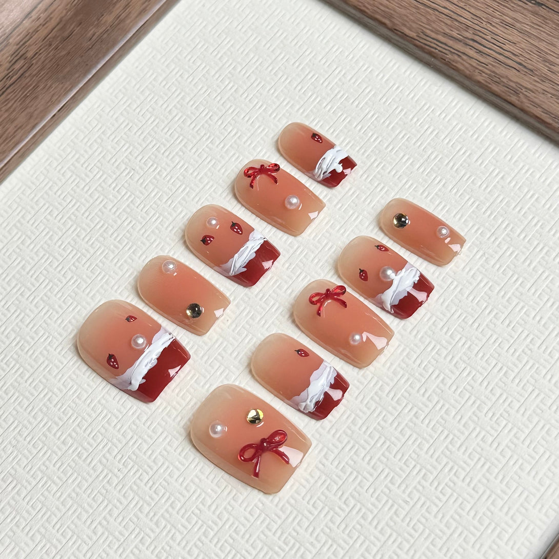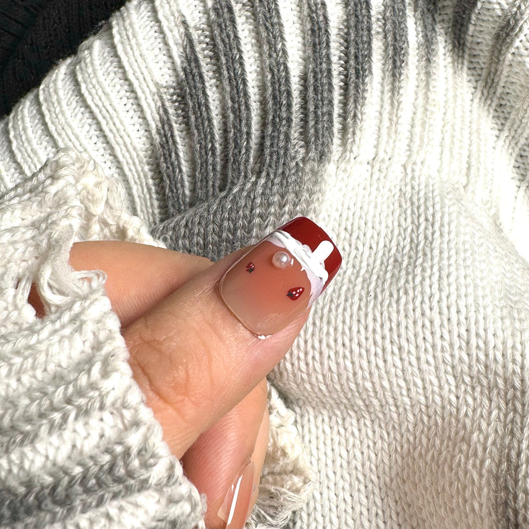 Strawberry Smoothie by Diary Nails is a set of red French-style Christmas-themed press-on nails featuring delicate pearls and 3D frosted details for a chic and festive look. A bold and timeless red French tip style paired with neutral undertones. Textured snowy frost details add a unique and seasonal touch. Adorned with pearls, bows, and metallic accents for a luxurious finish. This design is ideal for festive gatherings, holiday parties, or whenever you want to make a statement with your nails. Add a touch of elegance and glamour to your look this season!