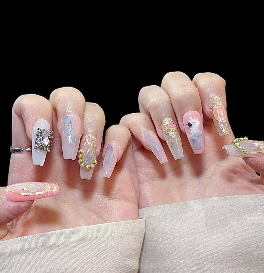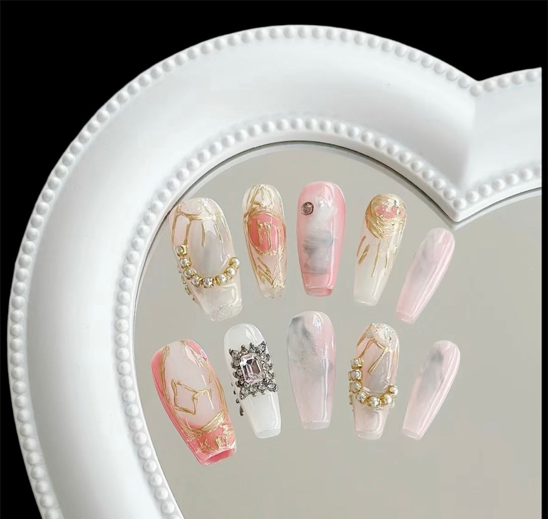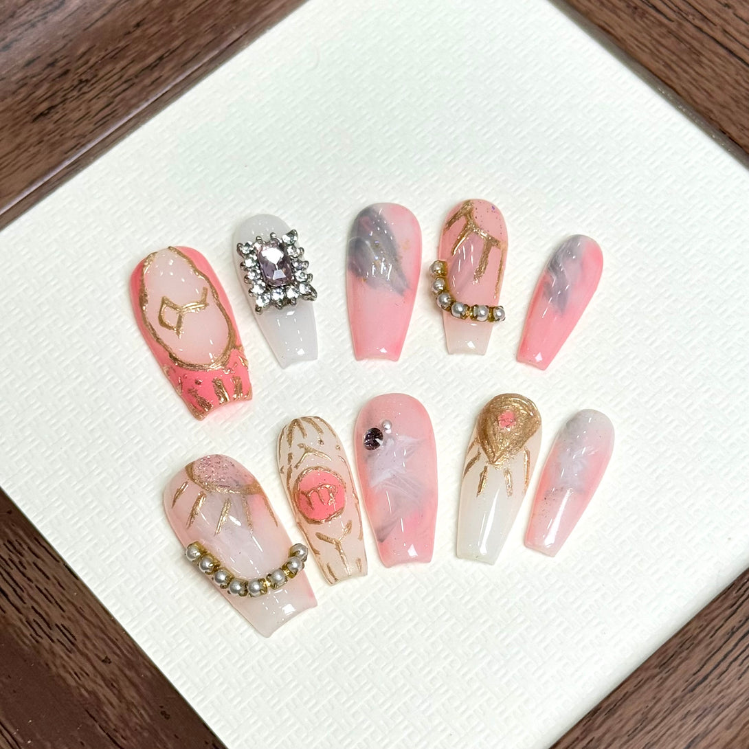 Virgo by Diary Nails is a set of press-on nails designed with a soft blend of pastel pink and dark pink tones, representing Virgo’s elegance and attention to detail. The nails feature delicate gold zodiac motifs and intricate celestial designs, symbolizing the grounded yet ethereal nature of the sign. Adorned with pearls, rhinestones, and subtle 3D accents, these nails create a perfect balance between sophistication and understated beauty. Ideal for those who appreciate craftsmanship and timeless style, these nails celebrate Virgo's meticulous and graceful essence.